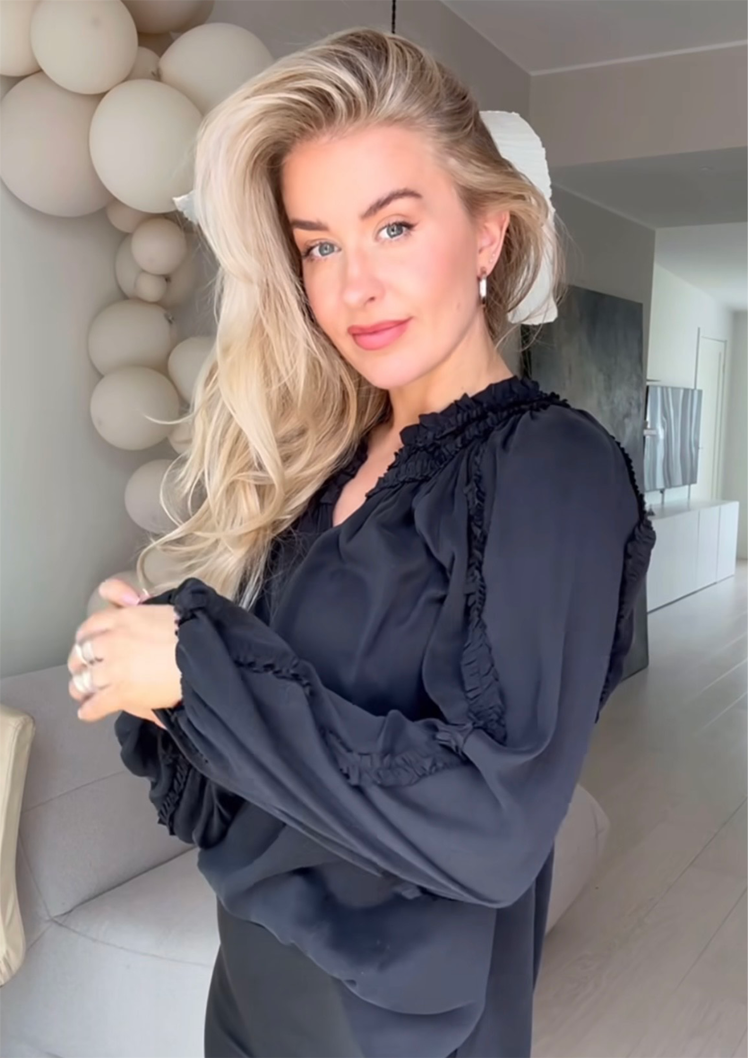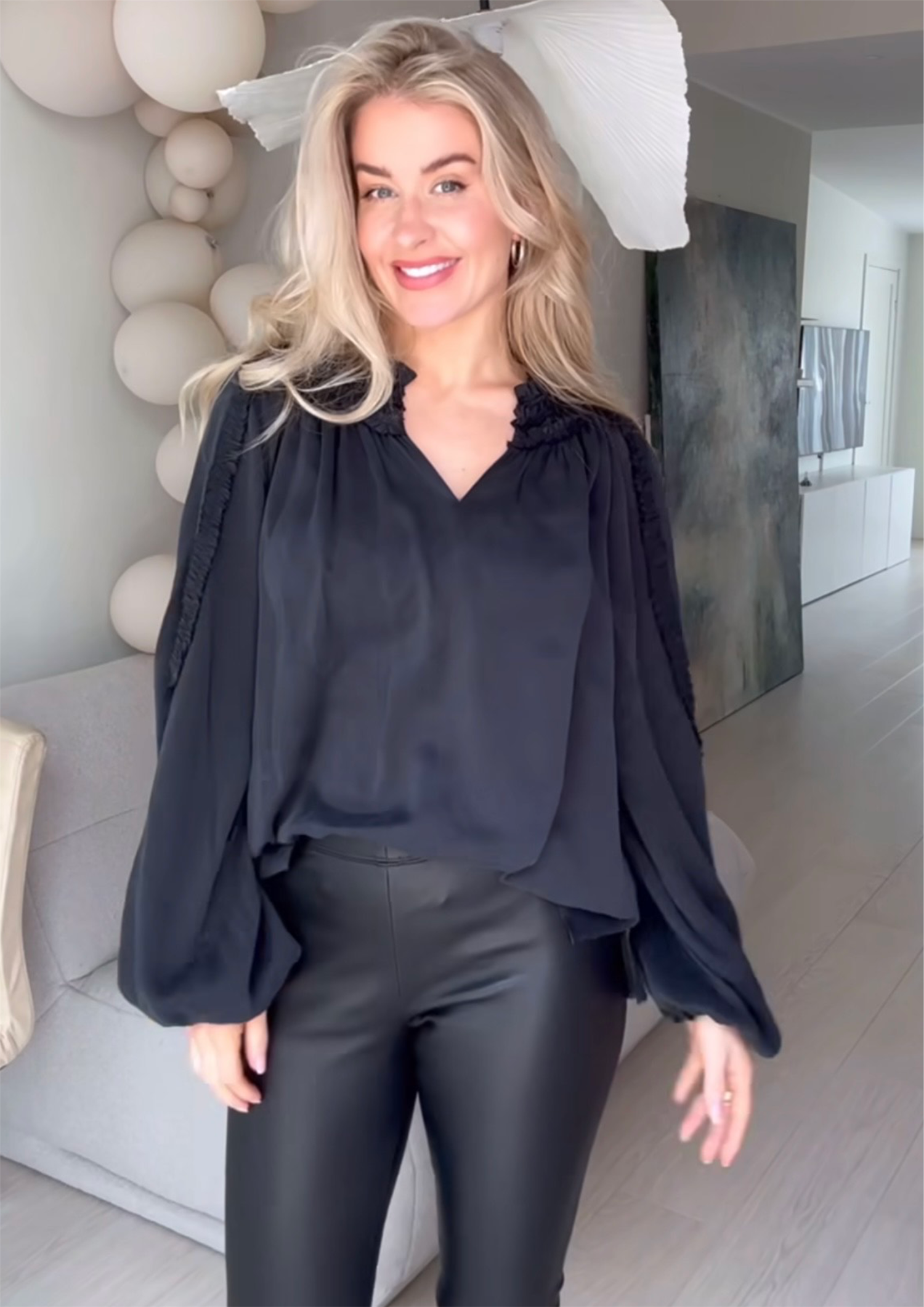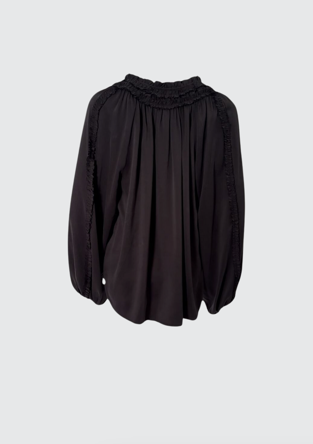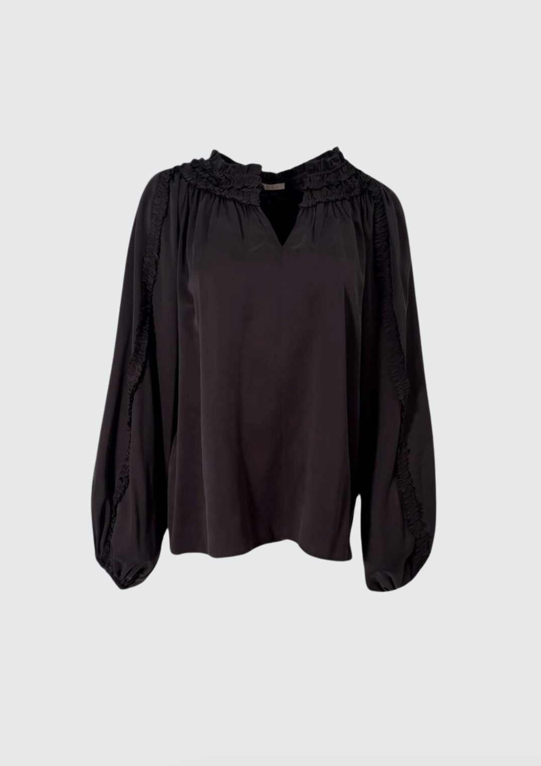 Beskrivelse: Holly Silkebluse fra Amuse. Lange voluminøse ermer som avsluttes med strikk. Rund hals med en knapp i front. Rysjedetaljer rundt hals, og ned langs ermene. I sort steinvasket silkekvalitet. Style til eksempel med 'Mina Leather Pants' som modellen har på seg, for en kul og høstlig look!