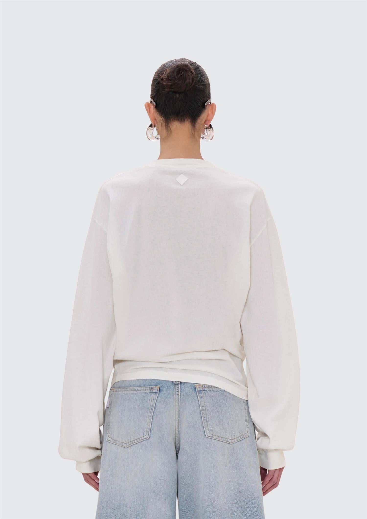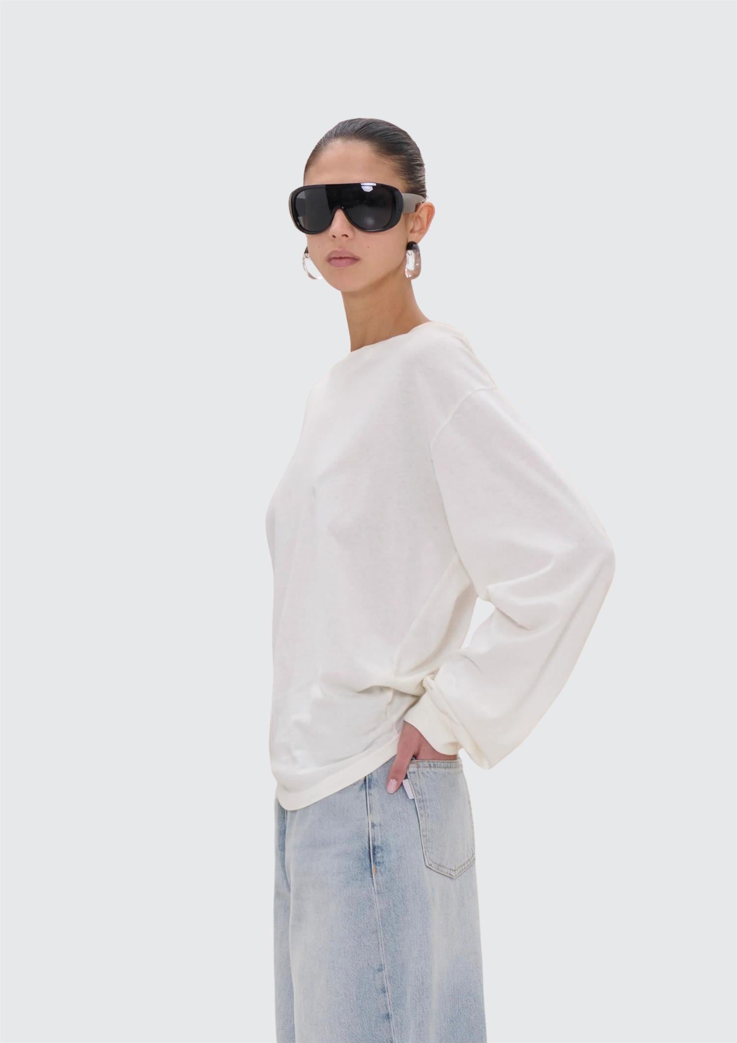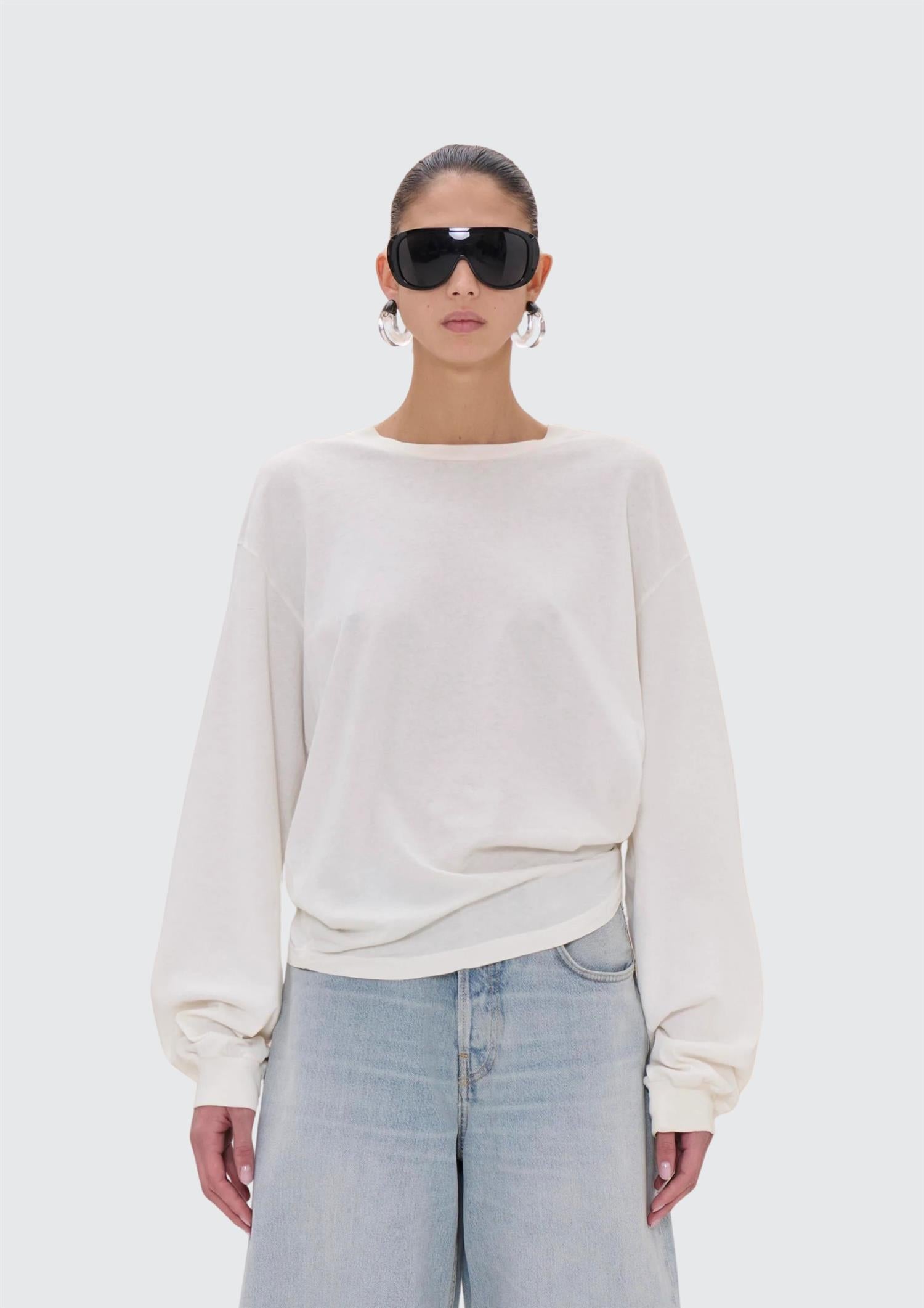 BESKRIVELSE: En langermet t-skjorte med myk drapering i siden som gir et flatterende og litt mer gjennomført uttrykk. Den har en avslappet passform med rund hals og lange ermer, og sitter lett og behagelig på kroppen. Draperingen i siden skaper en fin fasong og gir plagget det lille ekstra – uten at det føles overpyntet.
