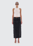 Den rå, avklipte kanten og synlige frynser langs sømmer og paneler gir et bevisst, dekonstruert uttrykk som skiller seg ut. Den grå/sorte denimvasken tilfører en tøff kontrast og gjør skjørtet enkelt å style – enten med en enkel topp og hæler for en mer pyntet look, eller med sneakers og t-skjorte for en mer avslappet stil.