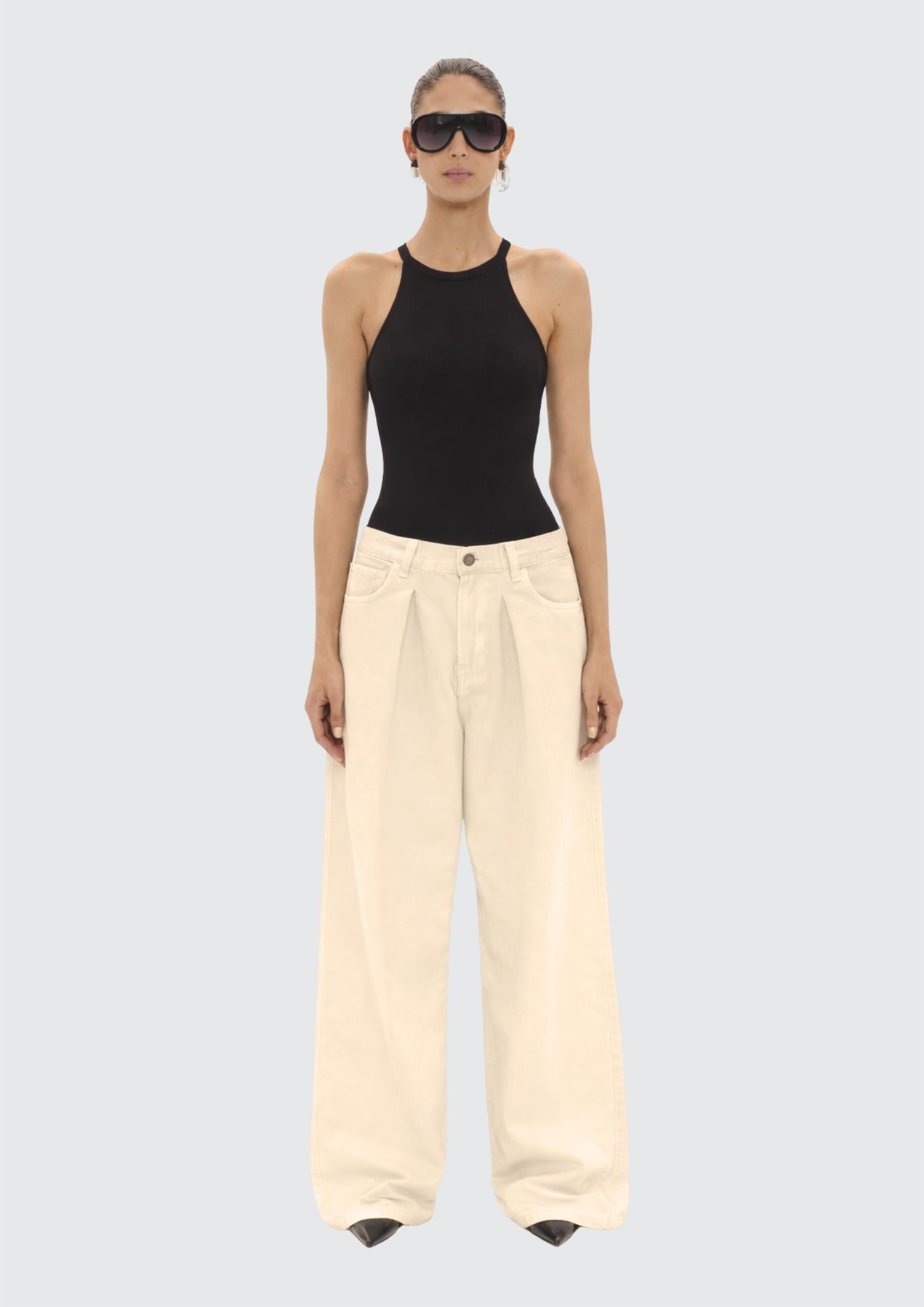 BESKRIVELSE: En avslappet og moderne bukse med vide ben og en ren, gjennomført silhuett. Modellen har middels høy midje med beltehemper, knappelukking og klassiske lommer i front som gir et subtilt denim-inspirert uttrykk.