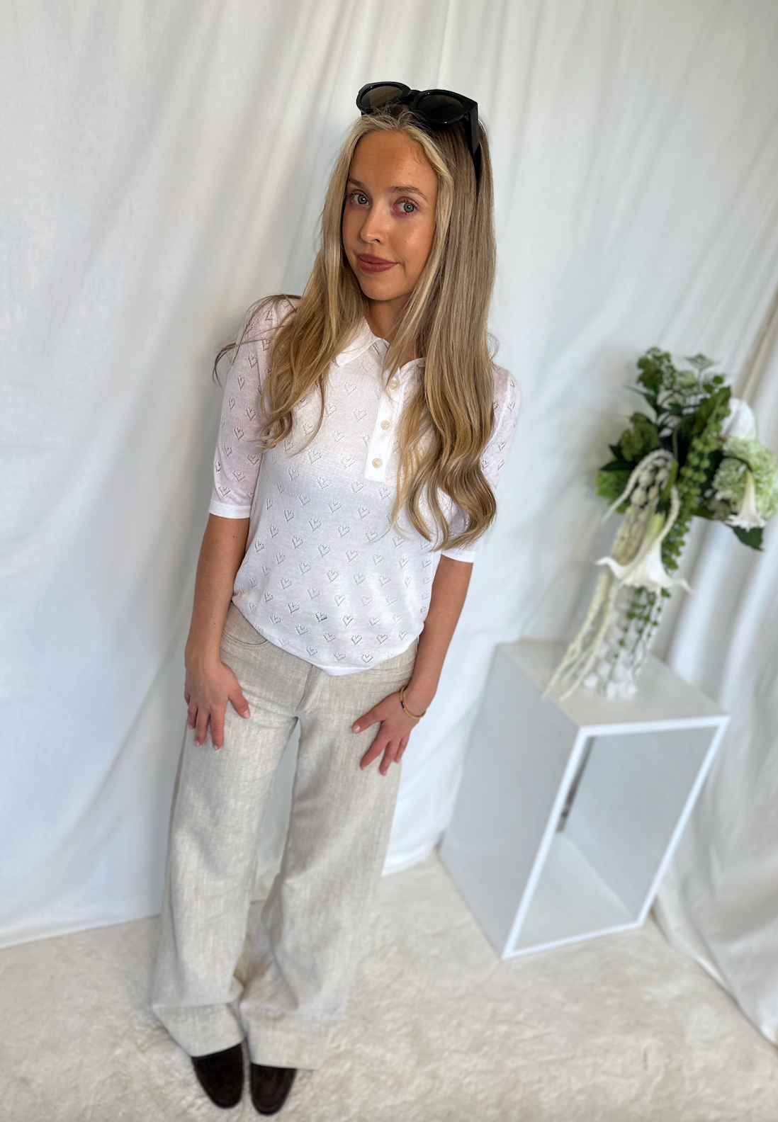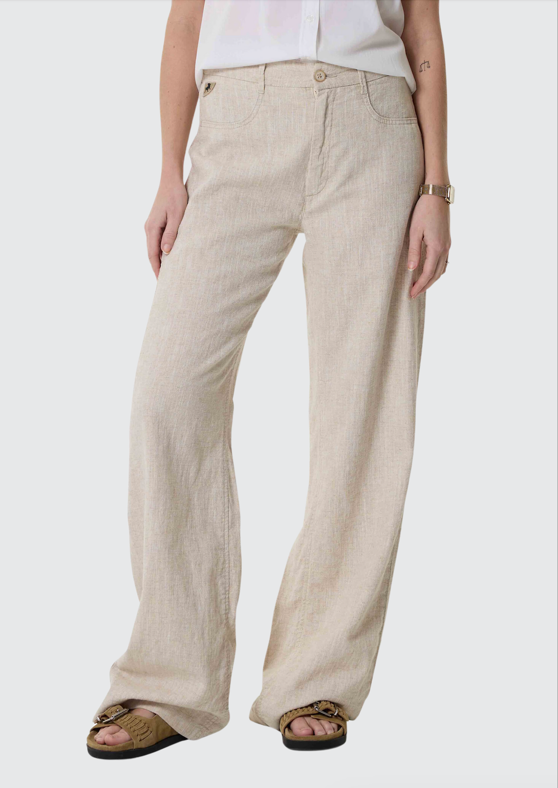 BESKRIVELSE: Rosa Clr Jeans Ecru Rinse er en lett og behagelig bukse fra Lois i en lin- og bomullmiks. Modellen er høy i livet og har beltehemper. Denne modellen har vide flared ben og spaltelommer foran. Flatterende modell uten lommer på baksiden. Benlengde 32".