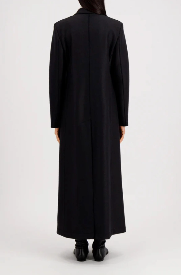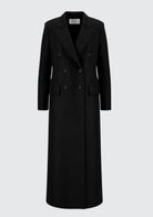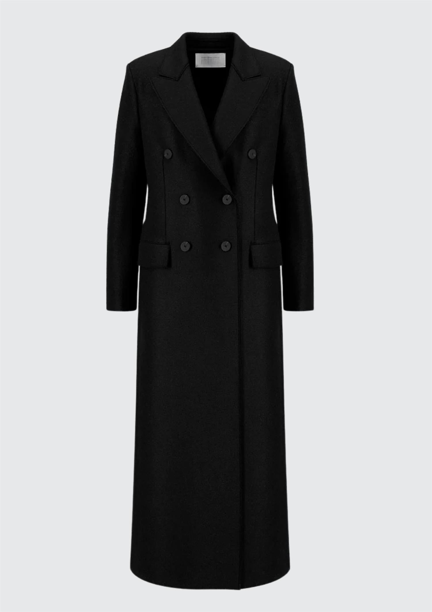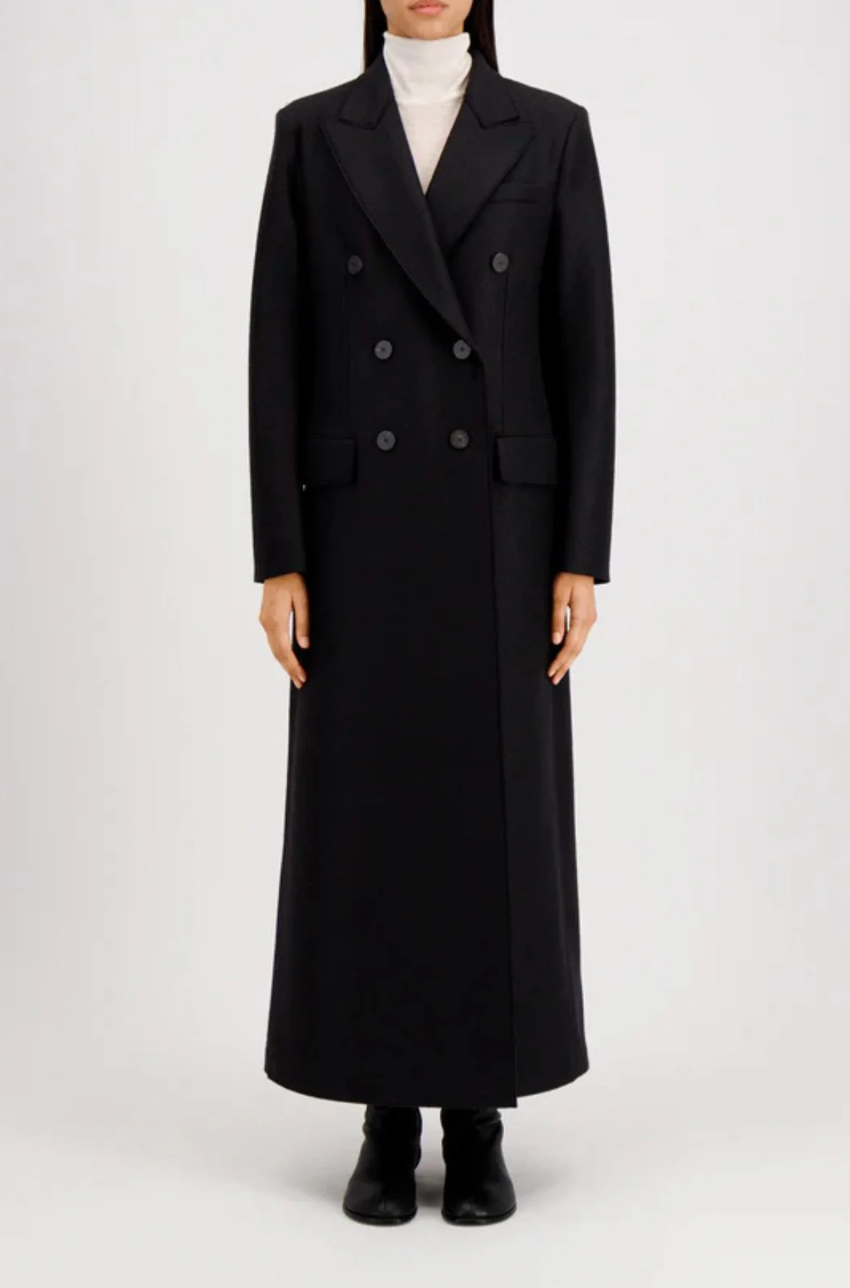 Beskrivelse: Lang dobbeltspent kåpe med skulderputer i strikket tovet ull. Kåpen har en figursydd form, tilpasset erme og et bredt jakkeslag med 6-knappers lukking og klafflommer. Råkant finish. Laget i Italia med italiensk stoff.