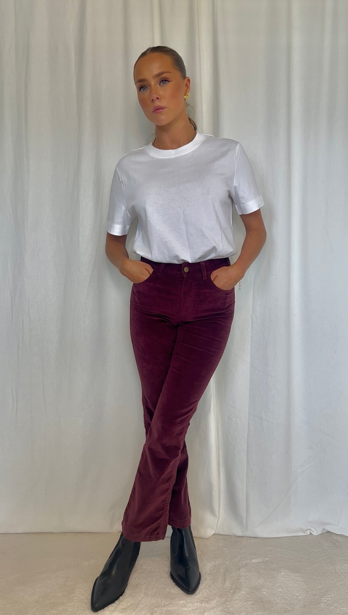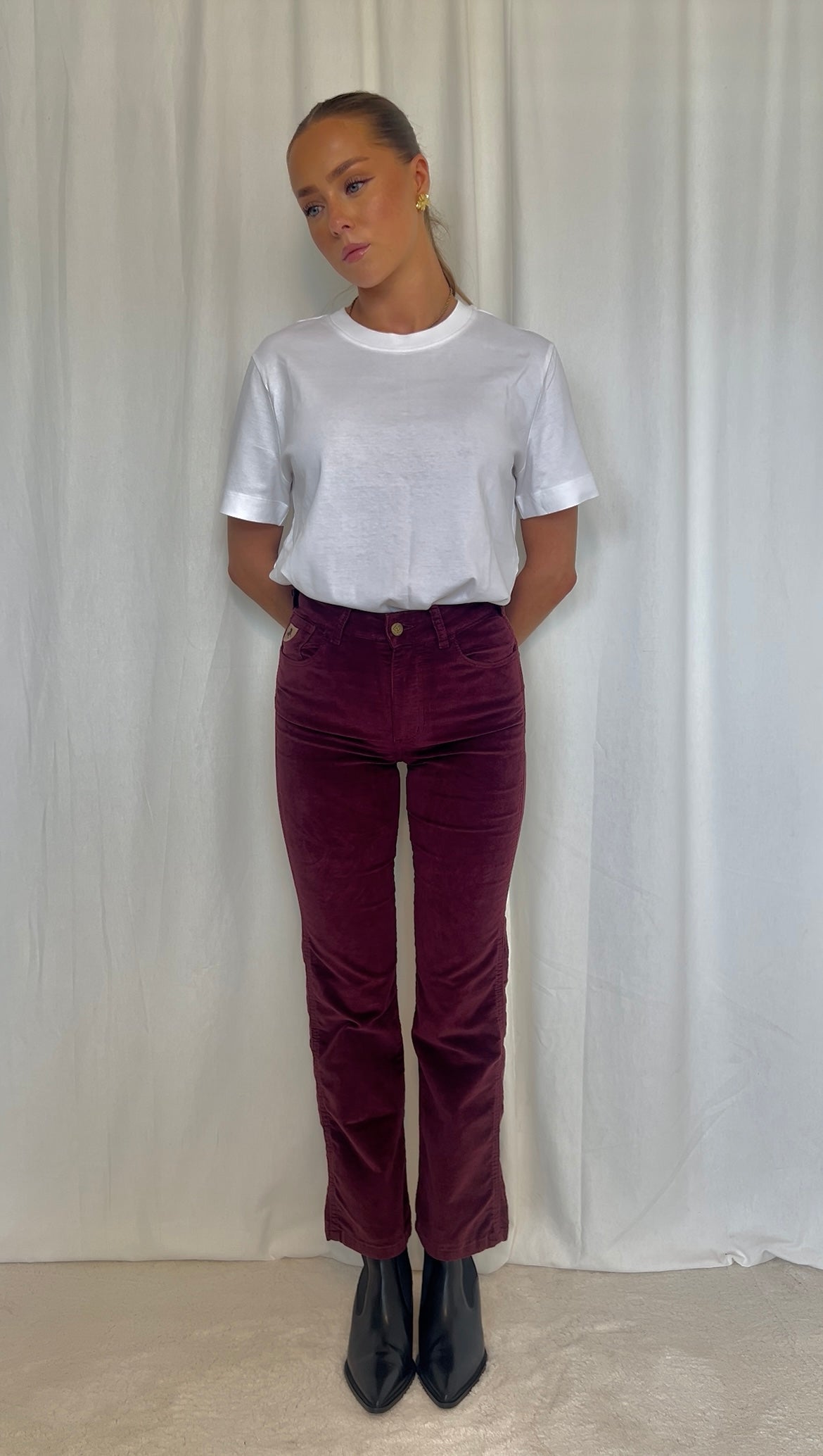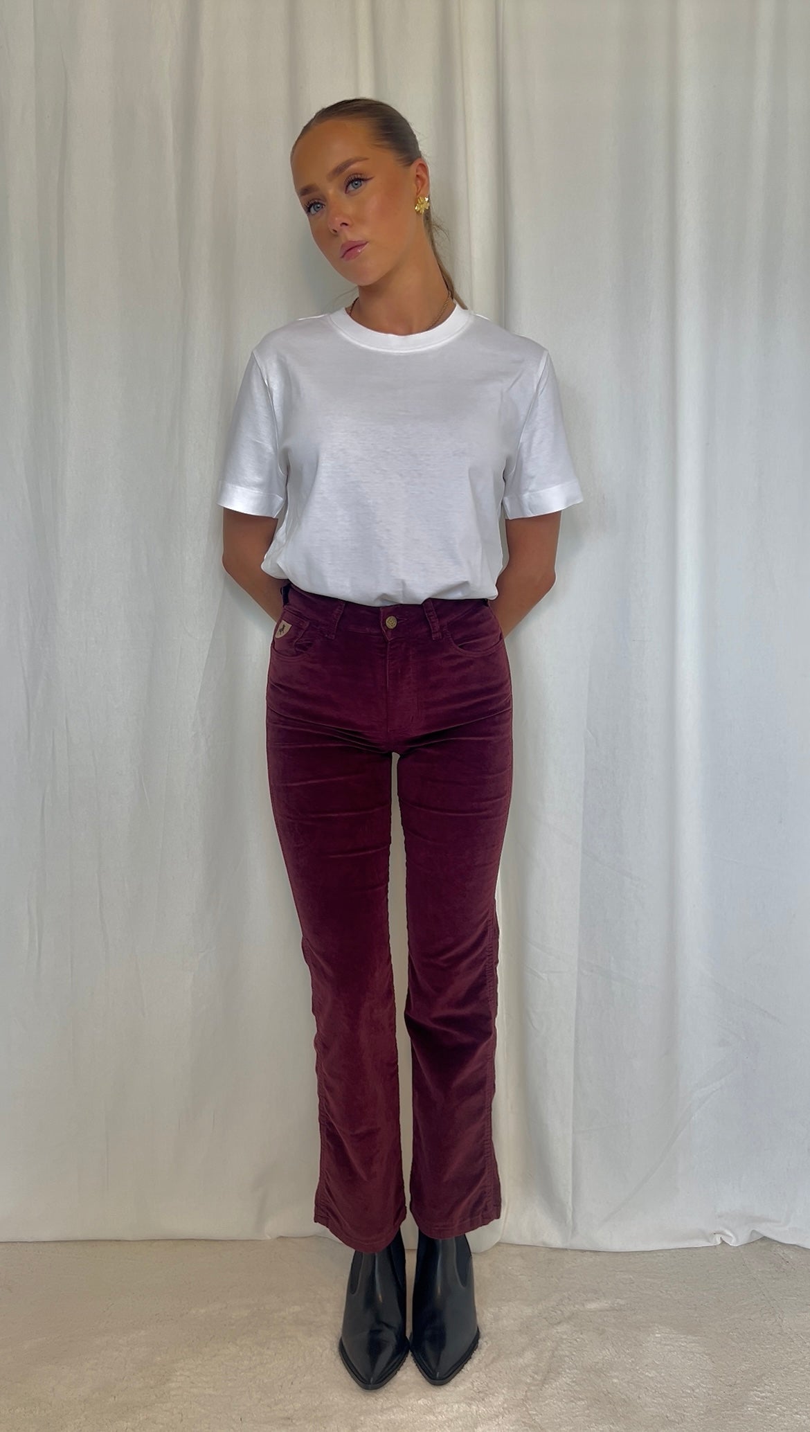 BESKRIVELSE: Malena har en komfortabel utforming med høyt liv og rette bein. I fargen cabernet. Dette er en cropped modell med god stretch. I mini-cord materiale med fem lommer, beltehemper og klassisk gylf og knapp.