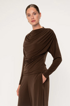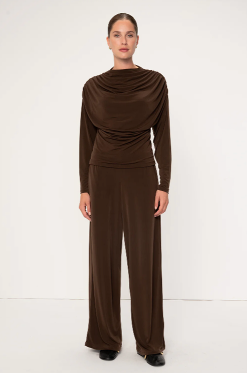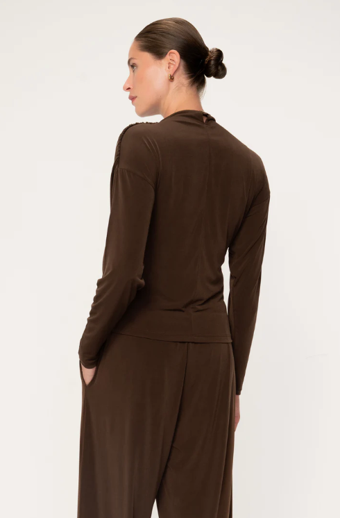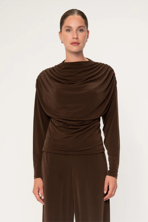 BESKRIVELSE: VIVEH Mirel-topp Langermet topp med middels høy polohals og myk drapering over halsen og brystet. Designet for å passe sømløst sammen med de matchende Zyra-buksene for et koordinert utseende.