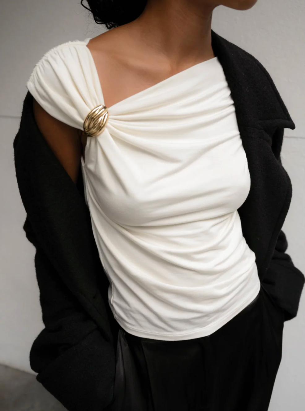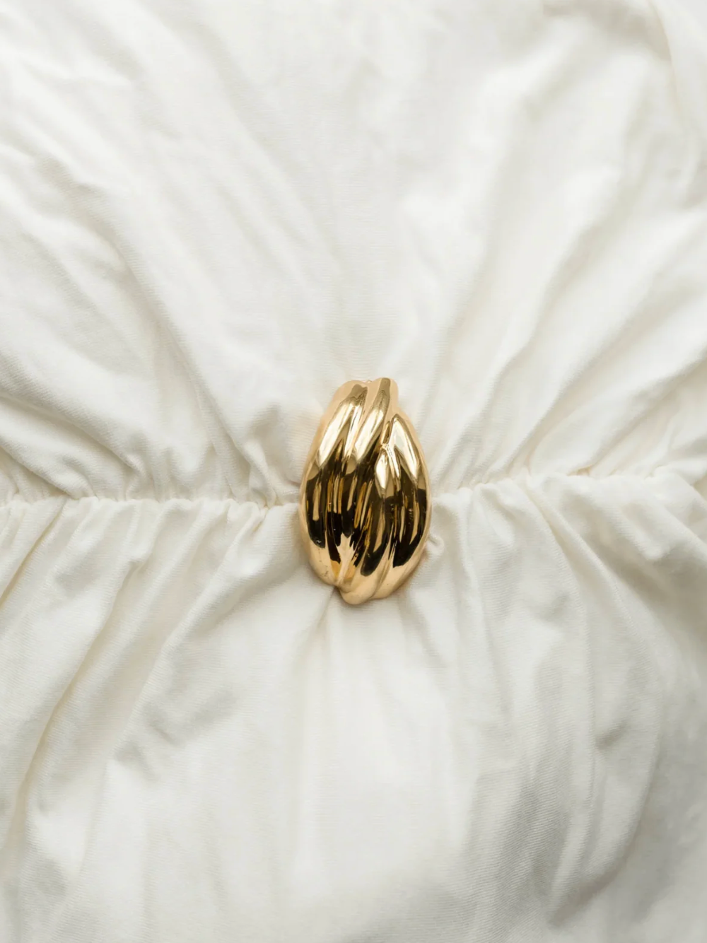BESKRIVELSE: Viveh Garment Clip er en premium brosje laget for å pryde de vakre toppene og kjolene fra Viveh. Brosjen er laget av rustfritt stål som er trukket med et lag av 14 karat gull, med en tidløs avrundet form. Pynt opp plagg med nålen eller samle stoffet for å lage en ekstra kul detalj.