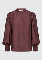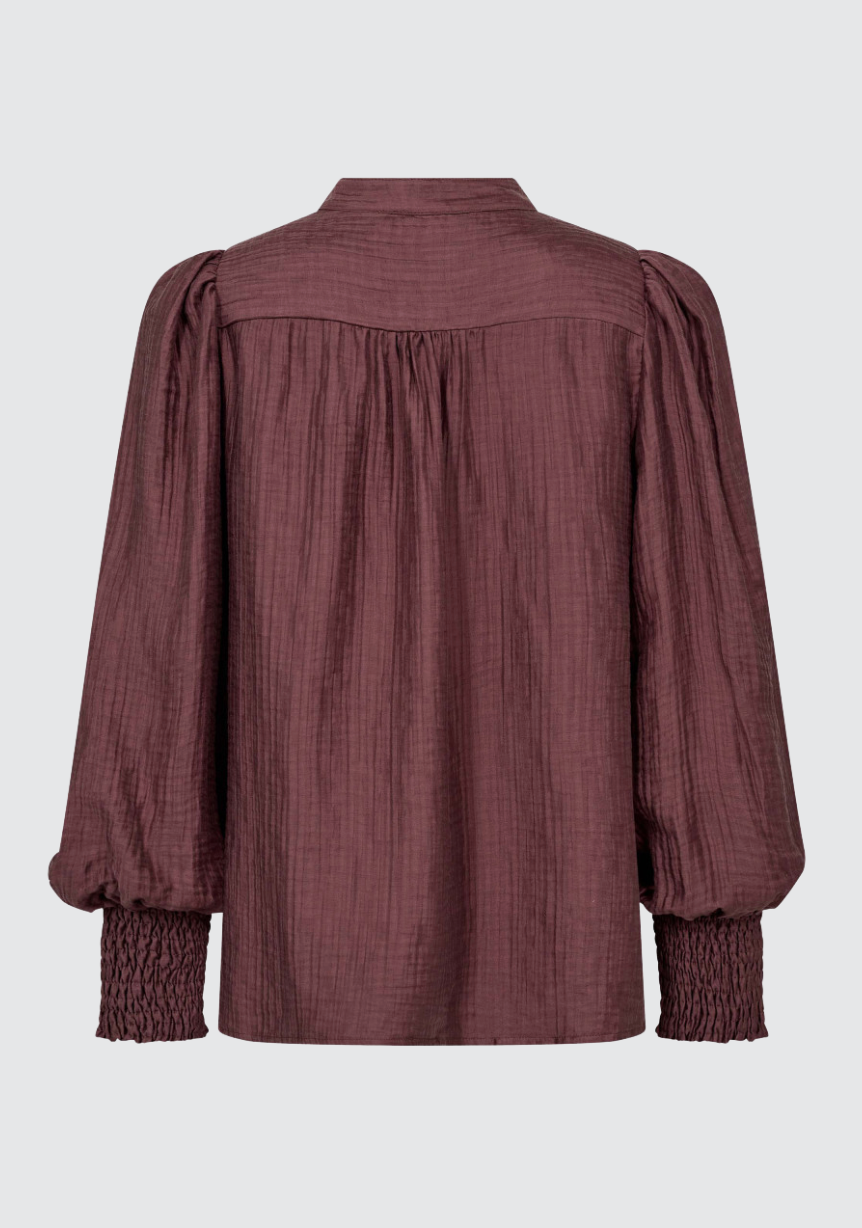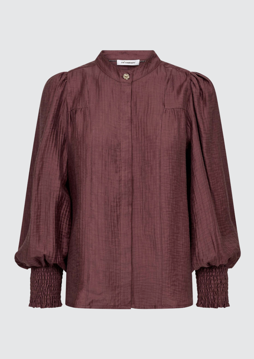 BESKRIVELSE: Tassycc Shirt fra Co´Couture. En elegant bluse i lett, glansfullt stoff med strukturert overflate. Blusen har ståkrage med dekorativ knapp, ballongermer med smockdetaljer ved mansjettene og skjult knappestolpe i front. Tassycc Shirt kombinerer feminine detaljer med en tidløs silhuett – perfekt både til jobb og middag.