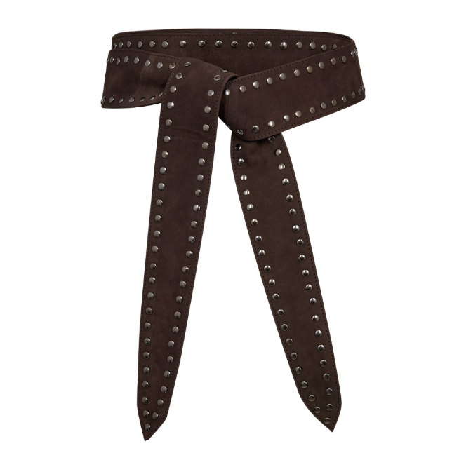 Beskrivelse: Semsket skinnbelte fra Co'Couture i mykt skinn med nagledekor. Avsmalnende i begge ender. Bredde 6 cm.