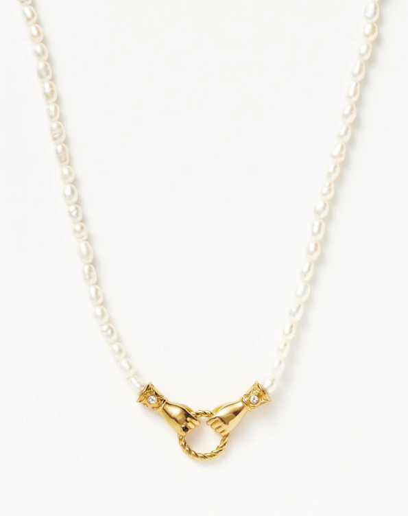 BESKRIVELSE: To georgiansk-inspirerte hender samles i dette anhenget, som hver holder en vridd ring. Hver mansjett er intrikat detaljert og er belyst med hvite perlekabochoner og har en ring med en svart onyks-edelsten. Frøperlekjedet er ferdig med kolleksjonens spesiallagde sommerfugl-anheng, et symbol på dualitet. Kombiner med In Good Hands perlearmbånd. Få et billigere pris når du kjøper det som et sett – det ikoniske In Good Hands-halskjedesettet.