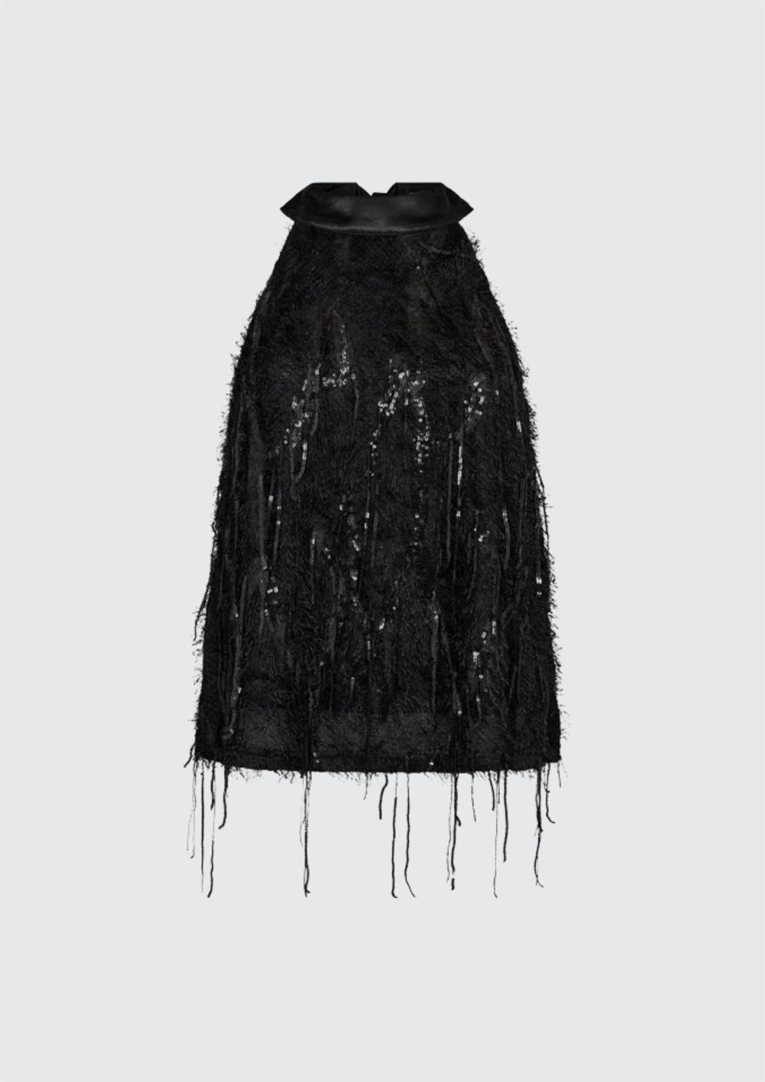 BESKRIVELSE: Silla Sequin Halter Top i svart fra Co'Couture er en festlig svart topp som umiddelbart gir et stilig inntrykk. Laget av 100 % polyester og dekket helt av skimrende paljetter som reflekterer lyset vakkert. Halterhalsen skaper et elegant og feminint utseende, perfekt for festlige anledninger.