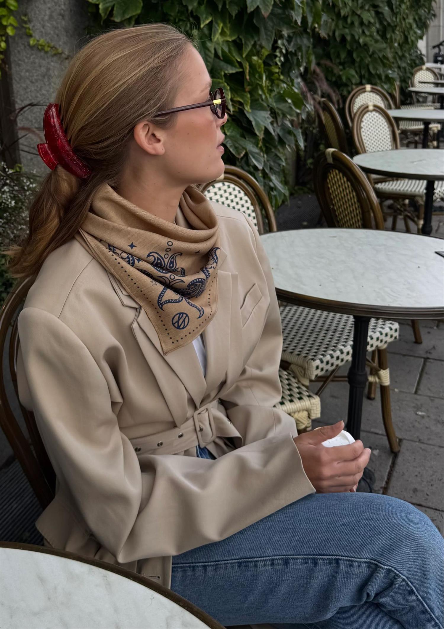 Med sine harmoniske mål på 65 x 65 cm er dette et klassisk pynteskjerf som kan styles på utallige måter – knyttet løst rundt halsen, brukt som hodepynt, festet på veskehanken eller drapert rundt håndleddet for et sofistikert preg. Det elegante mønsteret, nøye utviklet for å balansere moderne linjer med tidløs finesse, gir skjerfet et uttrykk som føles både romantisk og kultivert.