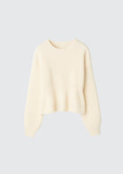 BESKRIVELSE: Miriella-genseren har en skulpturerende peplum-silhuett, laget av kraftig strikket kasjmir med en grov ribbet tekstur. Den feminine silhuetten har normal passform, en smal passform i midjen og rund hals, lange ermer, ribbede kanter og peplumkant i kanten.