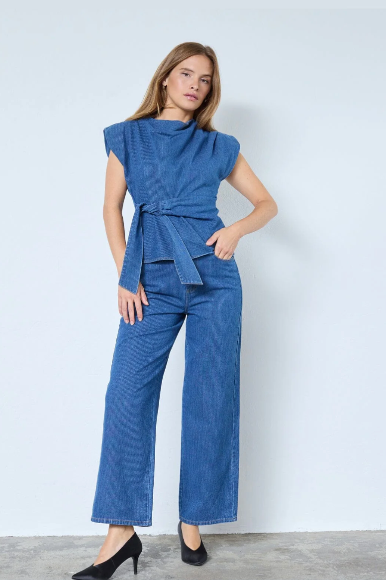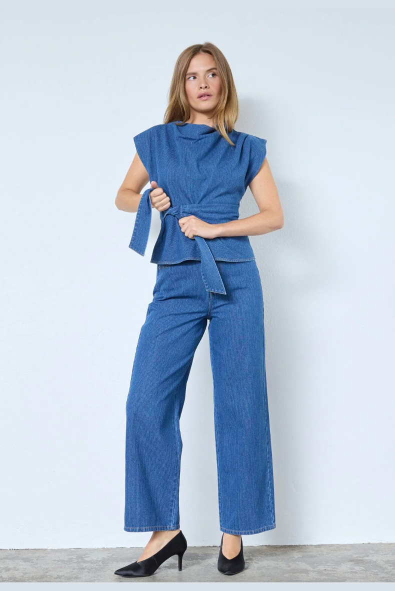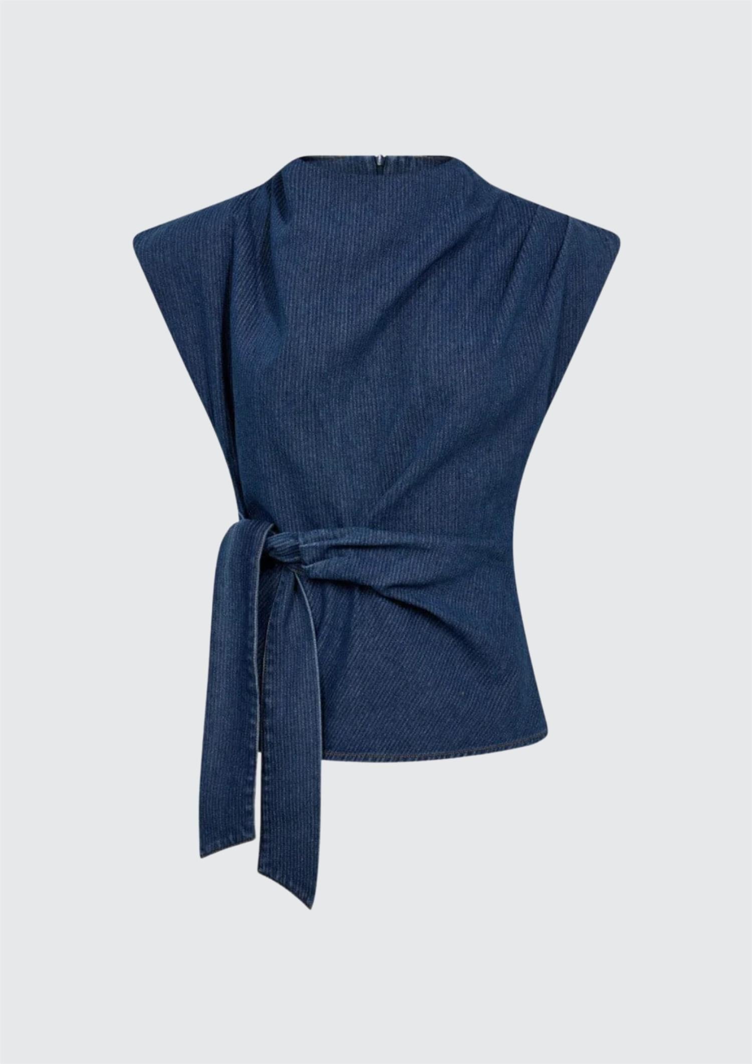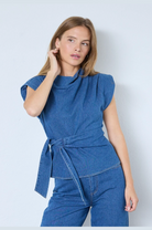 BESKRIVELSE: Mørkeblå plissert topp fra Co´Couture i en denimnyanse med tynne striper. Toppen har korte ermer og en høy hals.