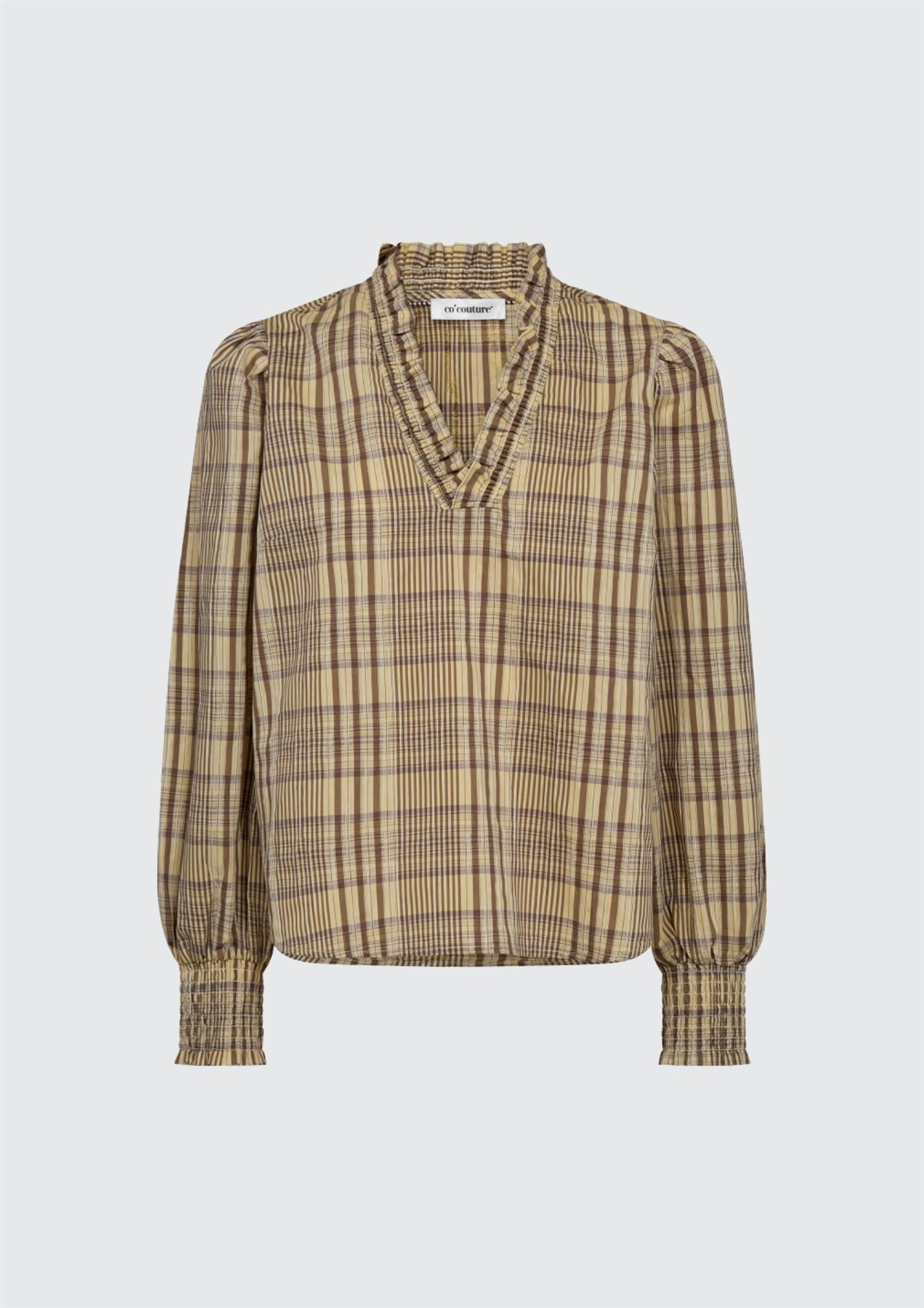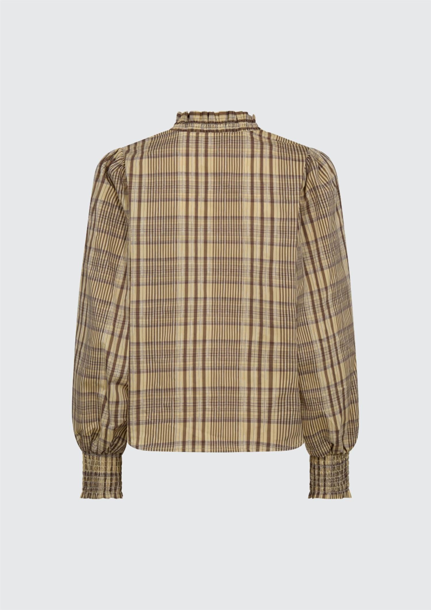 BESKRIVELSE: En klassisk rutete bluse med et moderne og gjennomført uttrykk. Blusen har en tidløs skjortekrage, knappelukking foran og lange ermer med mansjetter. Det delikate rutemønsteret i varme jordtoner gir et sofistikert preg, mens den dekorative metallringen bak tilfører en subtil og eksklusiv detalj. En anvendelig bluse som fungerer like godt til hverdags som til mer gjennomførte antrekk.