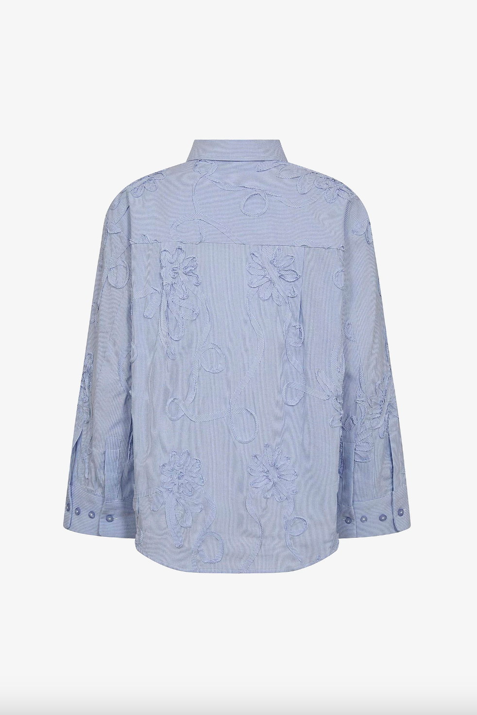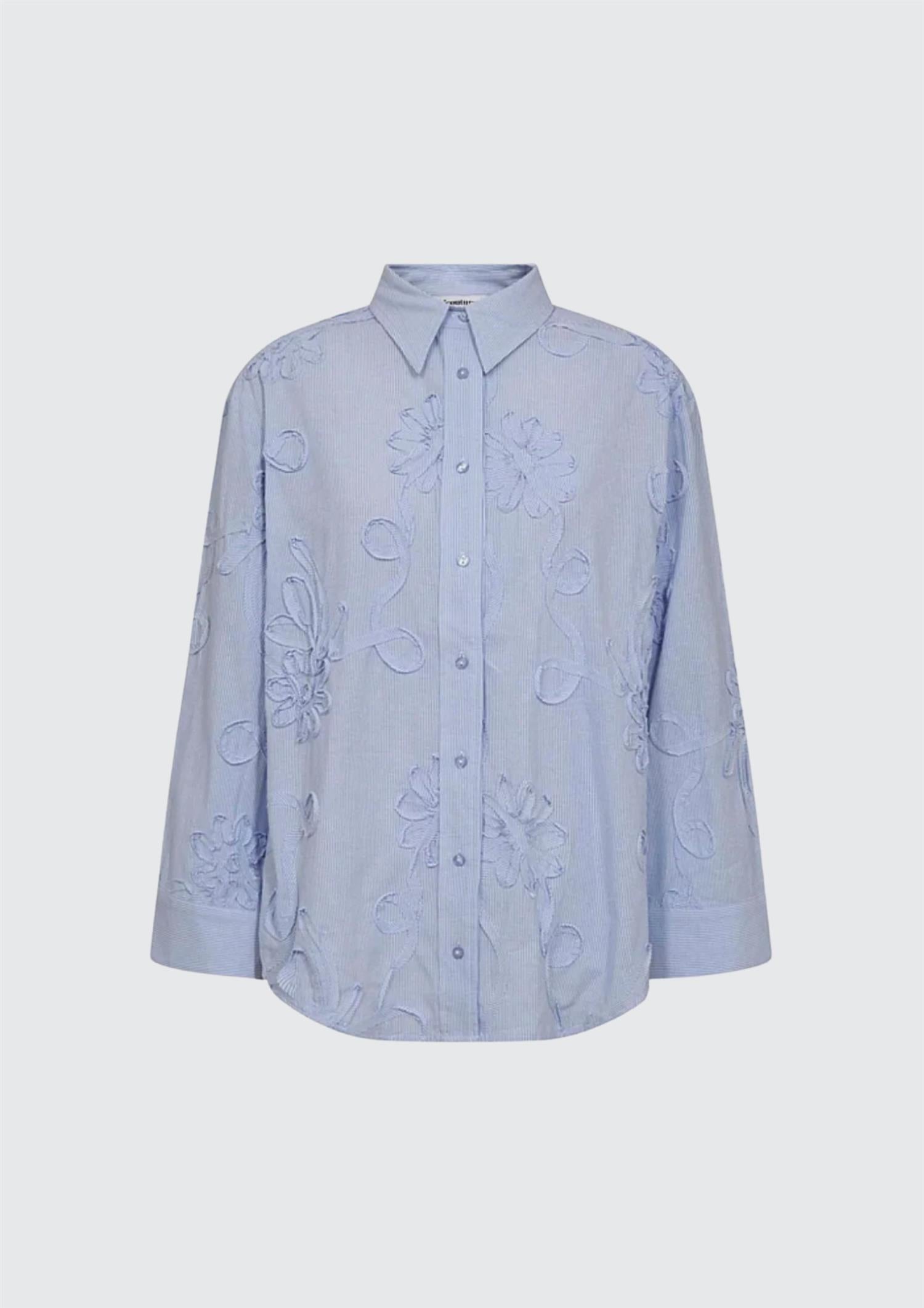BESKRIVELSE: Skjorte i bomull med påsydde blomsterapplikasjoner.