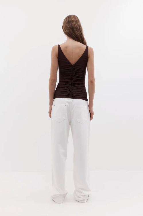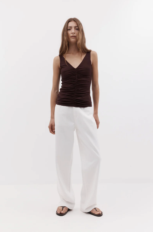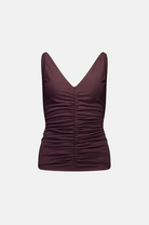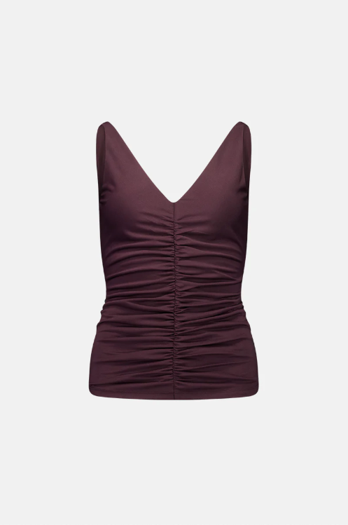 BESKRIVELSE: Toppen med rysjersey er laget av et dobbelt lag med stretchjersey med en luksuriøs følelse. Toppen har rysjerseykanter nedover midten foran og bak, en flatterende V-hals og er BH-vennlig for enkel bruk.