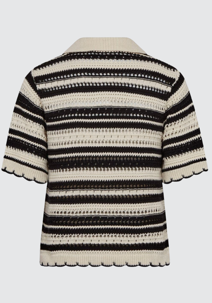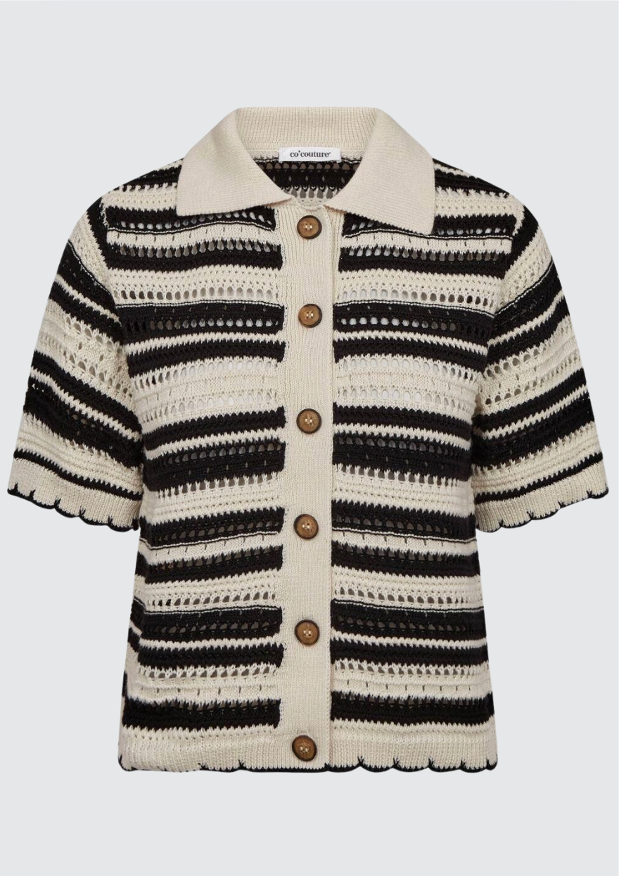 BESKRIVELSE: Strikket cardigan i myk, økologisk bomull med dekorative striper, polokrage og knapper i front. Delikate tungekanter nederst og på de korte ermene gir et elegant uttrykk.