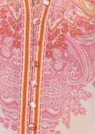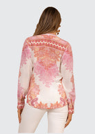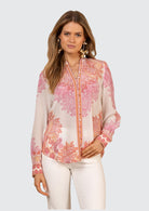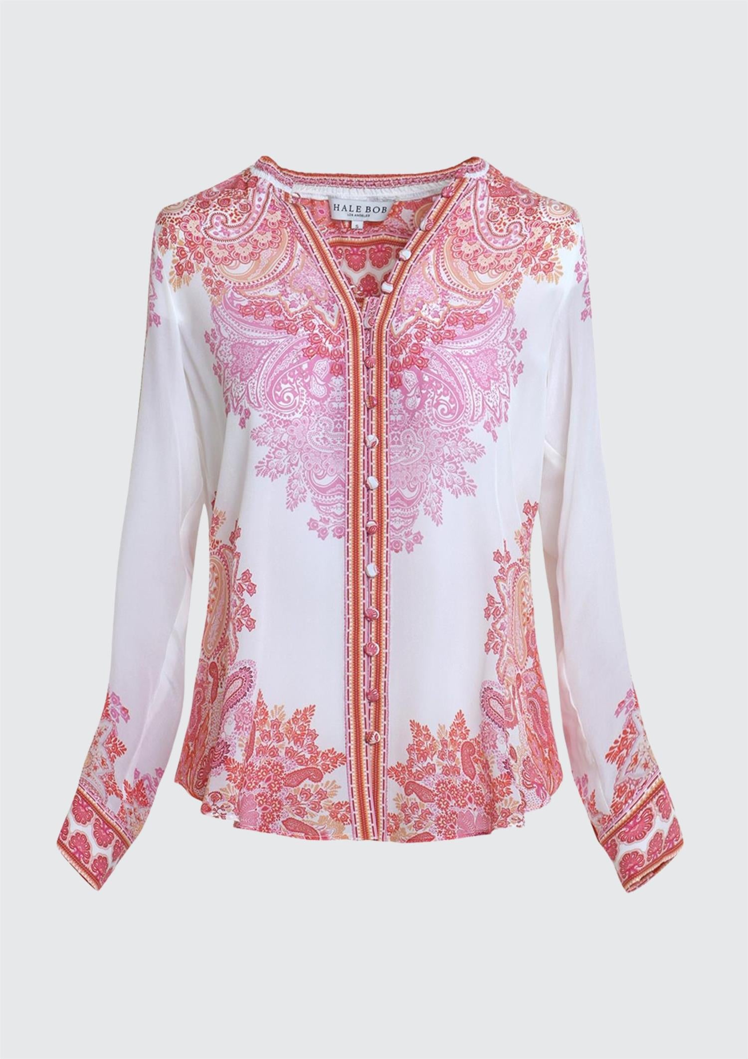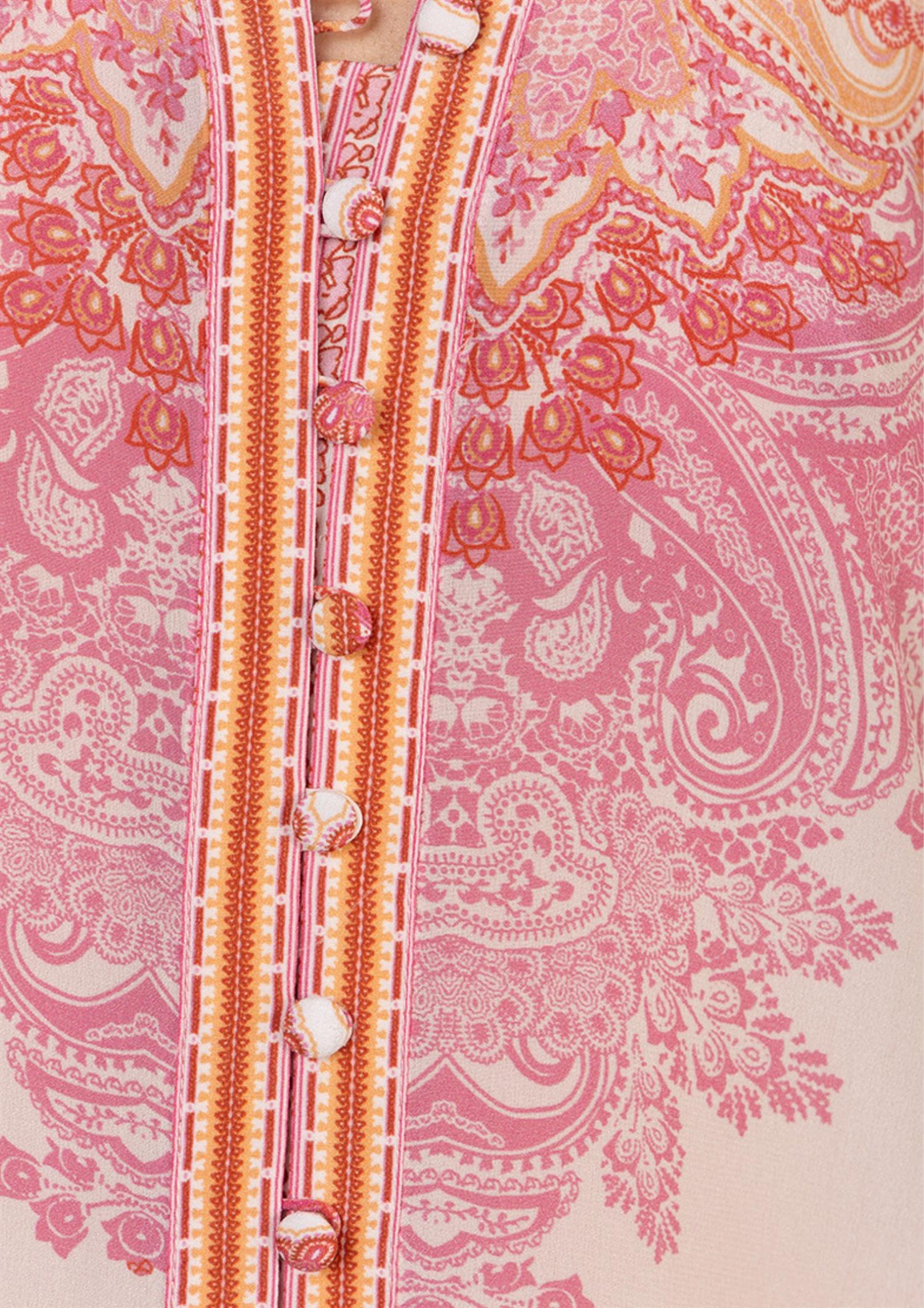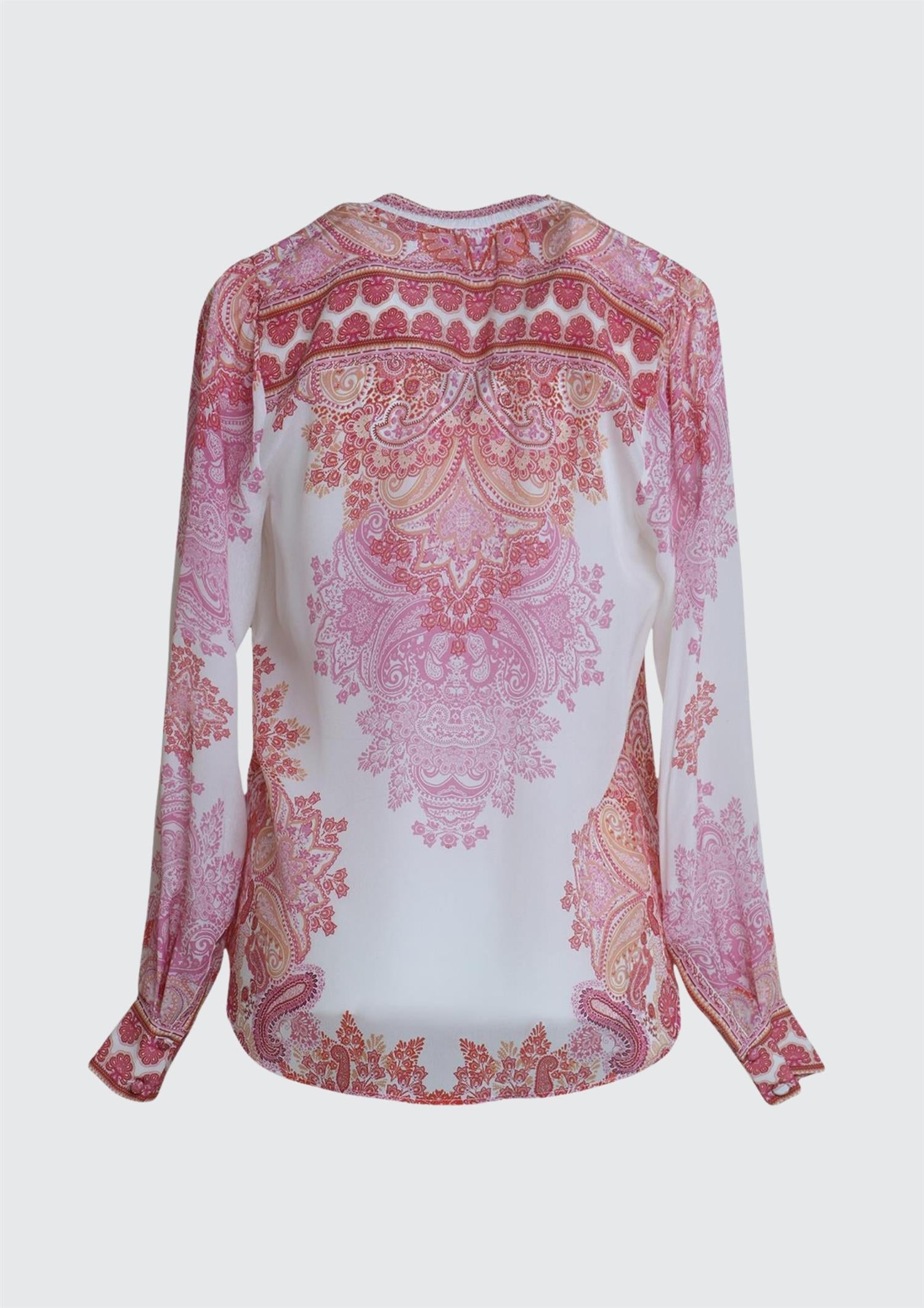 BESKRIVELSE: Elegant og feminin bluse i myk silke med delikat rosa paisley-mønster, perfekt til både hverdag og fest. Smocket utringning med knappelukking, lange ermer med knapp i mansjetten og hoftelengde med buet kant