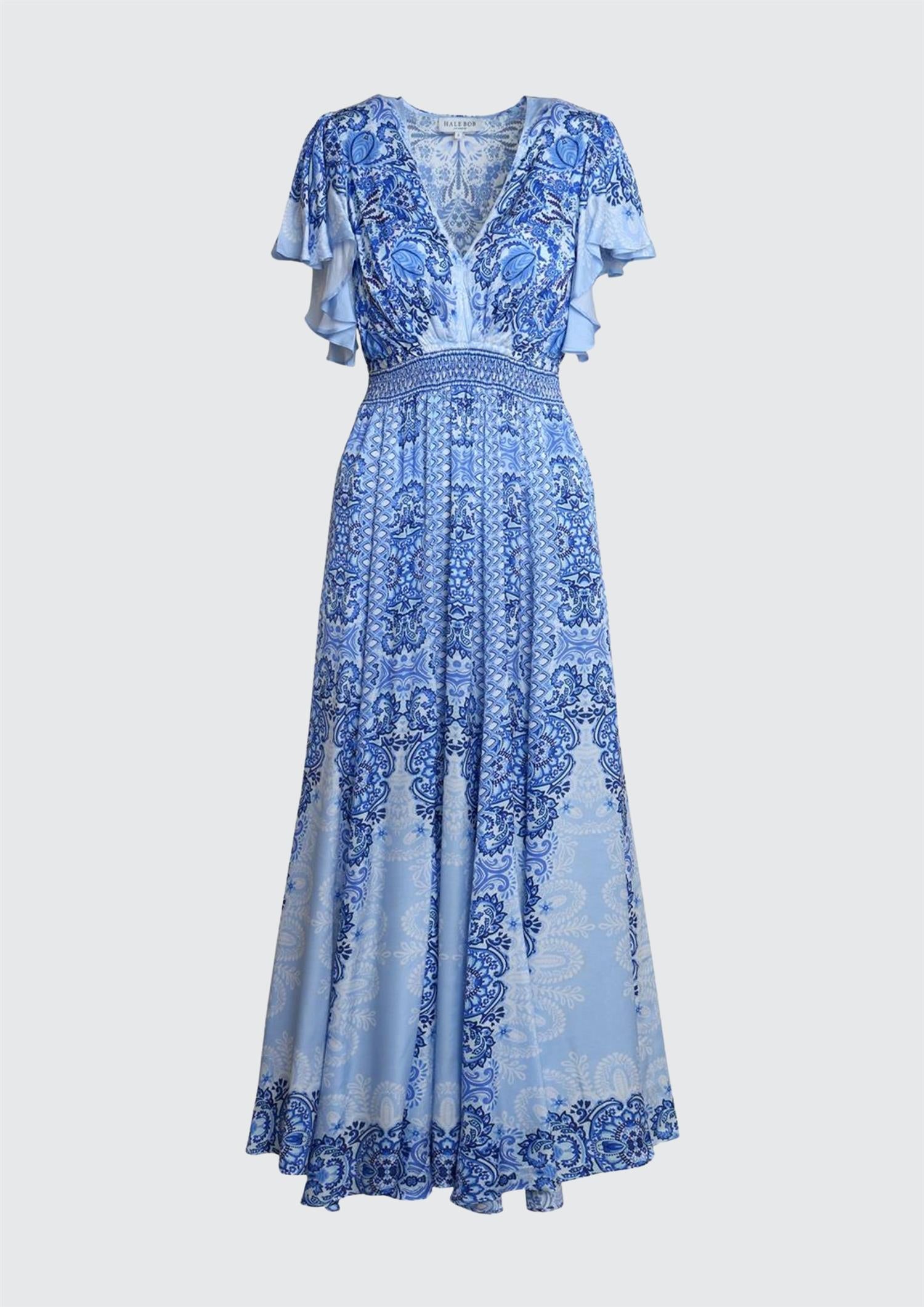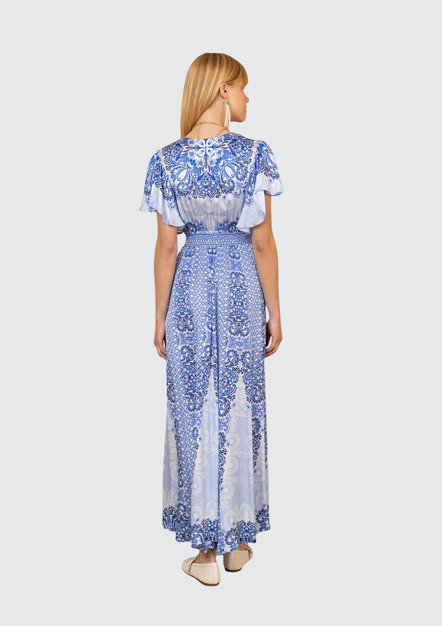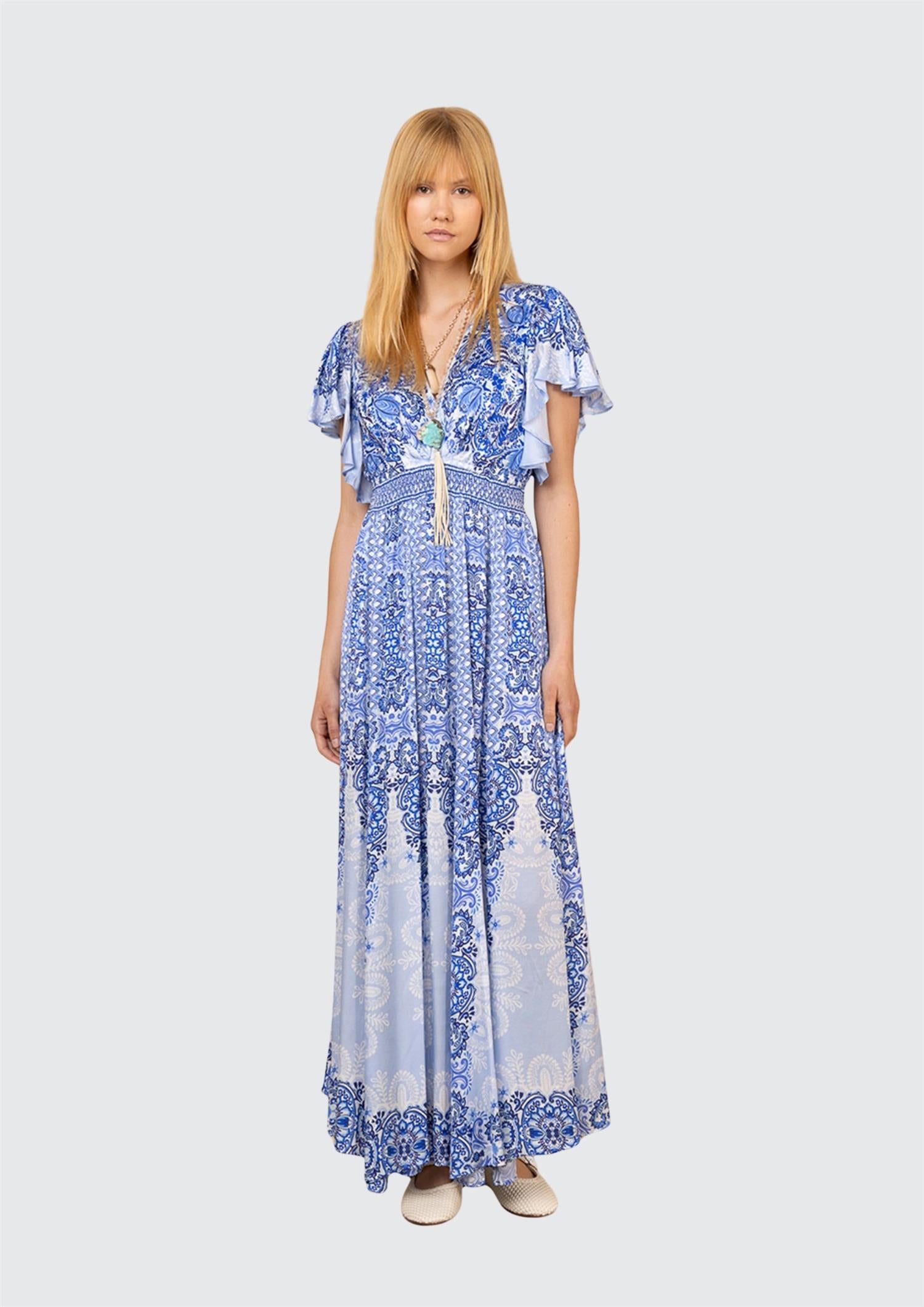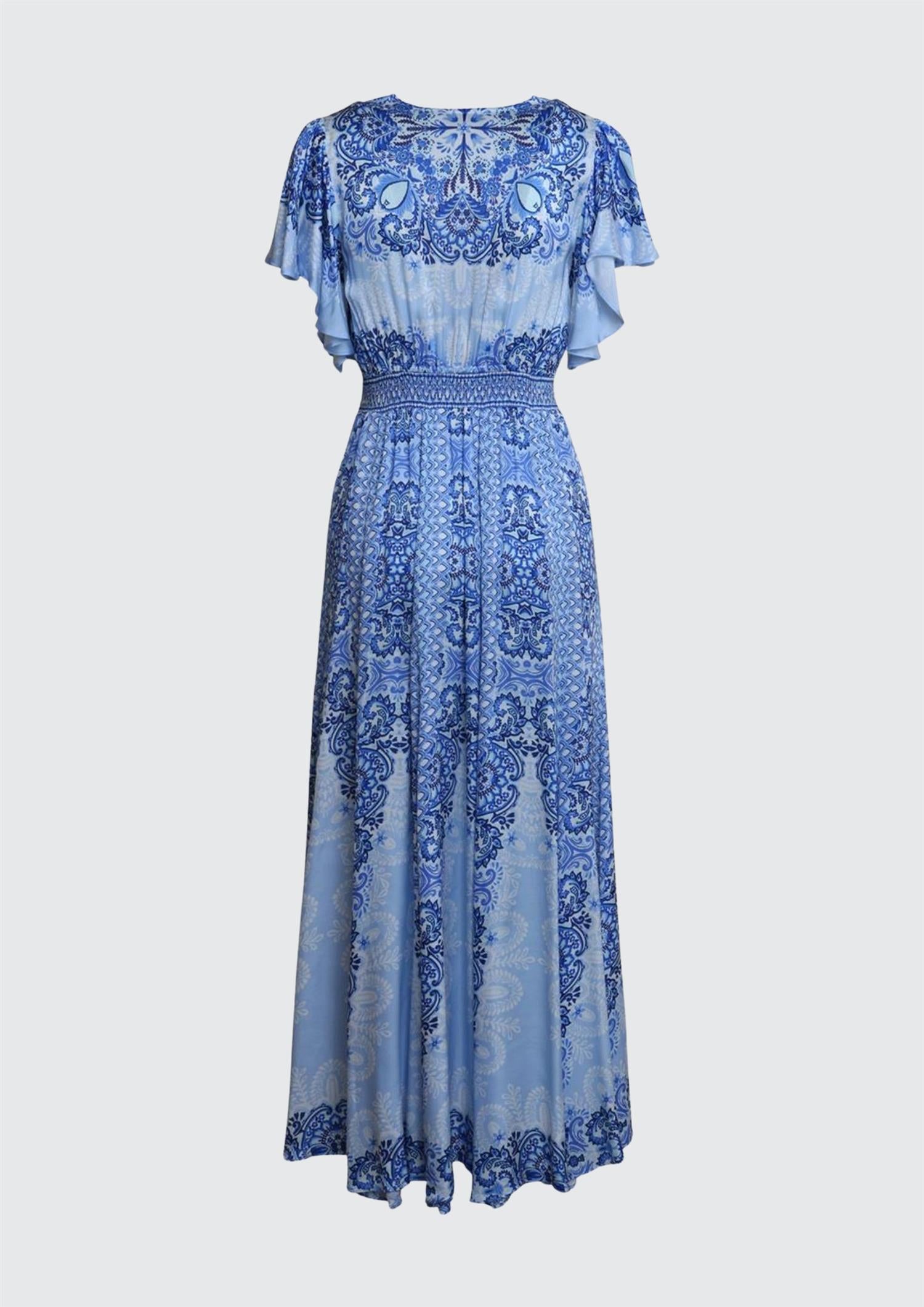 BESKRIVELSE: Elegant og lett Sandra maxi-kjole med mønster i lekre blåtoner, perfekt for sommerfester og hverdagsglam. Denne lange kjolemodellen kombinerer et vakkert paisleymønster med en flatterende V-hals og markert midje, som gir et feminint og luftig uttrykk.