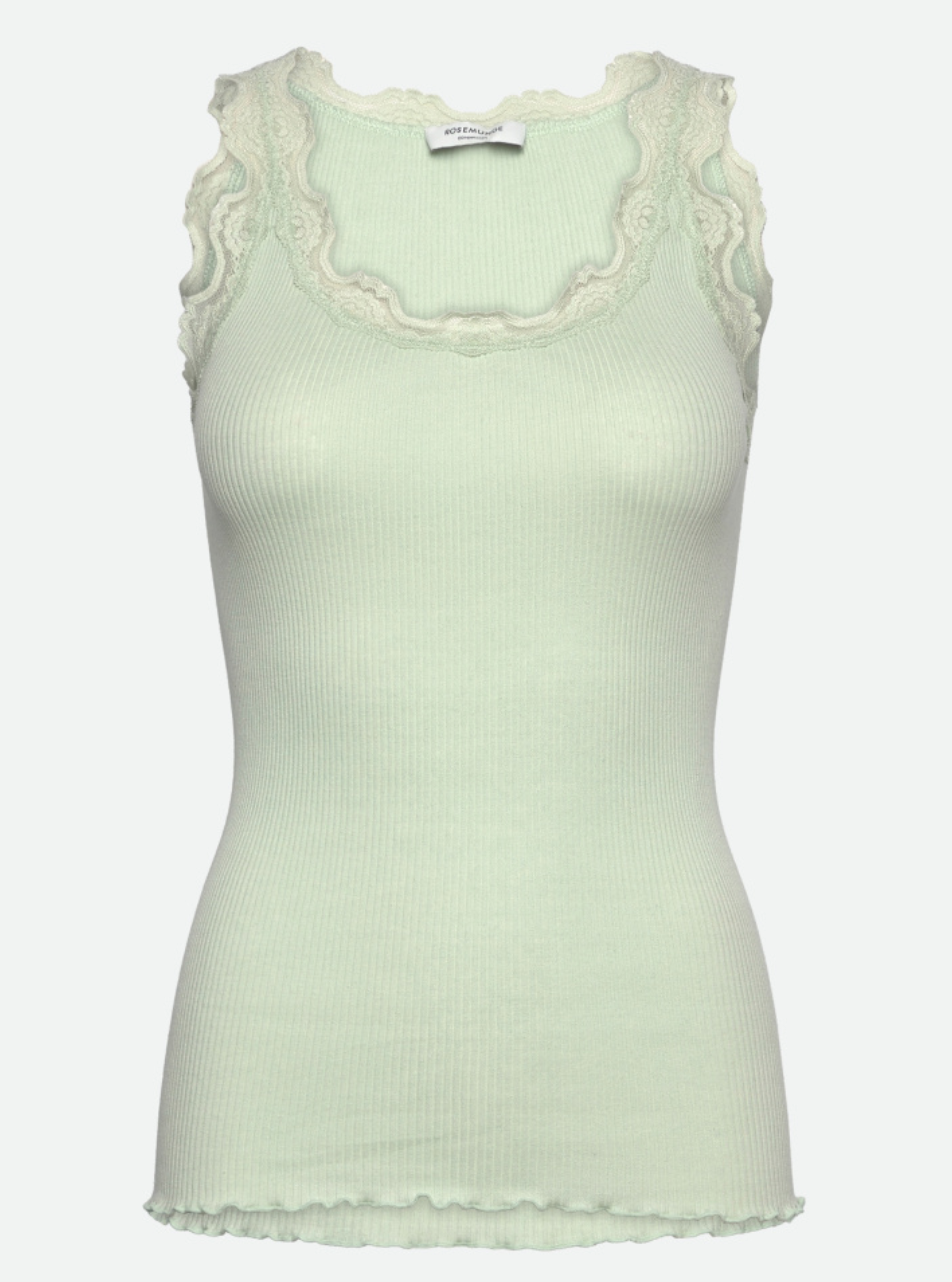 Beskrivelse: Silketopp fra Rosemunde med blondekant. Ribbet materiale. Passformen er tettsittende og den er perfekt å ha under bluser og gensere, eller som kun en søt topp.