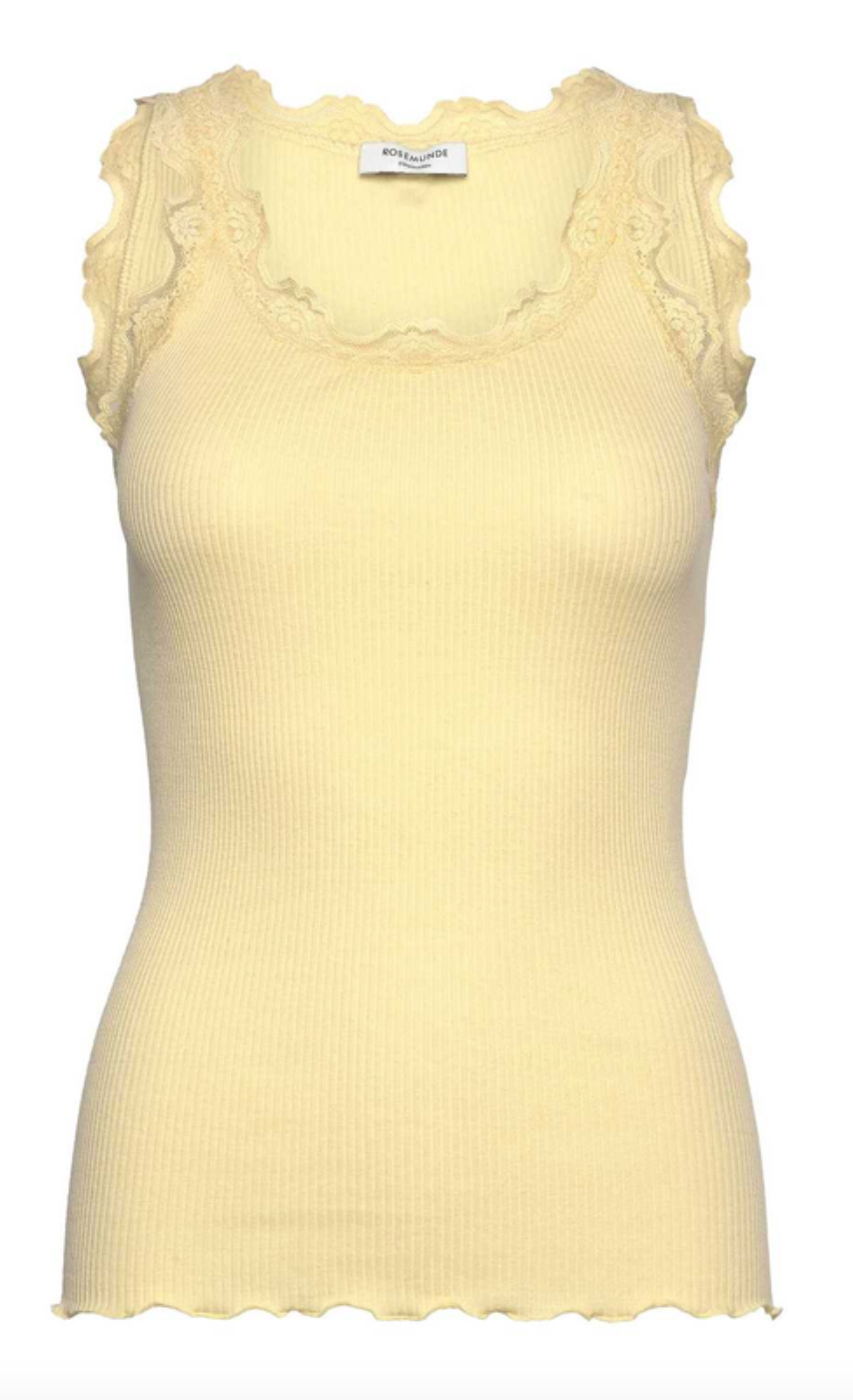 Beskrivelse: Silketopp fra Rosemunde med blondekant. Ribbet materiale. Passformen er tettsittende og den er perfekt å ha under bluser og gensere, eller som kun en søt topp.