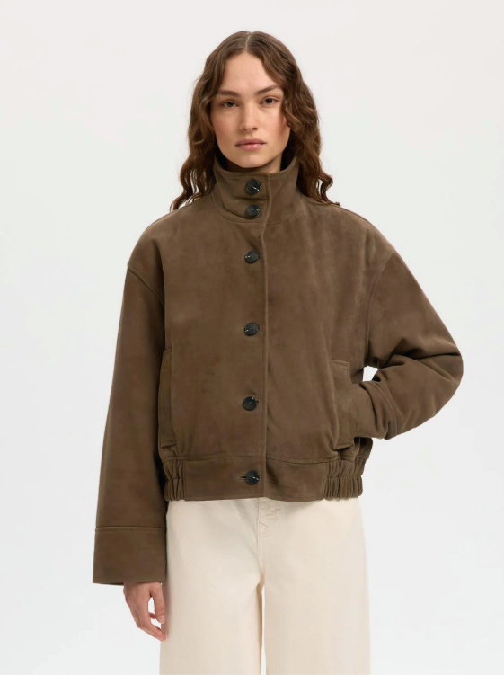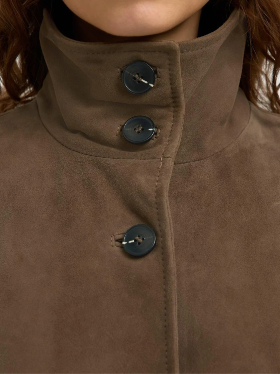 BESKKRIVELSE: Aiden Suede Jacket er en kul semsket skinnjakke i en sjokoladebrun farge. Denne jakken har en høy hals og lange ermer, noe som gir et litt røffere preg.