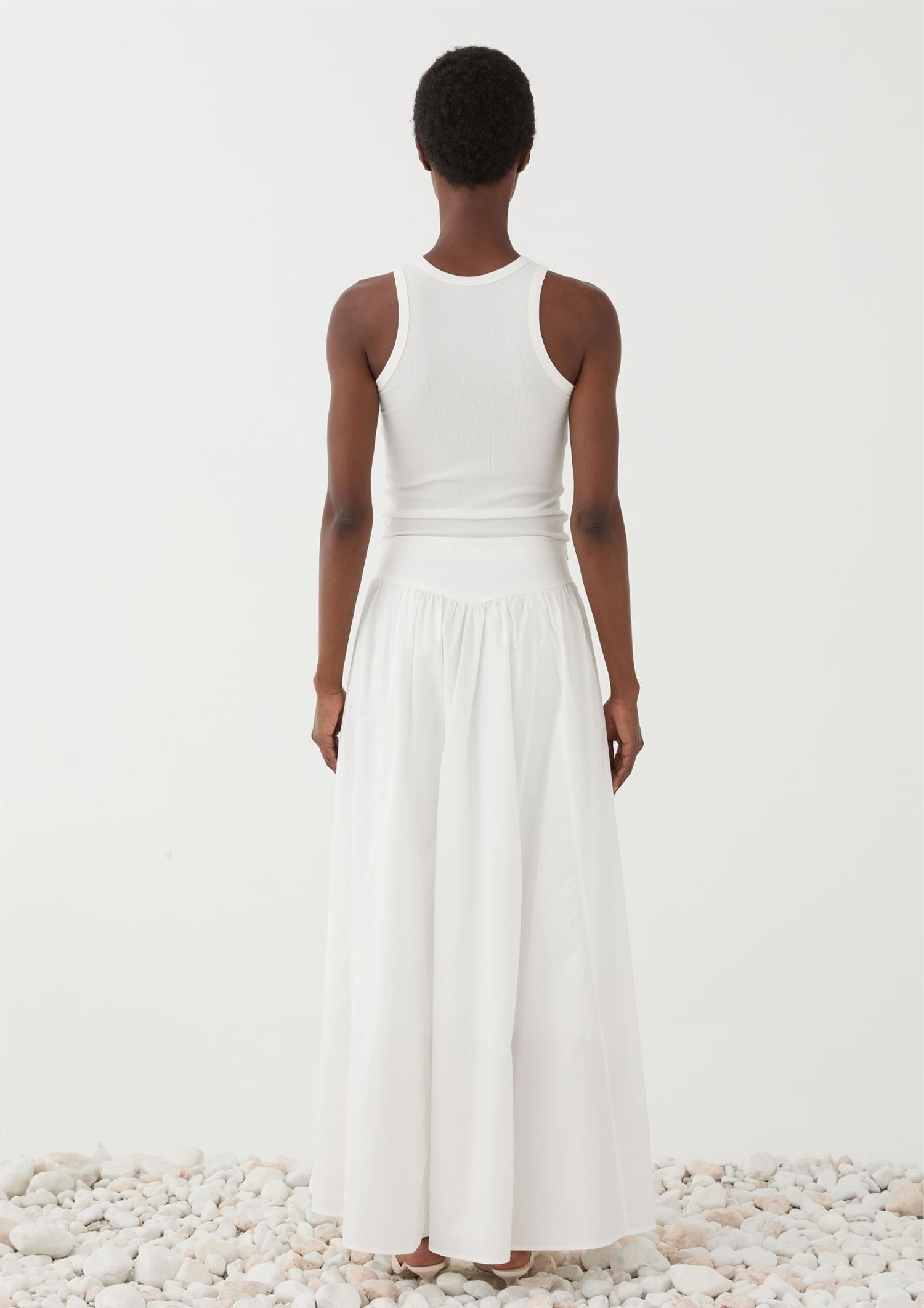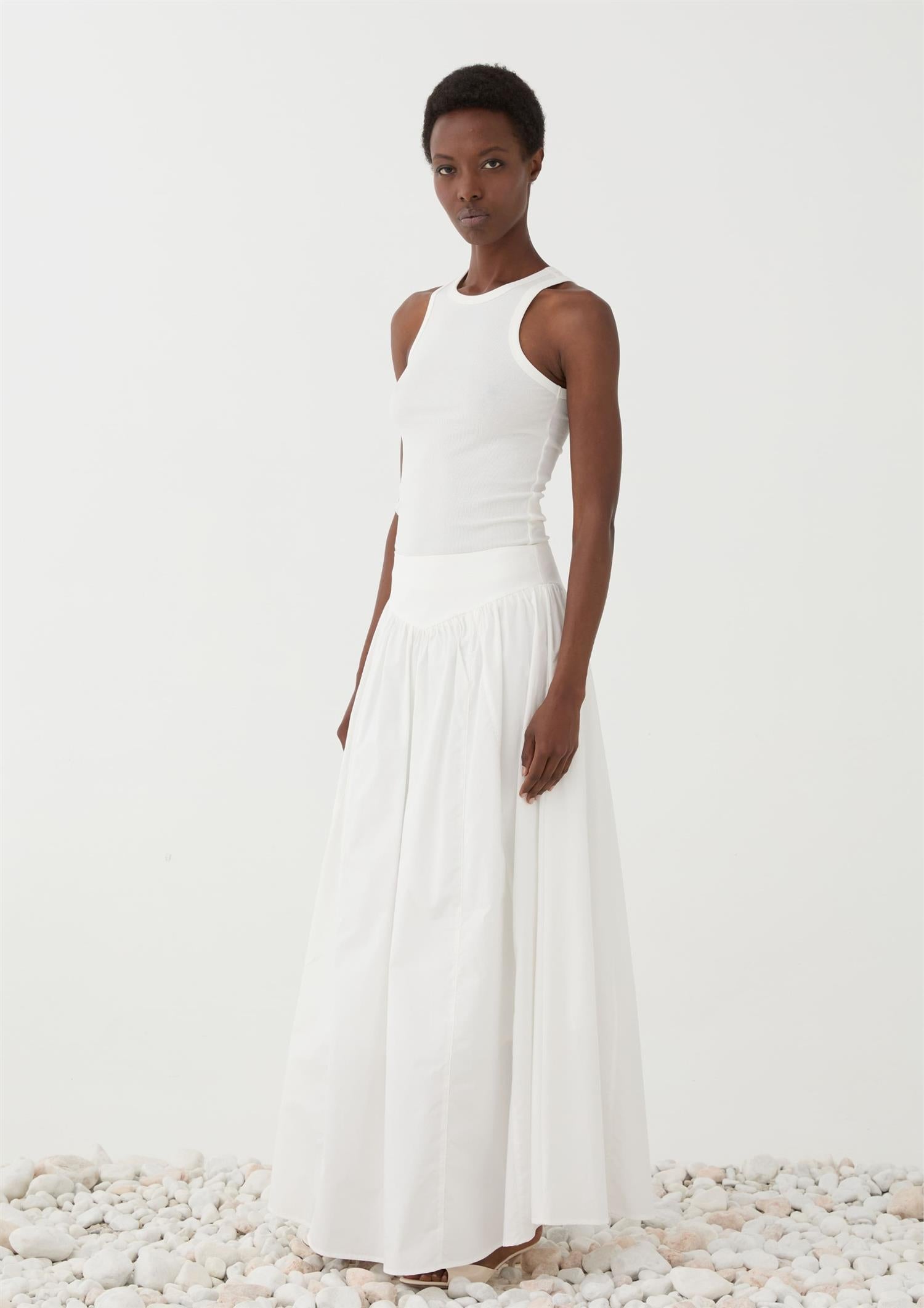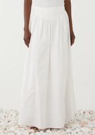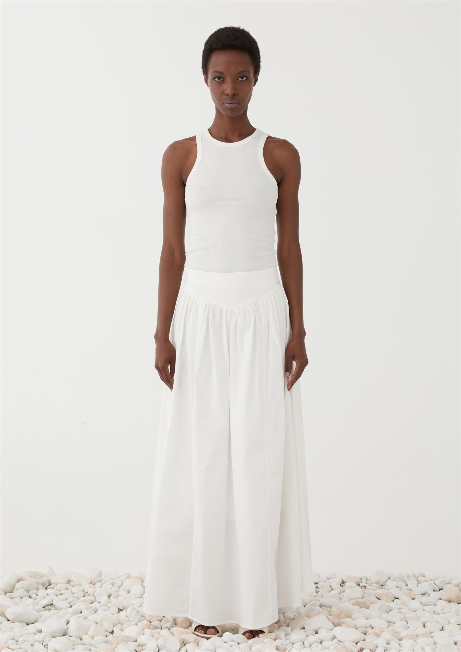BESKRIVELSE: Et langt skjørt med høy, formet linning som sitter glatt over midjen før det faller i en myk, vid silhuett. Den lett rynkede overgangen fra linningen gir naturlig volum og bevegelse uten at uttrykket blir tungt.