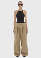 BESKRIVELSE: En avslappet og moderne bukse med vide ben og en ren, gjennomført silhuett. Modellen har middels høy midje med beltehemper, knappelukking og klassiske lommer i front som gir et subtilt denim-inspirert uttrykk.