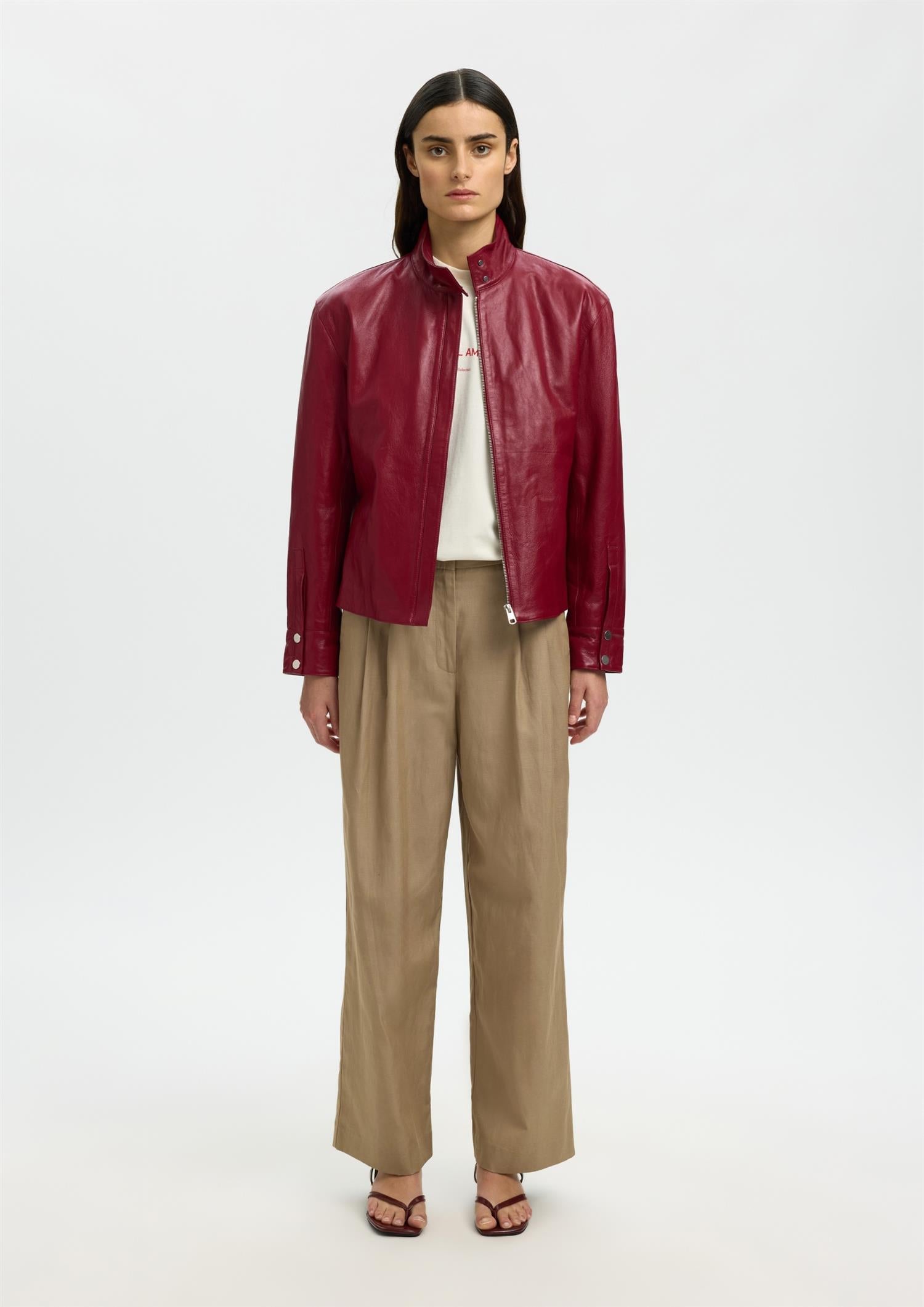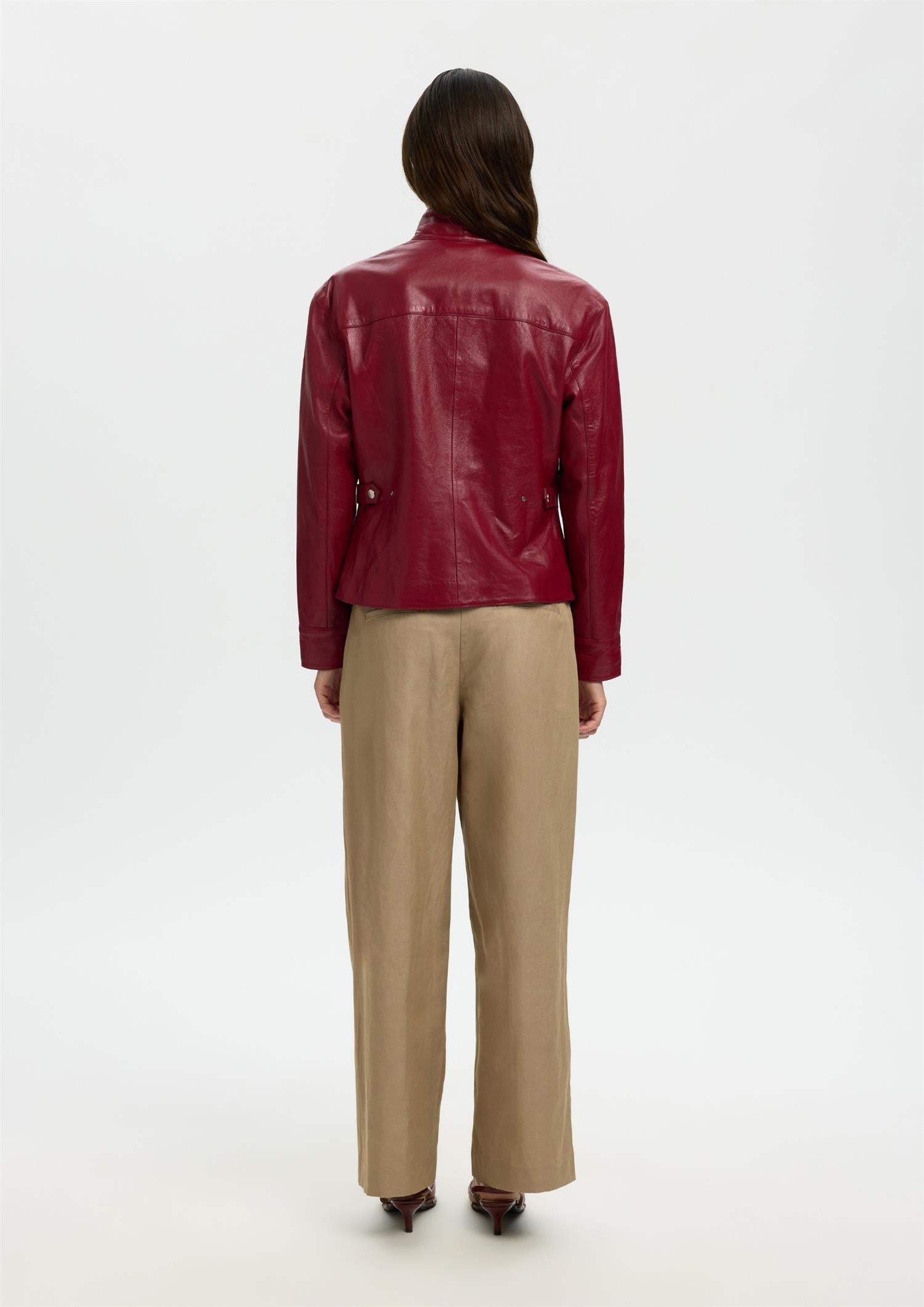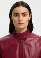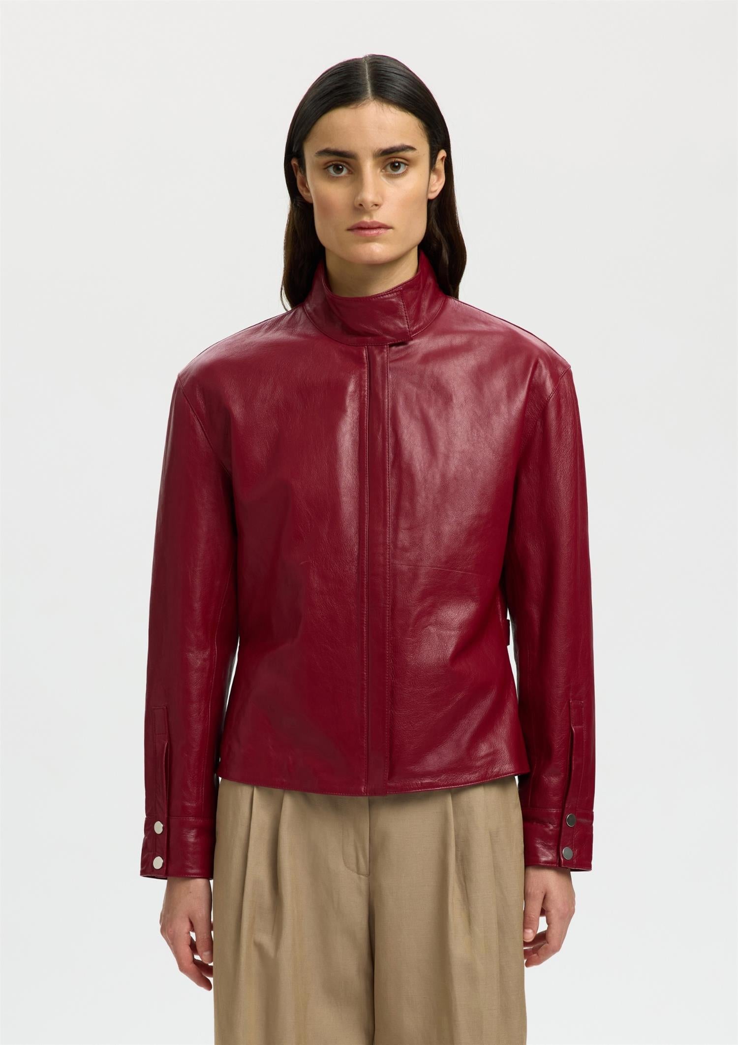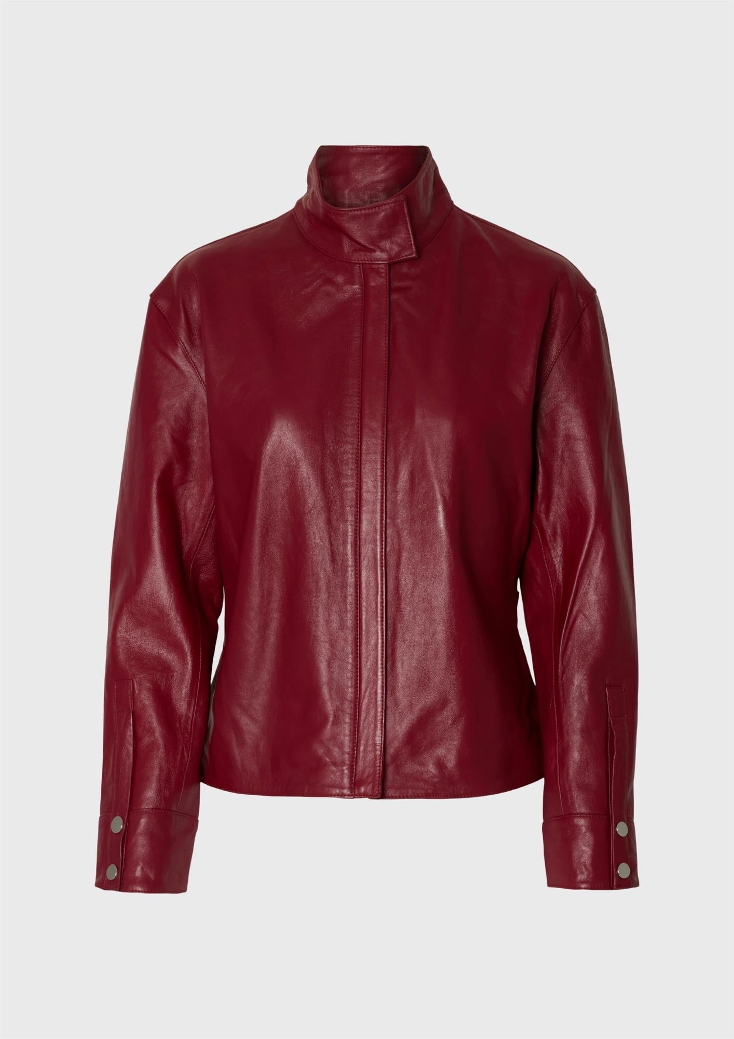 BESKRIVELSE: En stilren skinnjakke med et sofistikert og moderne uttrykk. Jakken har høy ståkrage og lange ermer med lett droppede skuldre som gir en avslappet, men strukturert silhuett. Mansjettene er knappet for en gjennomført finish, mens kombinasjonen av trykknapper og glidelås i front gir et rent og funksjonelt uttrykk.