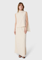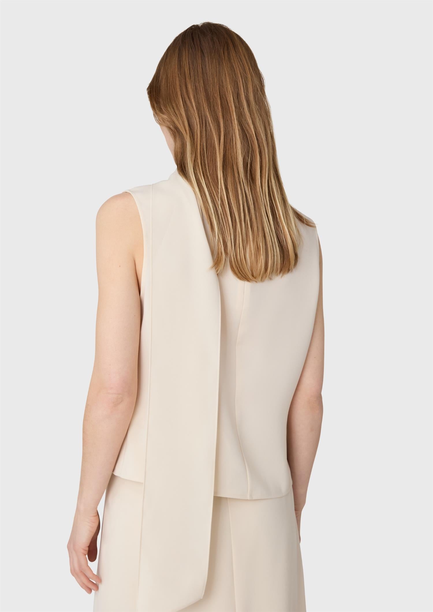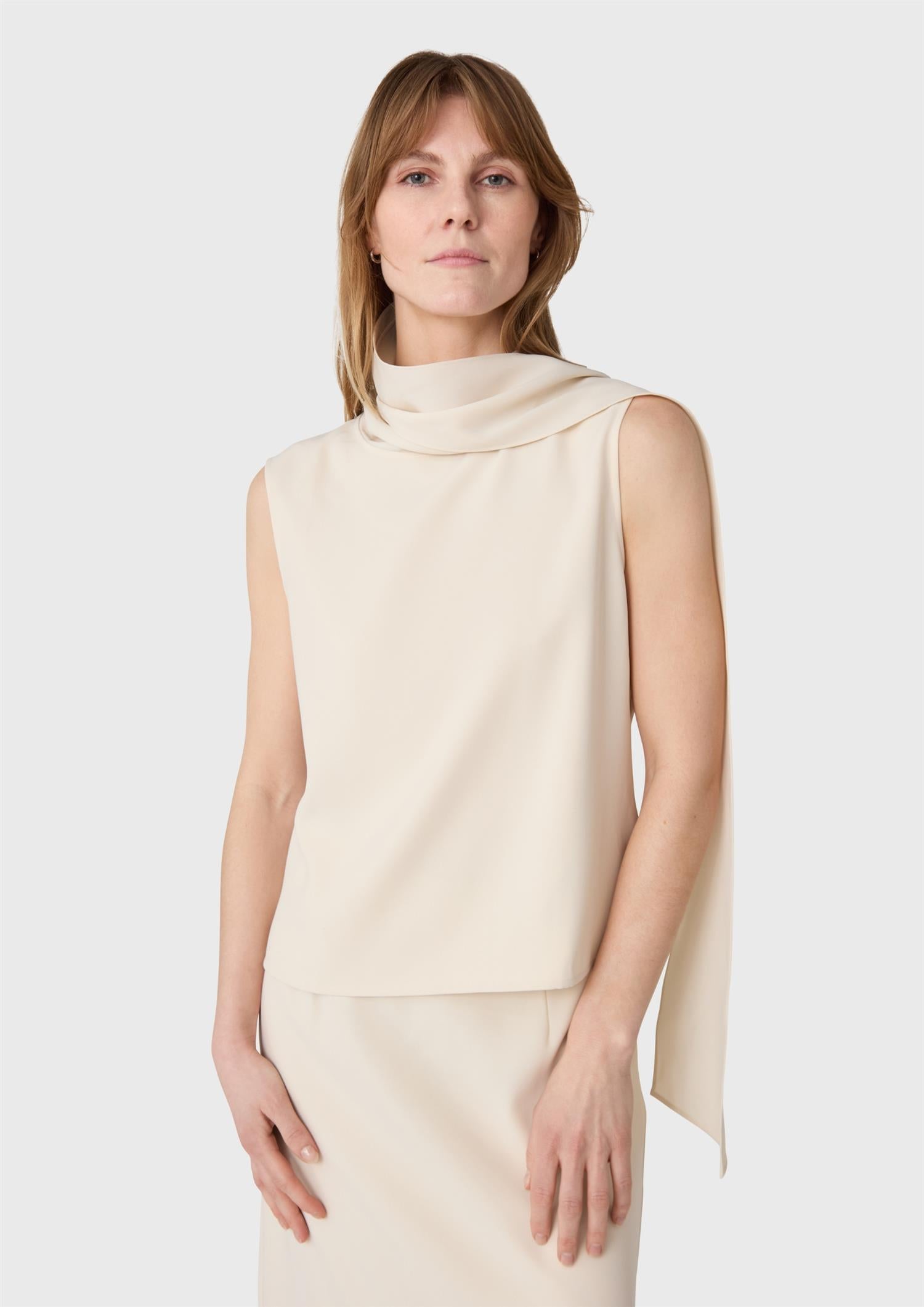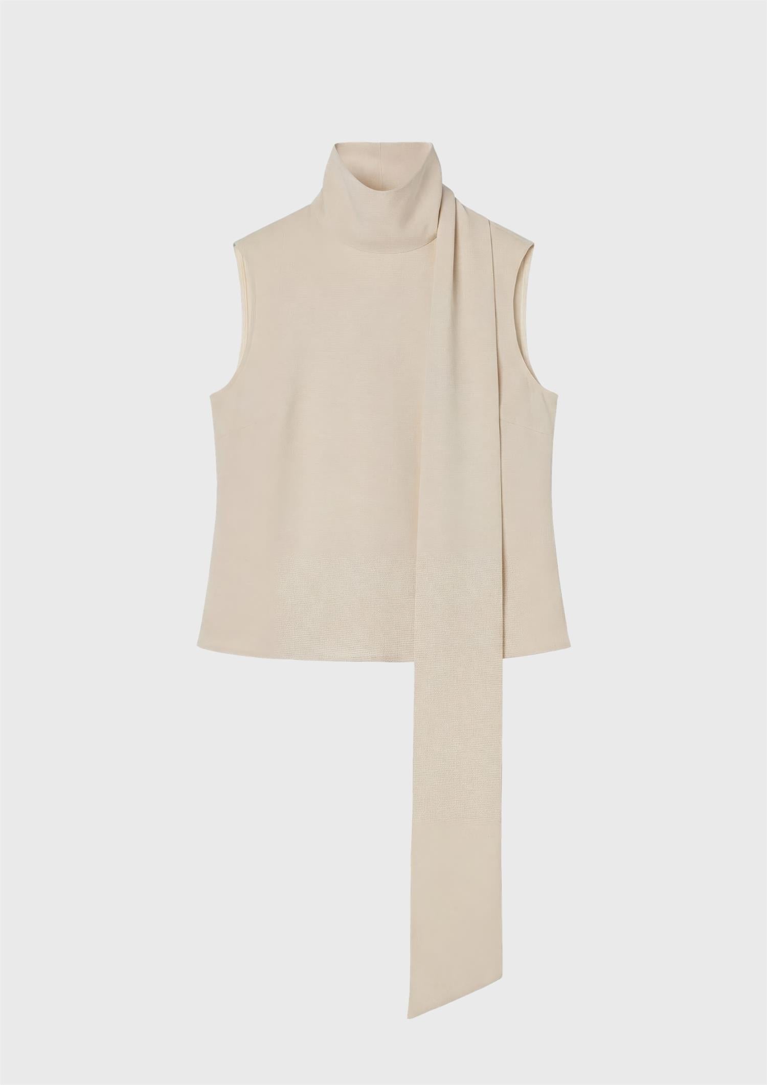 BESKRIVELSE: Orly Turtleneck Top er en ermeløs topp i twill med høy hals og en elegant skjerfdetalj som gir plagget et sofistikert uttrykk. Den rene silhuetten gjør den like fin stylet med et skjørt, som brukt alene til alt fra dressbukser til denim.