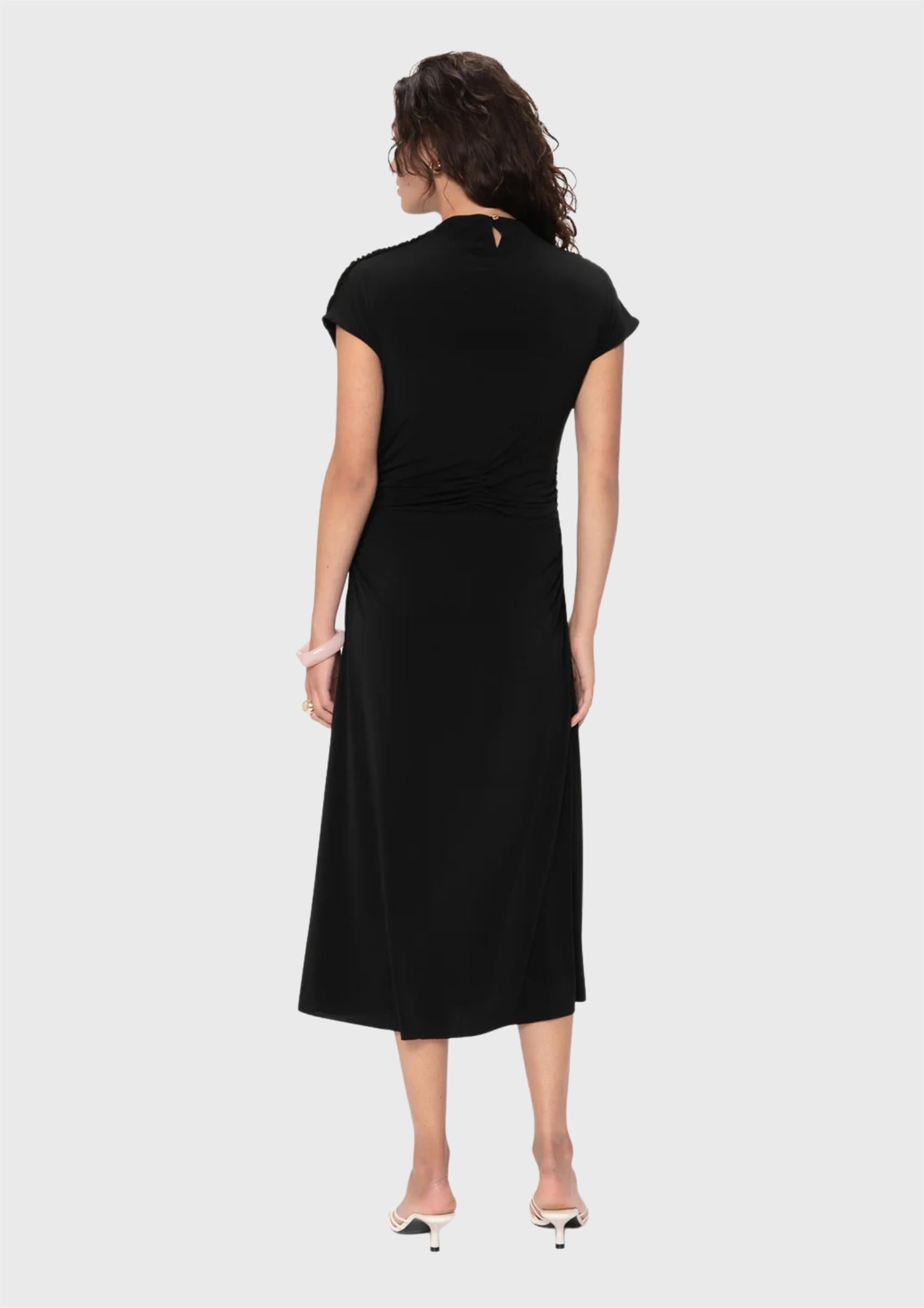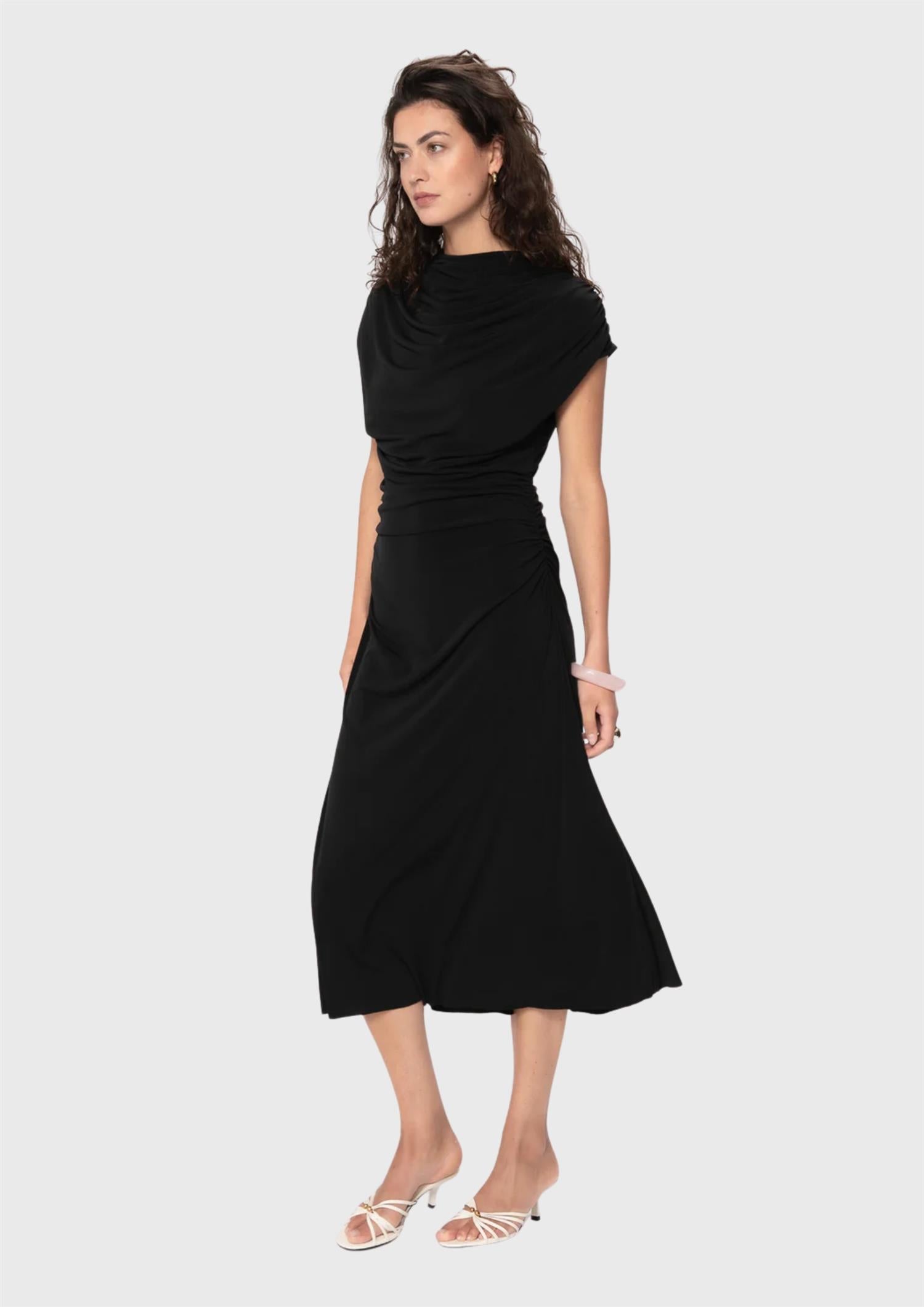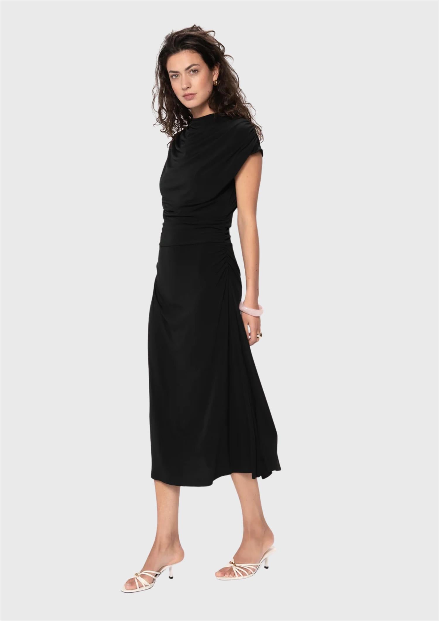 BESKRIVELSE: En ermeløs kjole i midi-lengde, laget i en myk og flytende jerseykvalitet. Draperingen foran former utringningen og overkroppen, mens skjørtet faller mykt og elegant langs kroppen. Gjennomtenkt designet for både uanstrengt hverdagsbruk og mer pyntede anledninger.