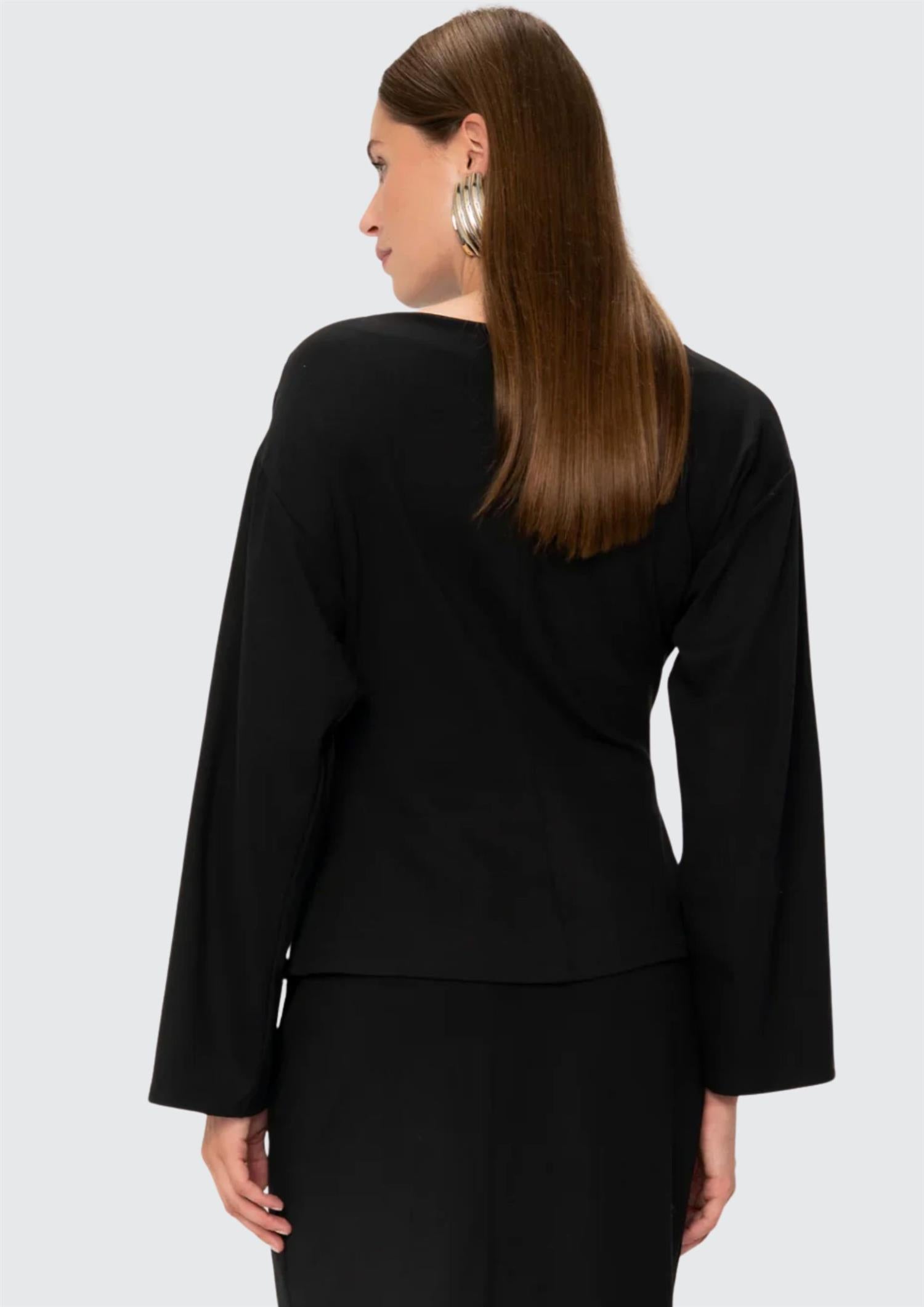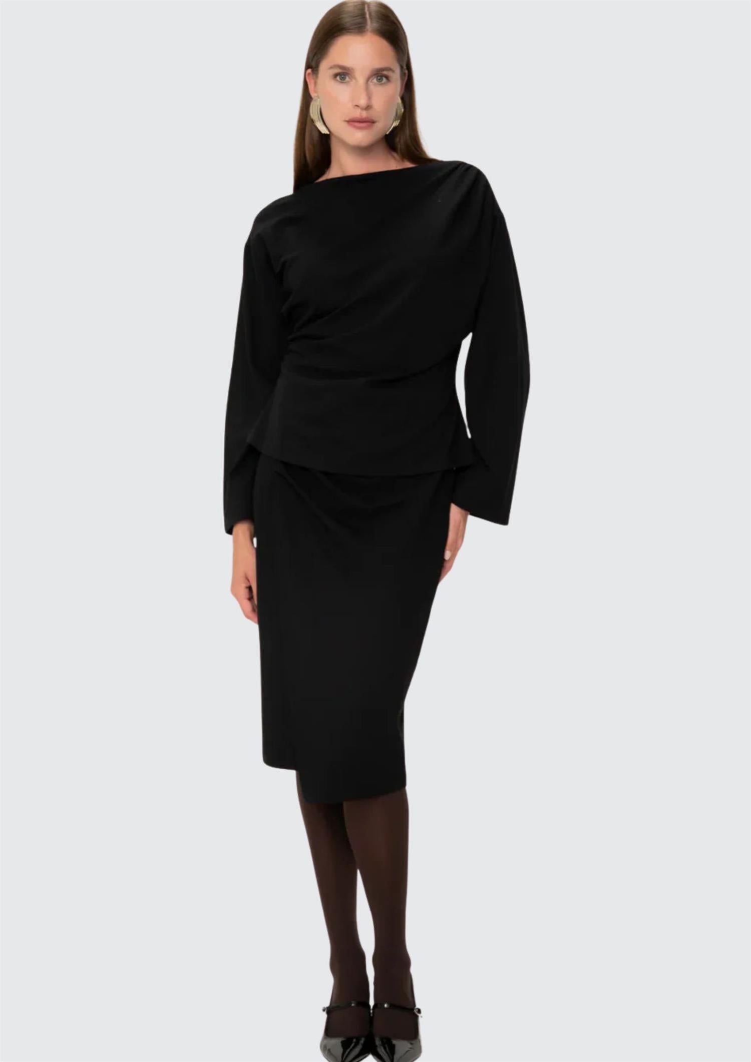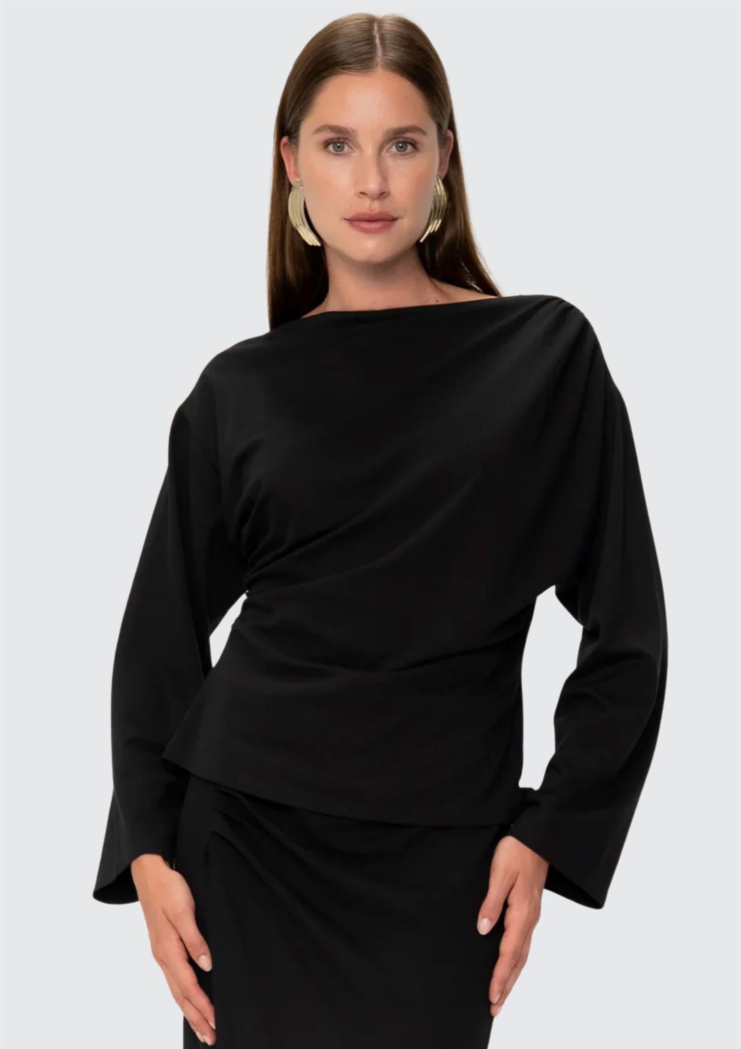 BESKRIVELSE: Merak-toppen er laget av et kraftig jerseystoff i viskoseblanding som gir både komfort og struktur. Den enkle silhuetten fremheves av subtile draperinger over brystet for en flatterende effekt.
