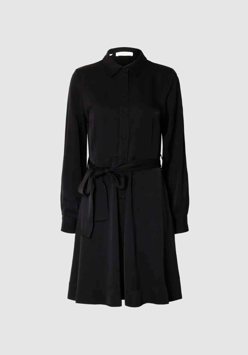 BESKRIVELSE: Paola Regular Ls Short Shirt Dress B fra Selected Femme. En klassisk skjortekjole med moderne snitt – Paola fra Selected Femme gir en tidløs og elegant silhuett. Den har lange ermer, knappestolpe i front og et avtagbart knytebelte i livet som fremhever fasongen. Perfekt både til hverdags og mer oppkledde anledninger.