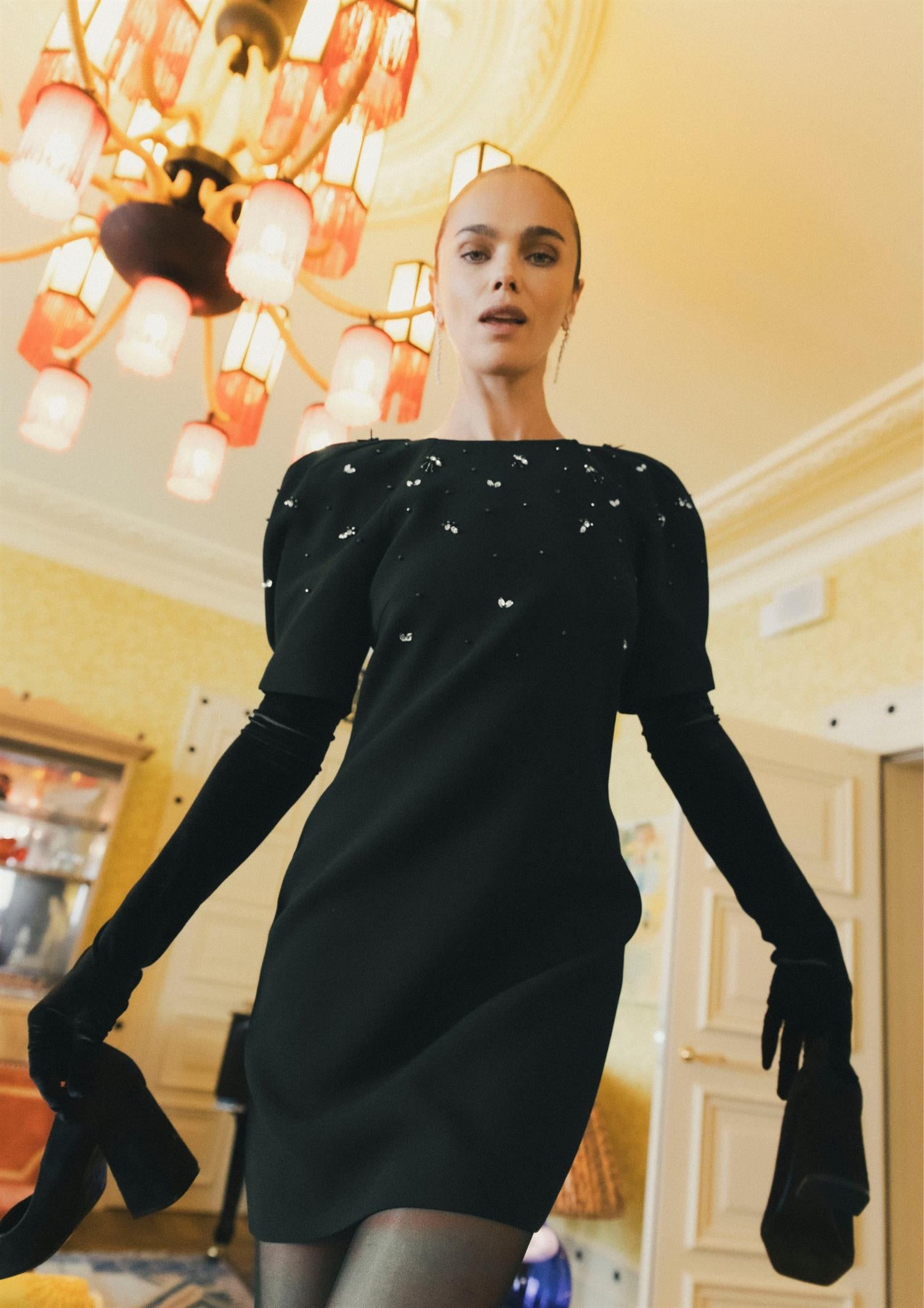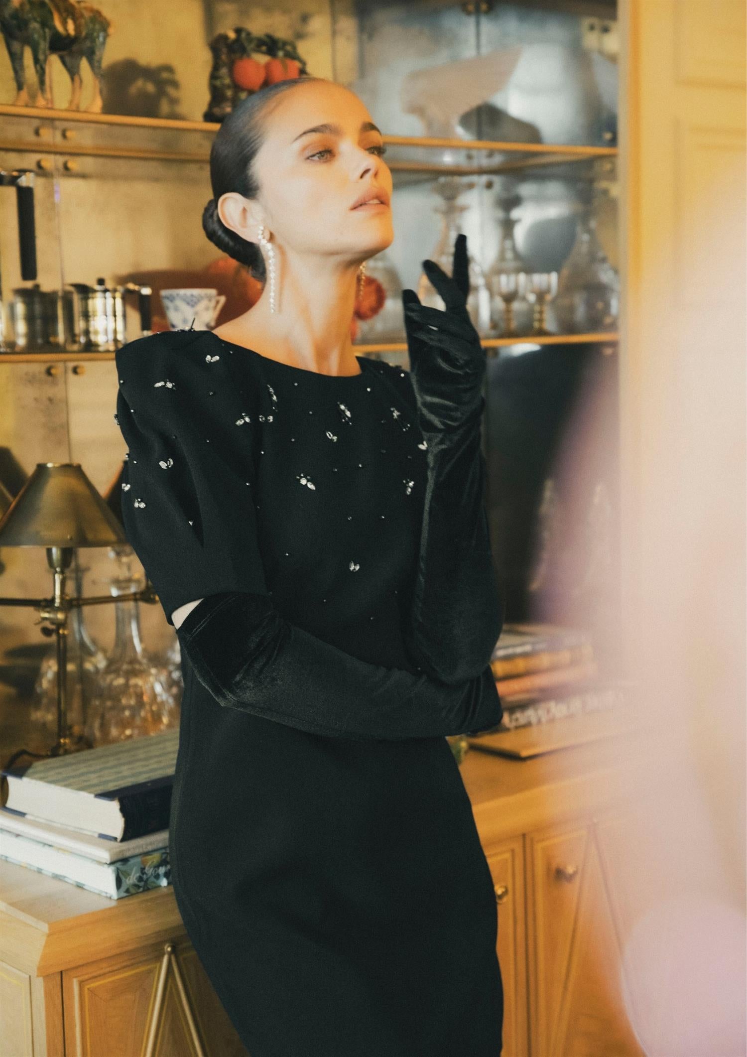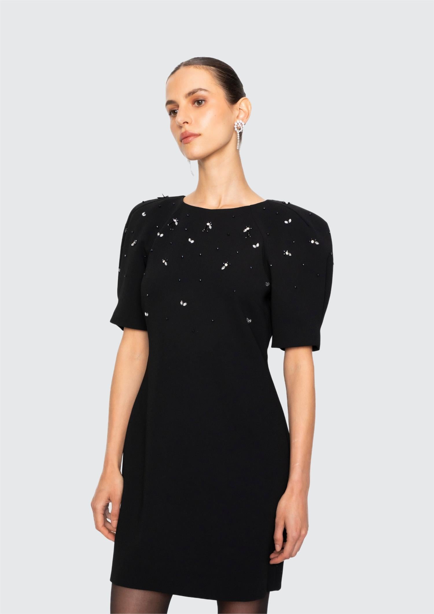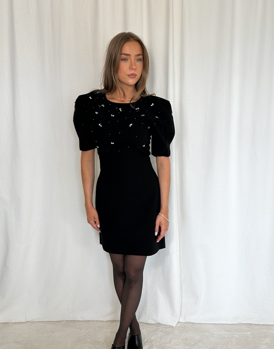 Beskrivelse: Denne stilrene kjolen har korte ermer og iøynefallende dekorasjoner øverst på overdelen som gir et glitrende og sofistikert preg. Raglanermer og diskrete skulderputer skaper en strukturert silhuett, mens den kroppsnære passformen fremhever figuren på en flatterende måte.