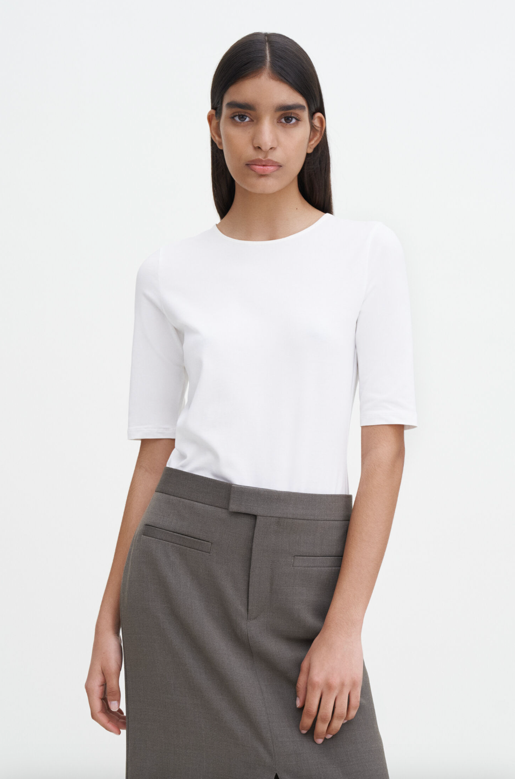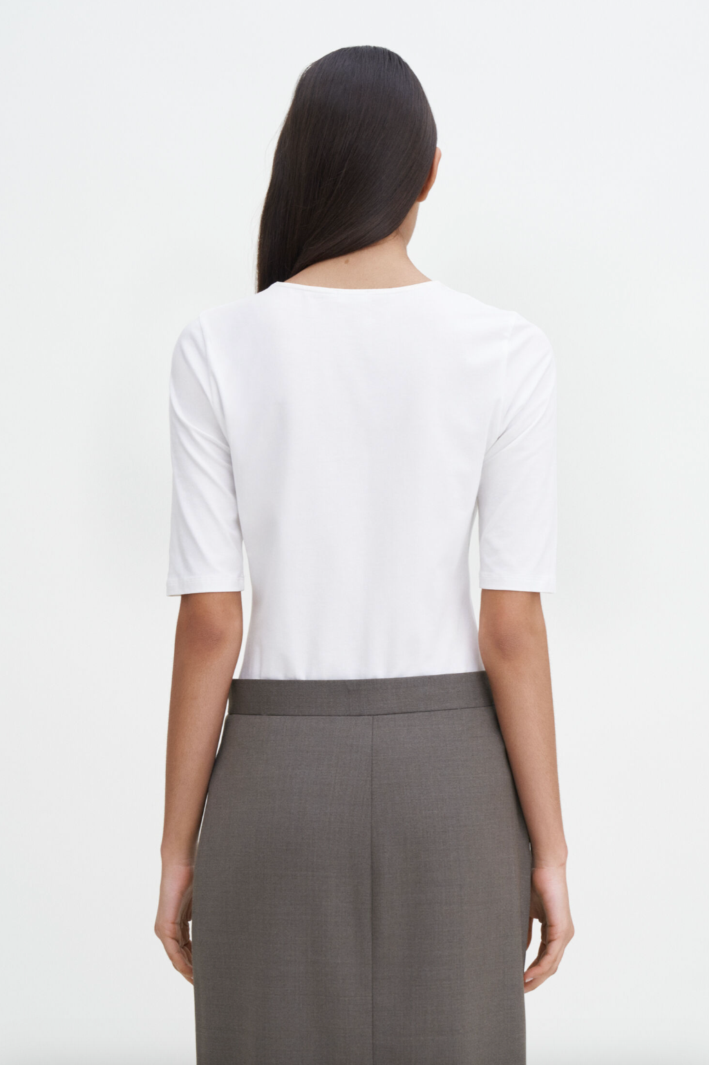 Beskrivelse: Cotton Stretch Elbow Sleeve i hvit bomull med sjenerøs stretch. Designet med rund hals og ermelengde som treffer like over albuen. Legg den inn i bukser med høy midje for et minimalistisk utseende.