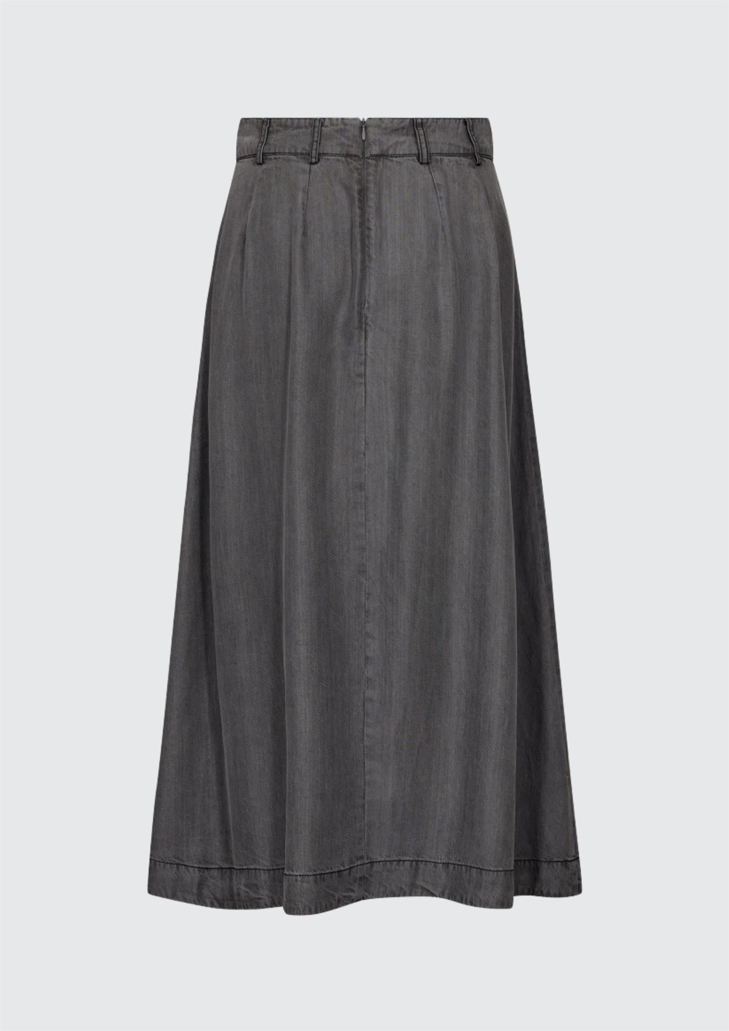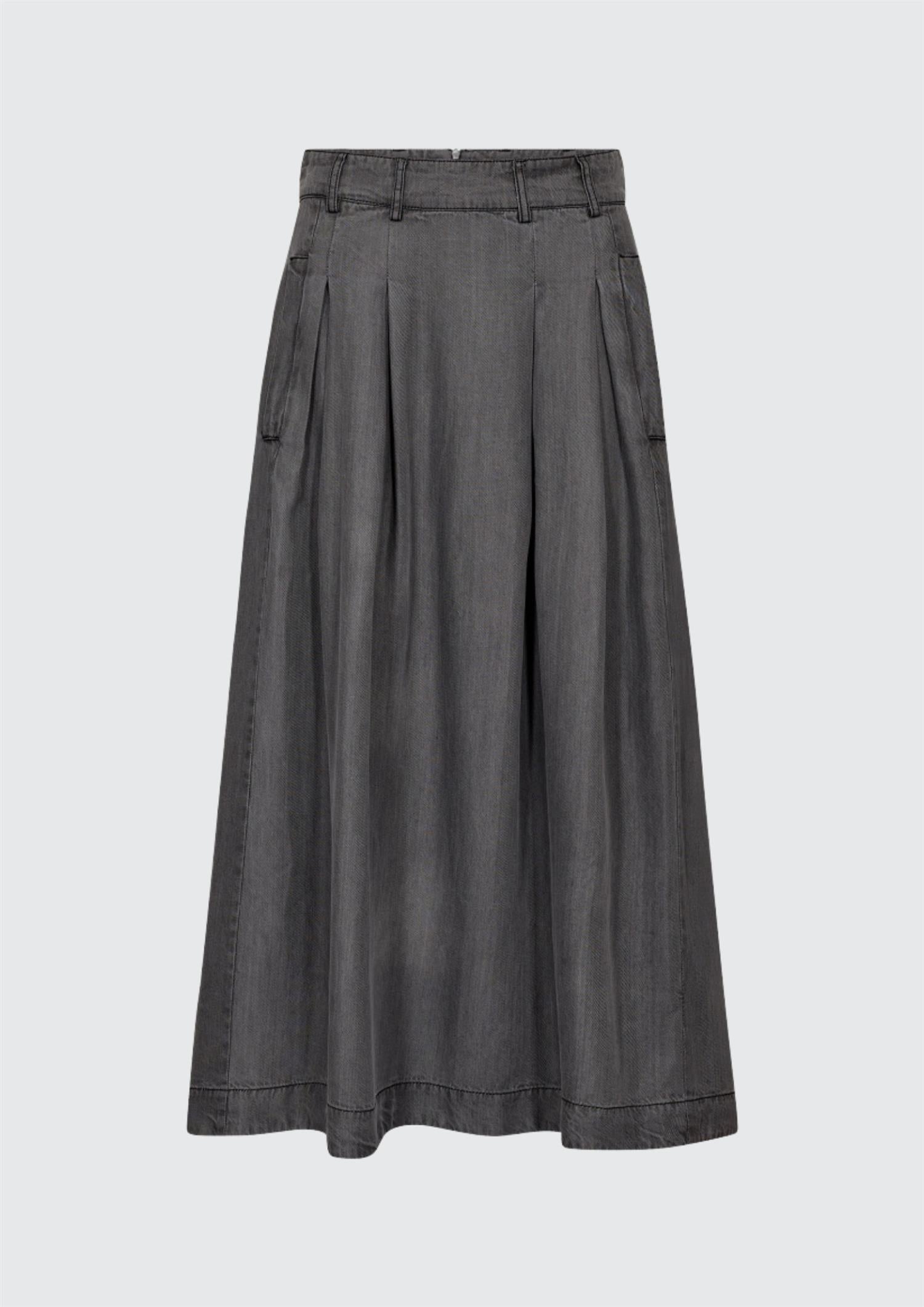BESKRIVELSE: Stilig skjørt med beltehemper og legg i front. Romslige sidelommer og skjult glidelås bak, gjør skjørtet både kult og praktisk.