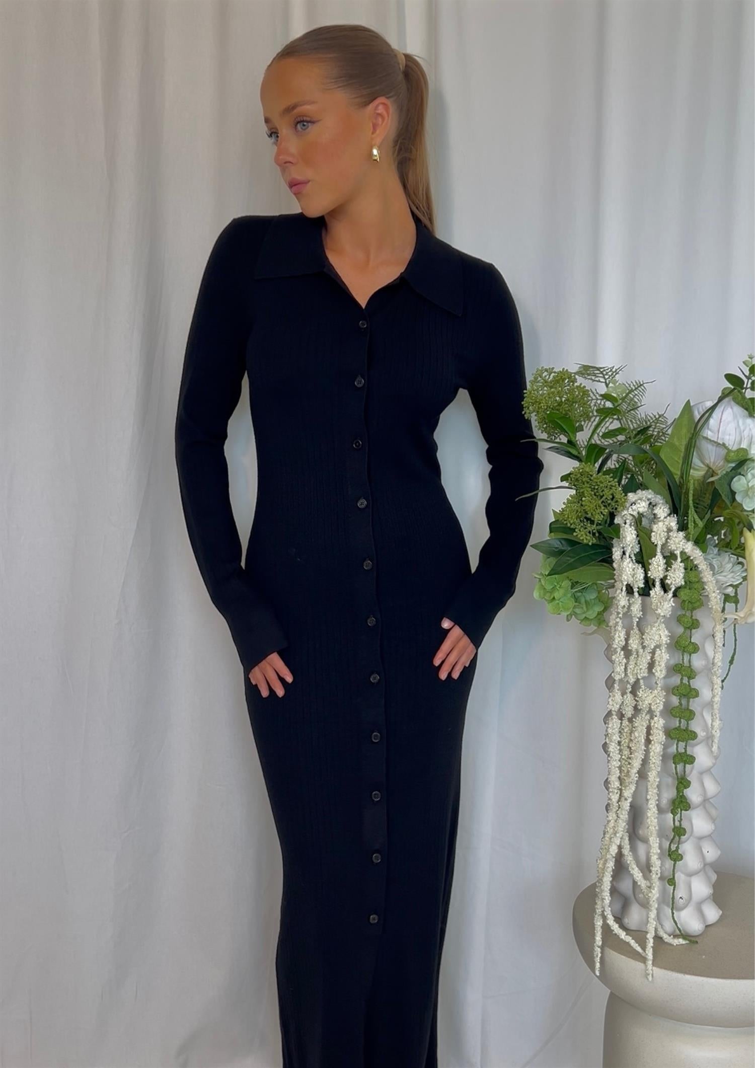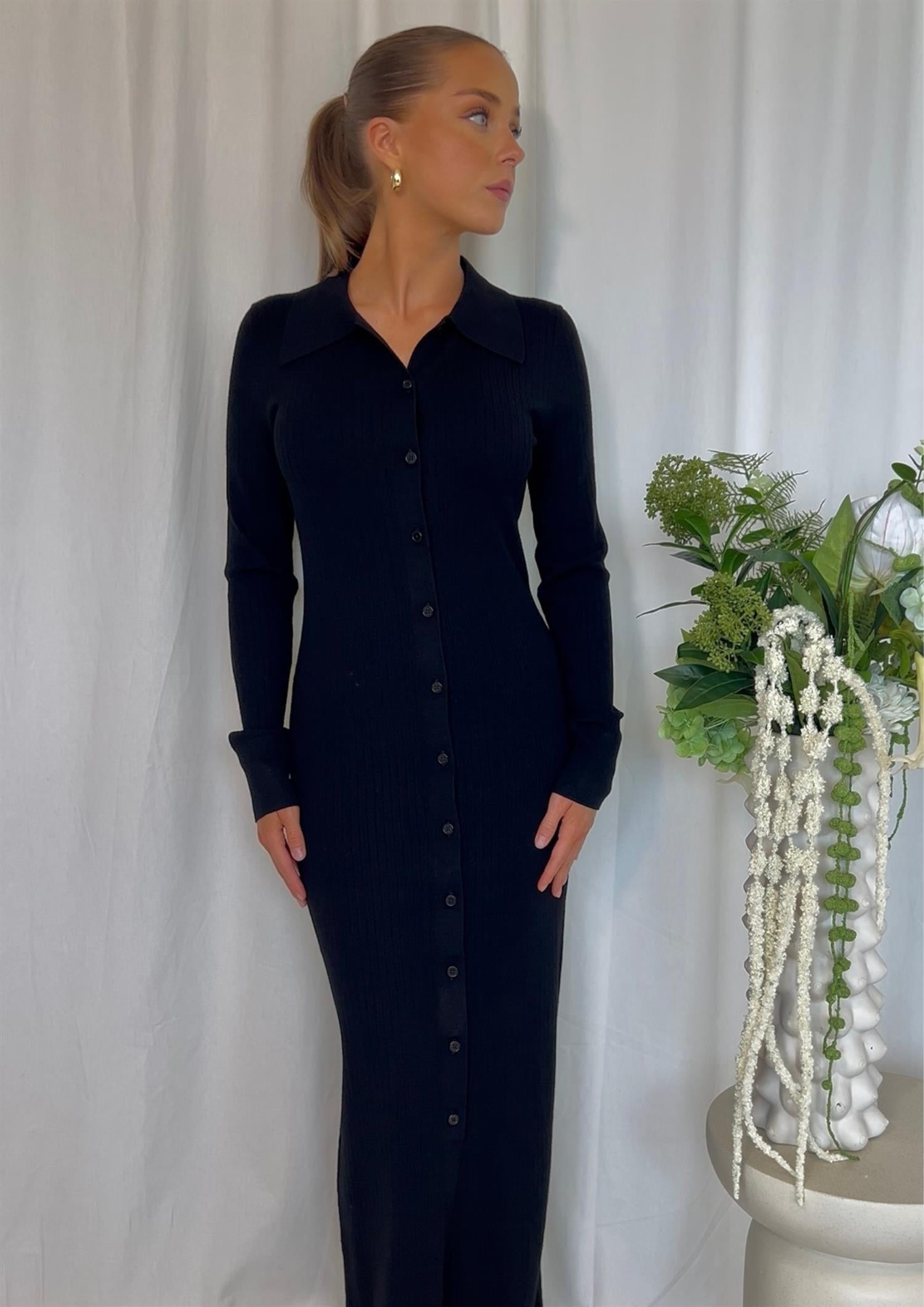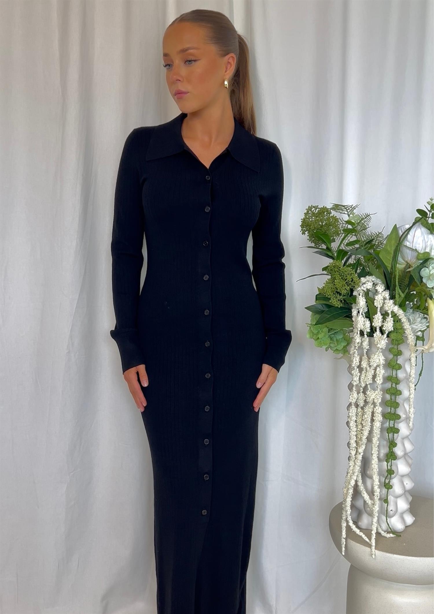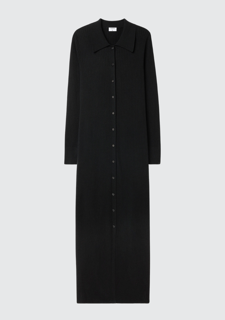Beskrivelse: Denne elegante, figurnære kjolen fra Filippa K kombinerer tidløs minimalisme med moderne detaljer. Kjolen er laget i et mykt og elastisk ribbestrikket materiale som smyger seg flatterende rundt kroppen. Den har klassisk skjortekrage, lange ermer og knapper hele veien ned, noe som gir deg mulighet til å style den akkurat slik du vil – lukket for en sofistikert look, eller litt åpen for en mer avslappet stil.