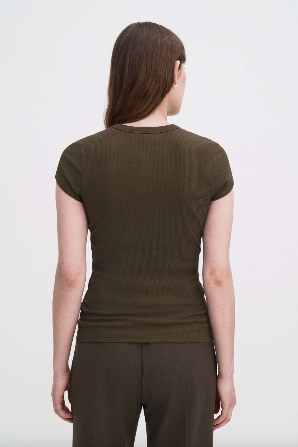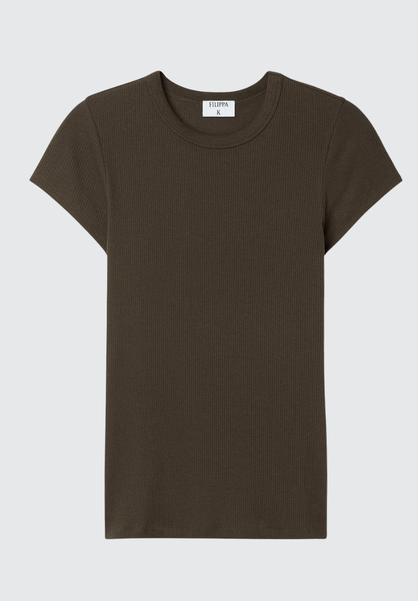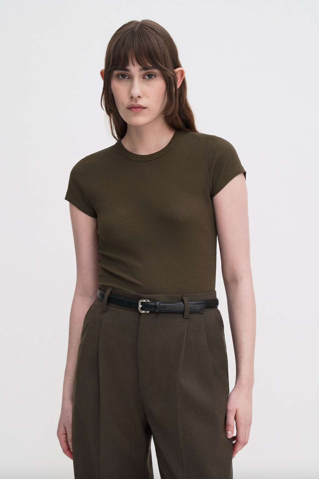 Beskrivelse: Fine Rib T-skjorten i sort er laget av organisk stretchbomull, med rund hals og korte ermer. Legg den i lag under blazere, skjorter og strikkevarer, eller bruk den alene med skreddersydde bukser og denim. Nydelig og myk kvalitet!