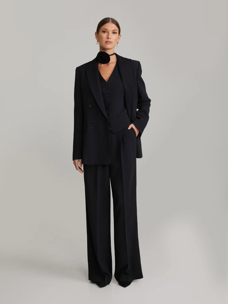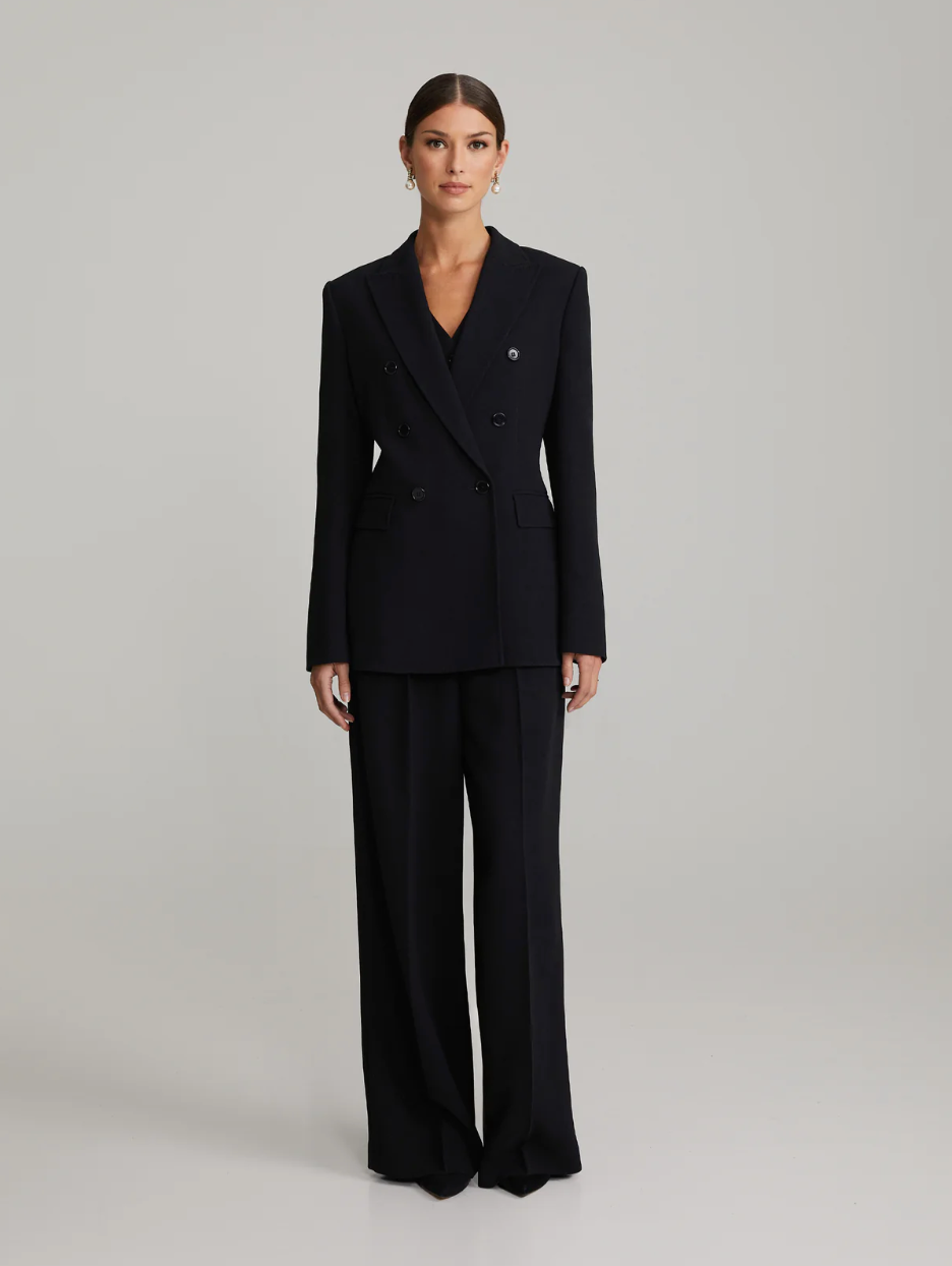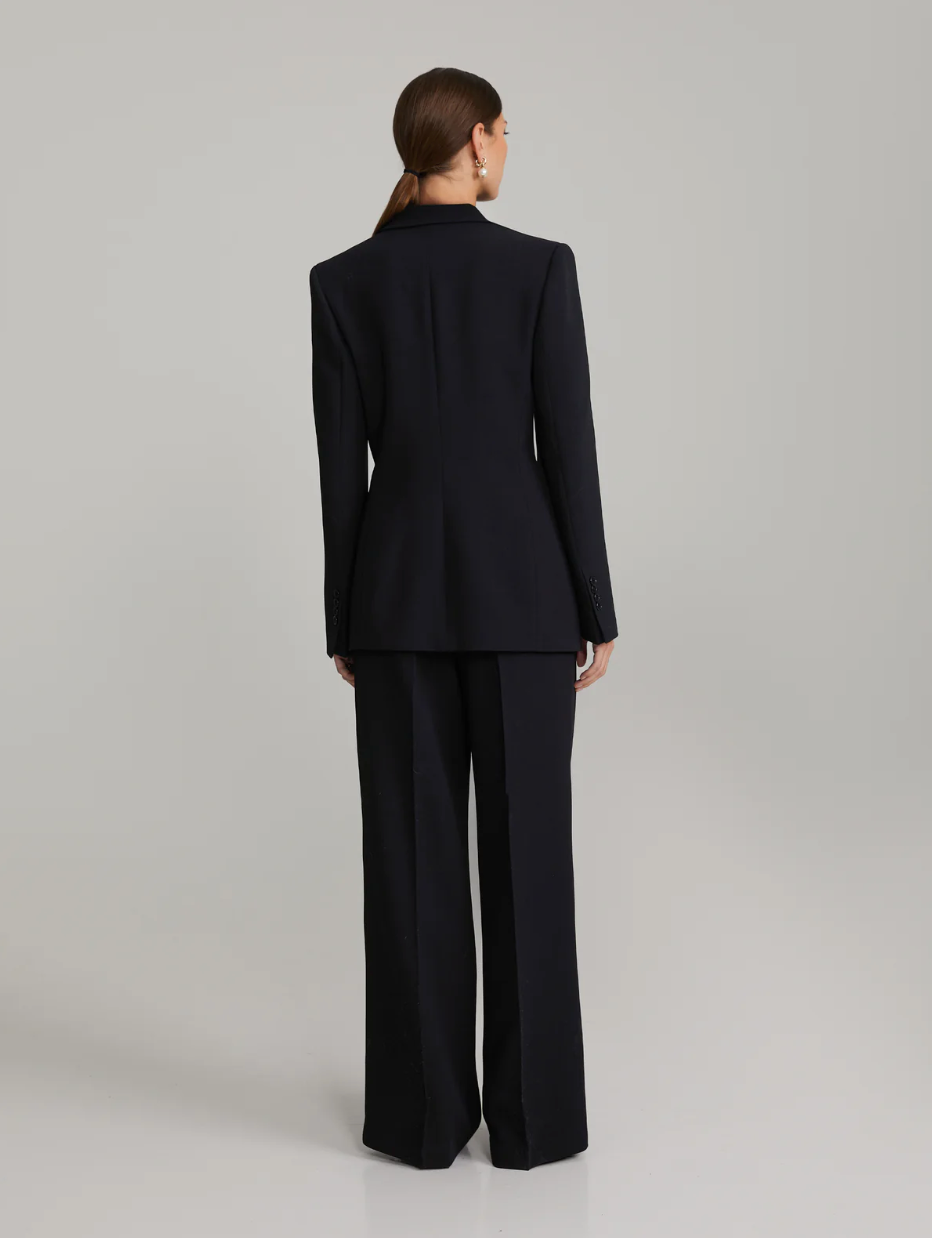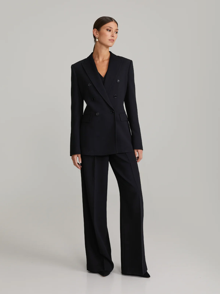 Beskrivelse: Fantastisk fin dobbeltspent blazer fra Andiata i sort. Jakken er skreddersydd for kroppen og er utrolig flatterende på da den sitter så fint i ryggen. Jakken har håndsydde sømmer, to lommer i front og går perfekt sammen med Gytta Trouser i samme serie. En utrolig vakker og tidløs dress.