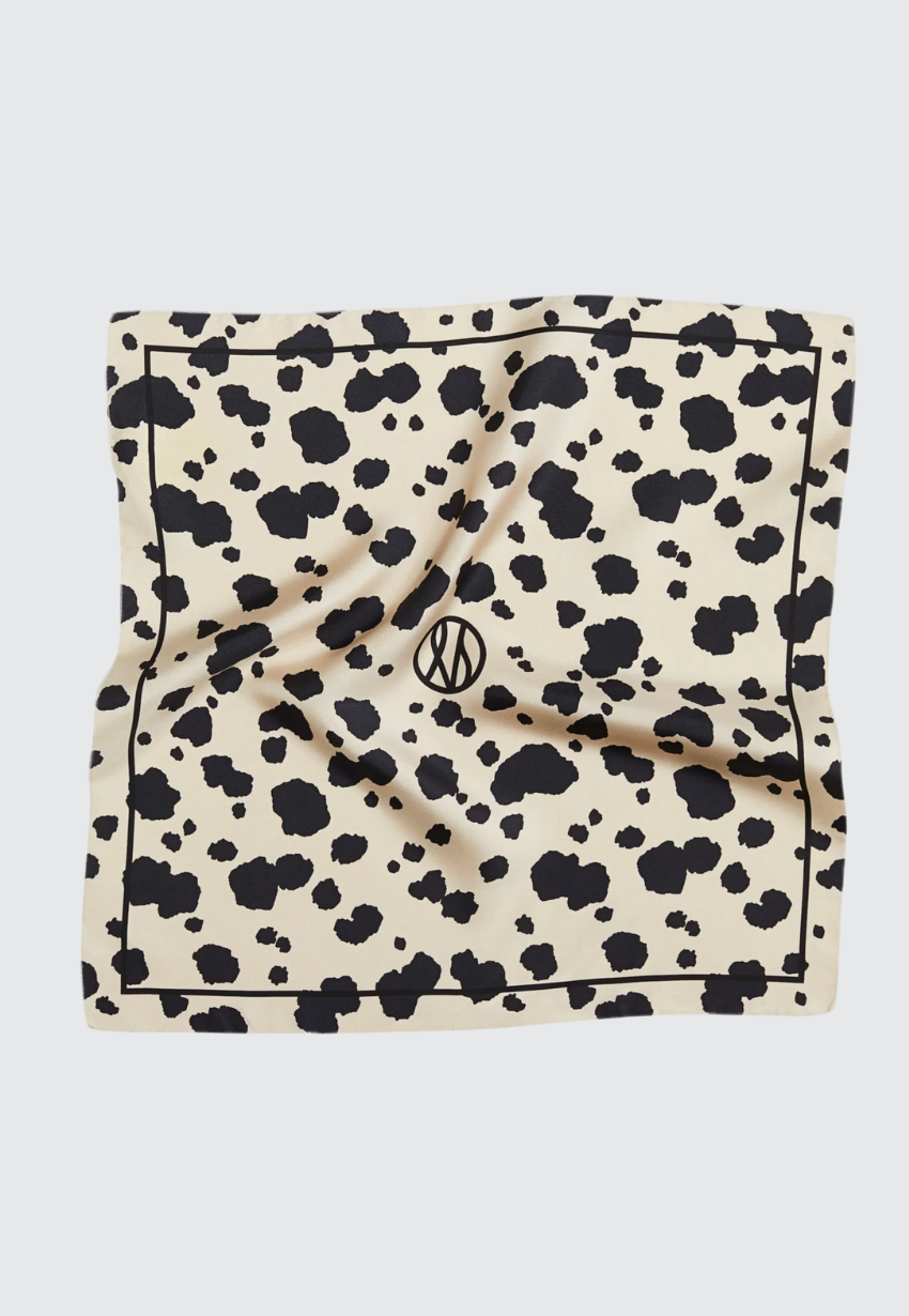 BESKRIVELSE: Silkeskjerf fra LeScarf i cream og sort dalmatin-mønster.
