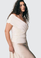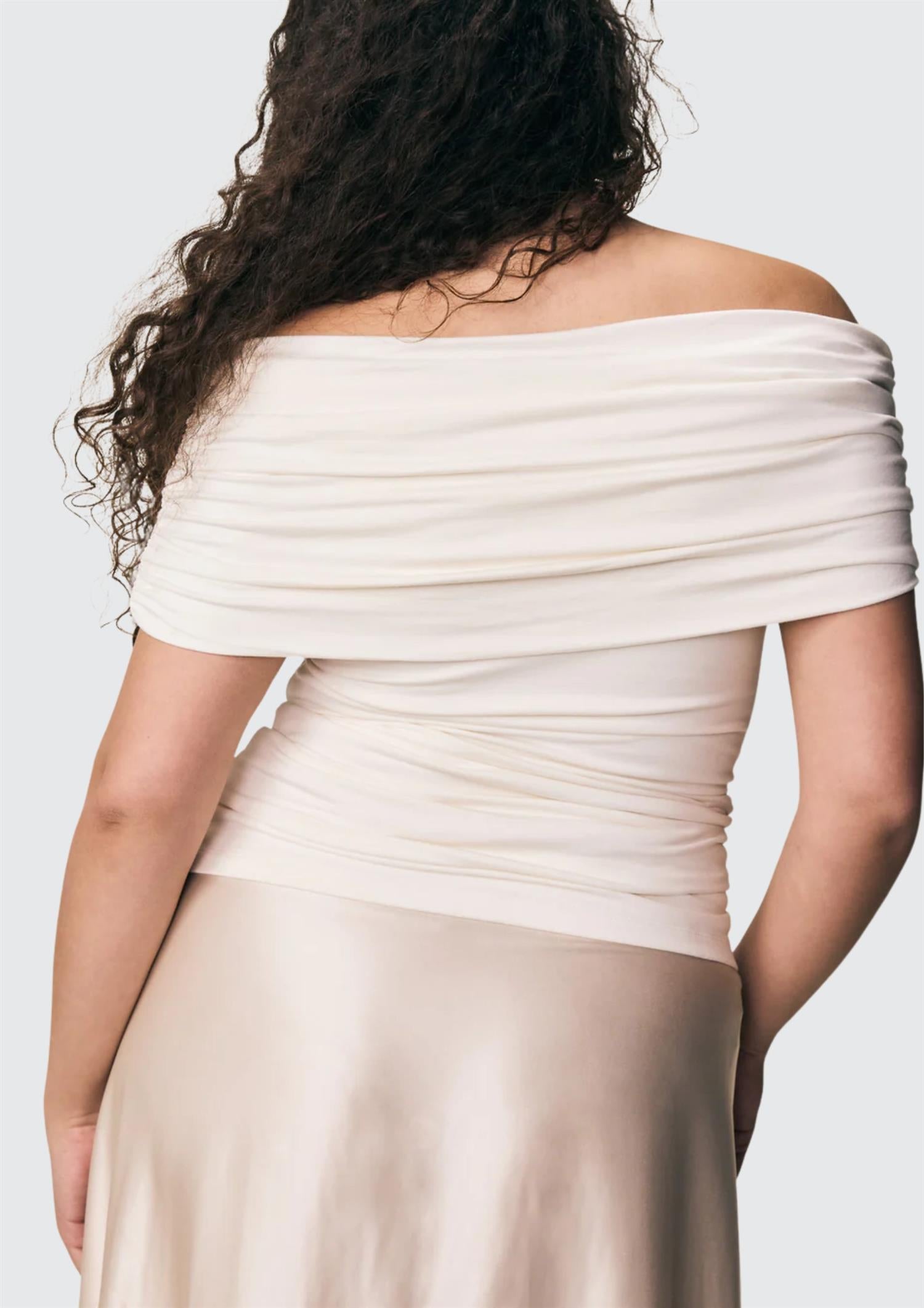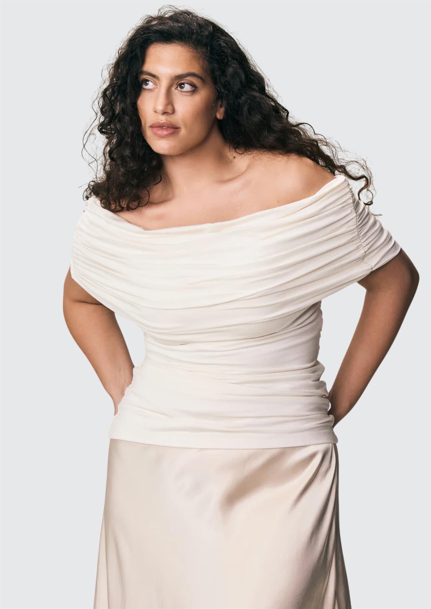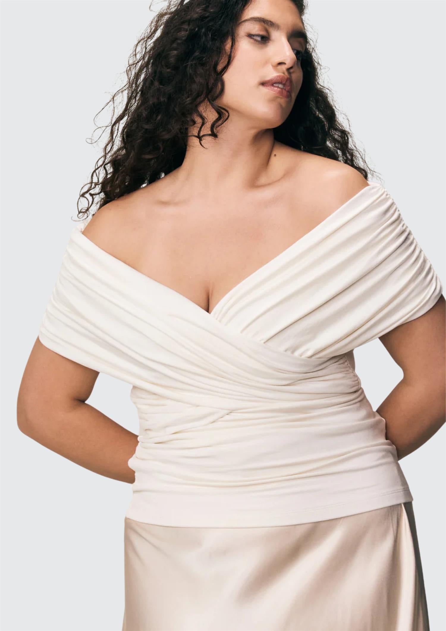 Beskrivelse: Giada har et drapert, off-shoulder snitt som danner en vakker omslagseffekt over brystet – perfekt som kveldstopp, men like fin til hverdags. Den er laget i VIVEH sin signatur-jersey av ECOVERO™-viskose, sitter tett og fremhever silhuetten elegant. Giada-toppen kan brukes begge veier for to ulike utringninger, og er dobbeltfôret for ekstra støtte.