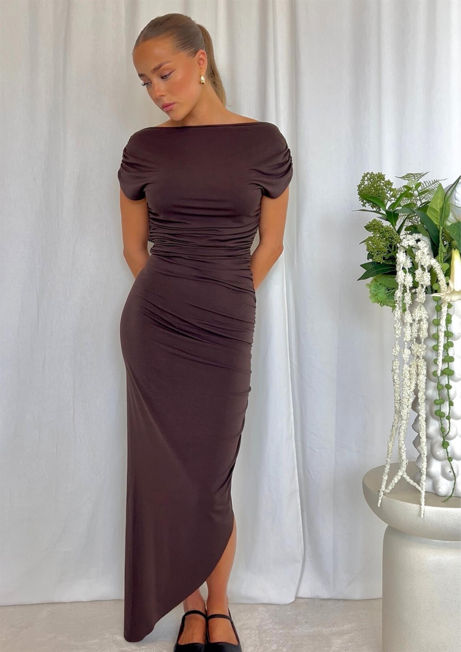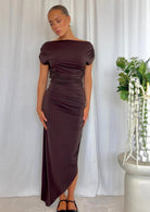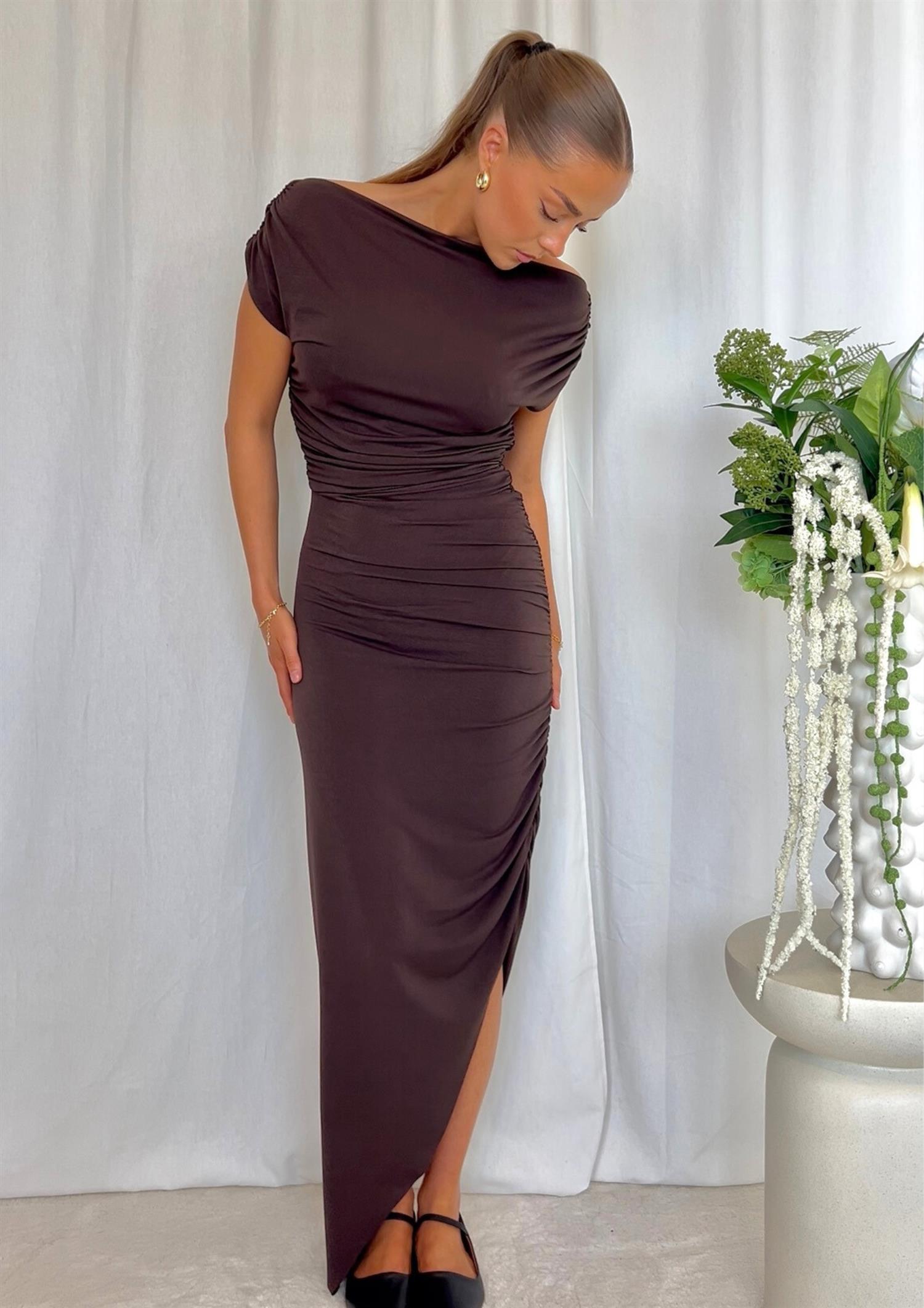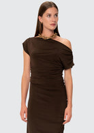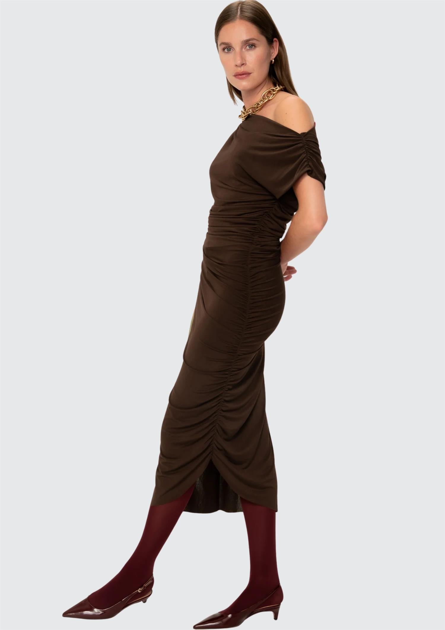 BESKRIVELSE: VIVEH Columbine er en asymmetrisk maxikjole som kombinerer en kroppsnær passform rundt midje og hofter med en drapert og luftig overdel. Den brede båthalsen gir fleksible stylingmuligheter, da du kan bære den både på eller av skuldrene. Rynkede skuldre og sidesømmer skaper elegante folder som fremhever kroppens naturlige linjer.