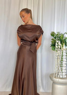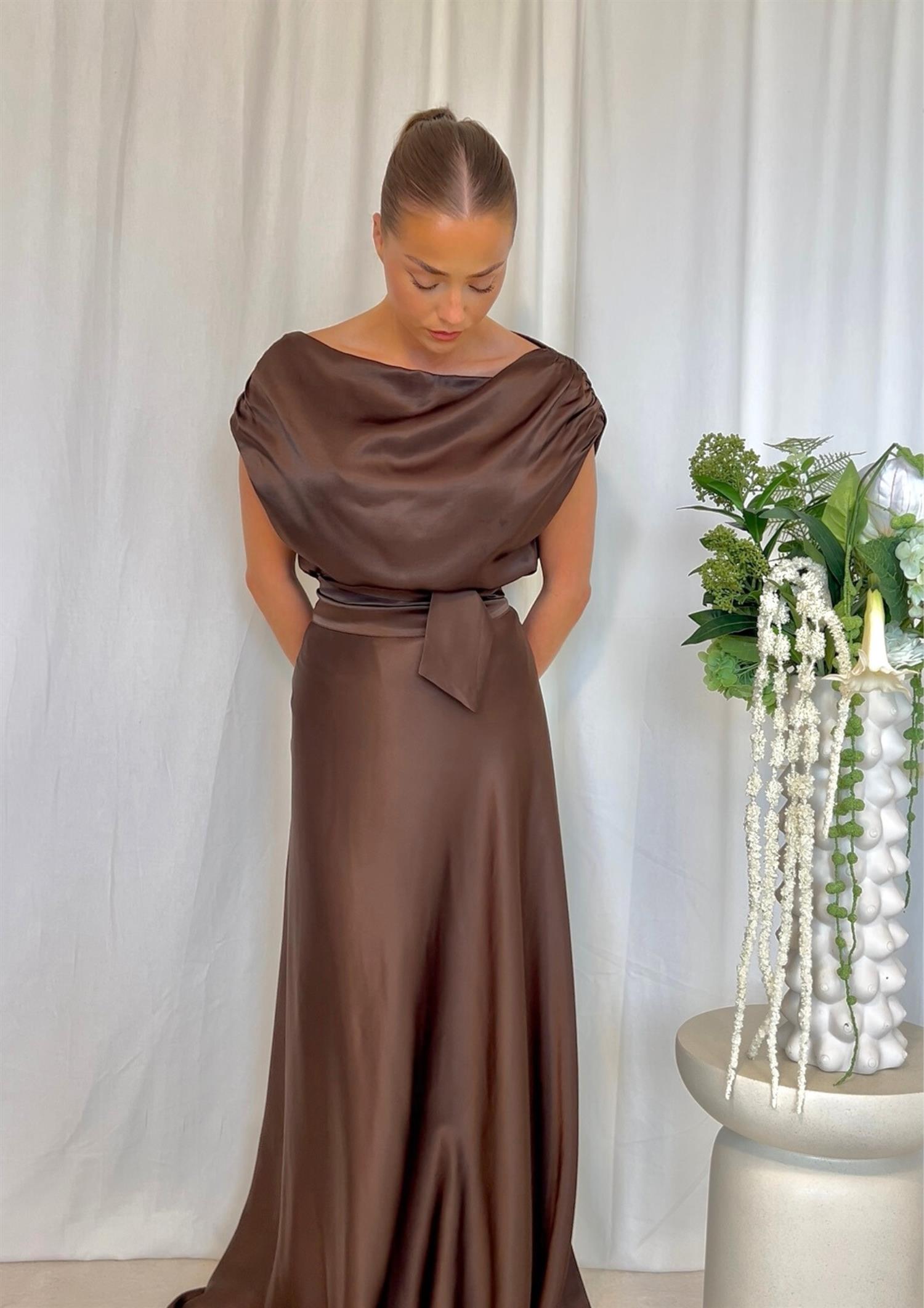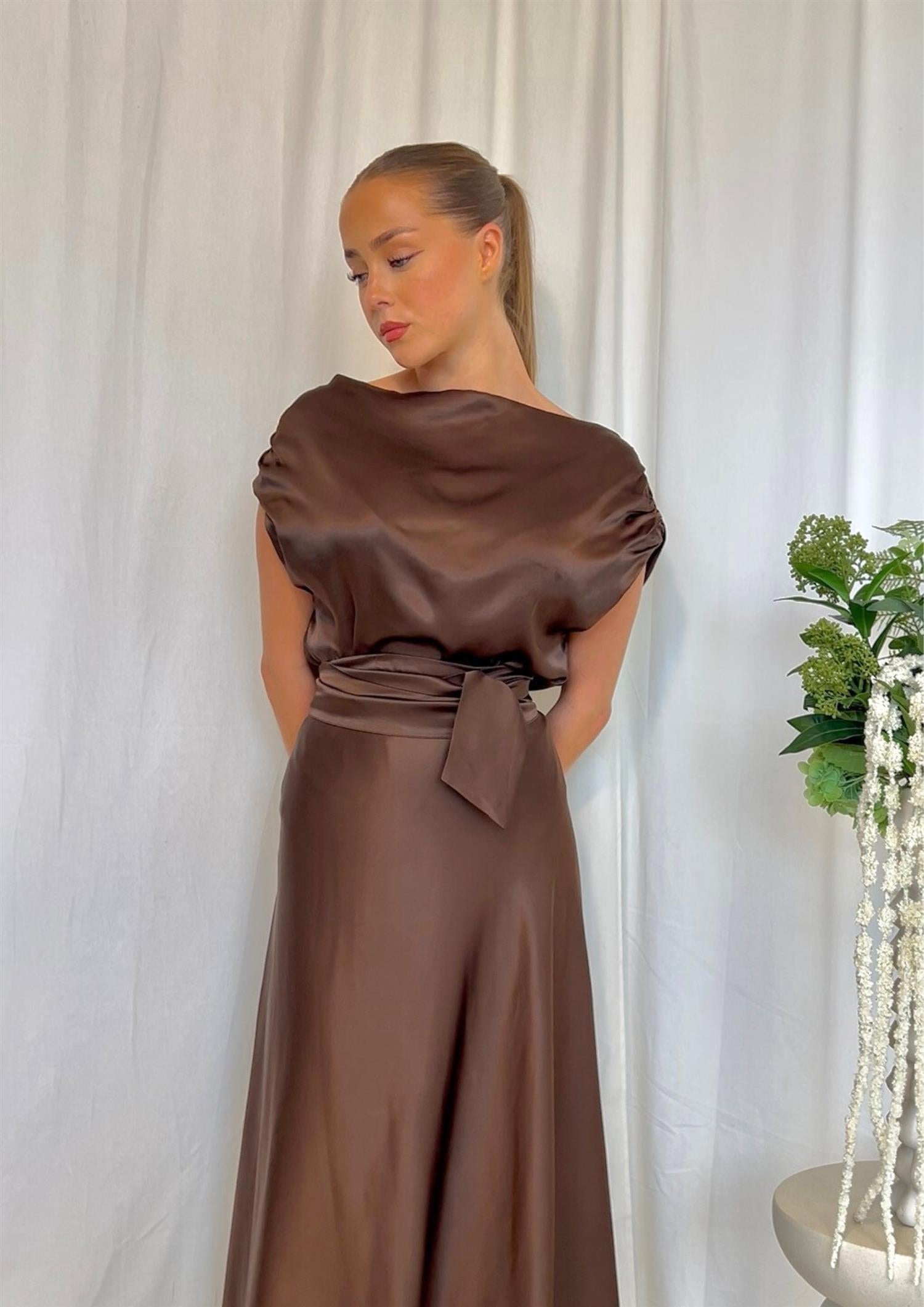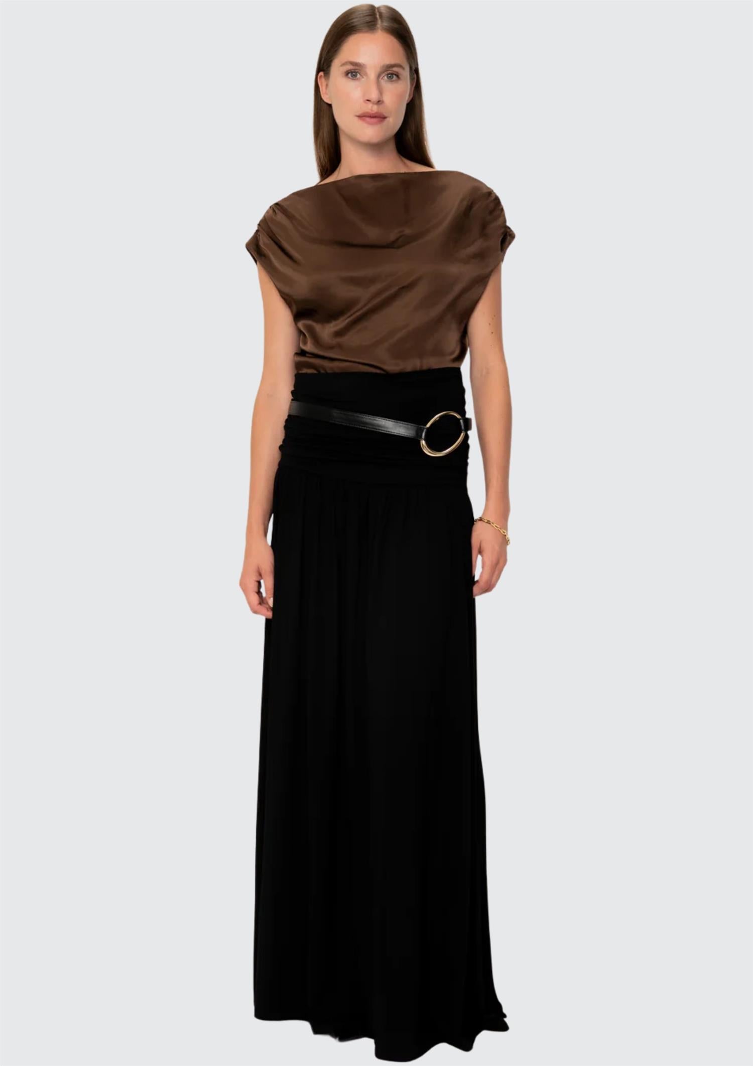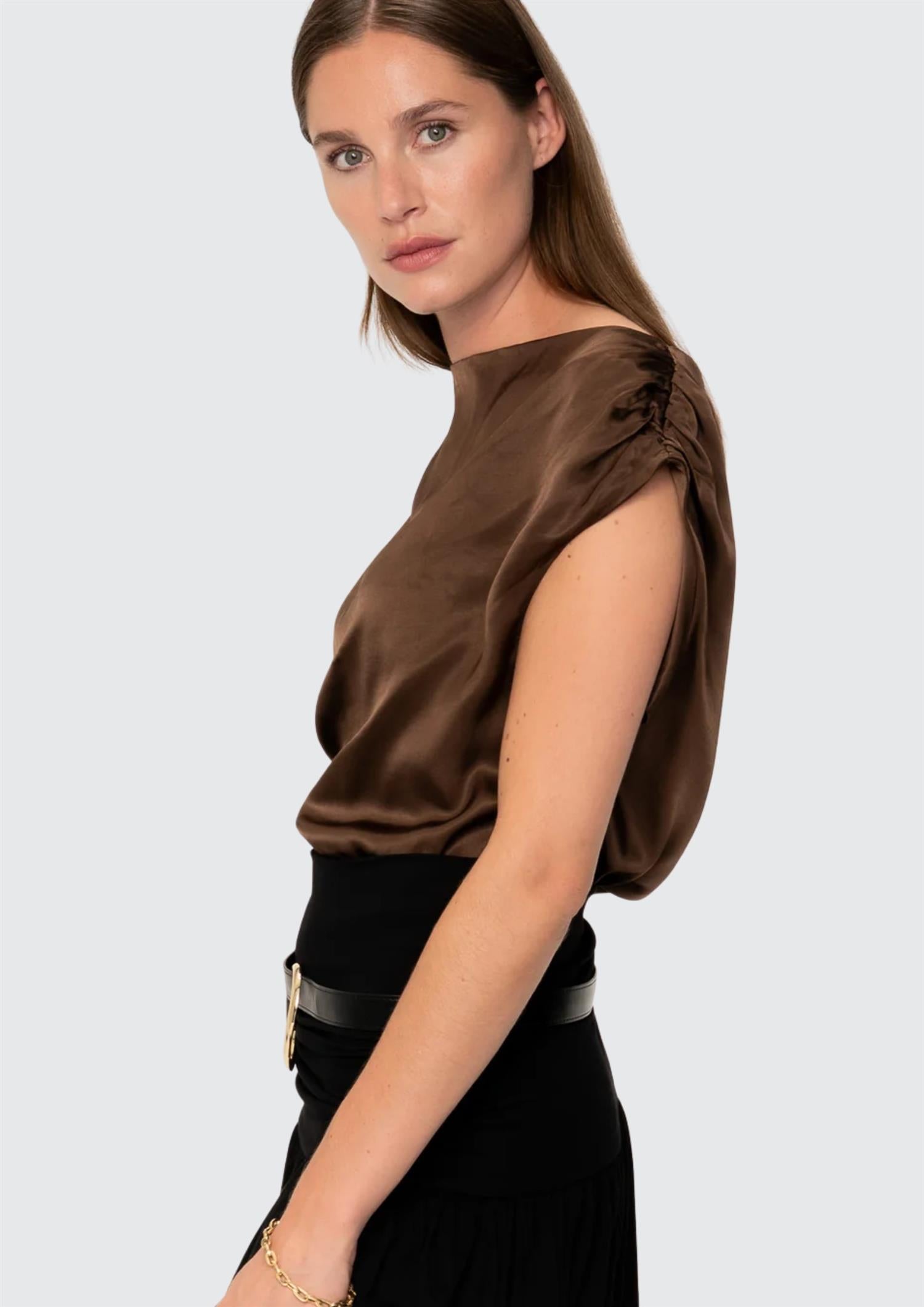 BESKRIVELSE: Adhara Top fra Viveh er en stilren ermeløs topp i en klassisk brunfarge med en elegant, shiny overflate. Toppen har en sofistikert båthals og delikate rynkedetaljer over skuldrene som gir et feminint uttrykk. Modellen er ledig og behagelig, laget i et solid og luksuriøst stoff som faller vakkert langs kroppen. Små splitter i sidene gir ekstra bevegelsesfrihet og stil.