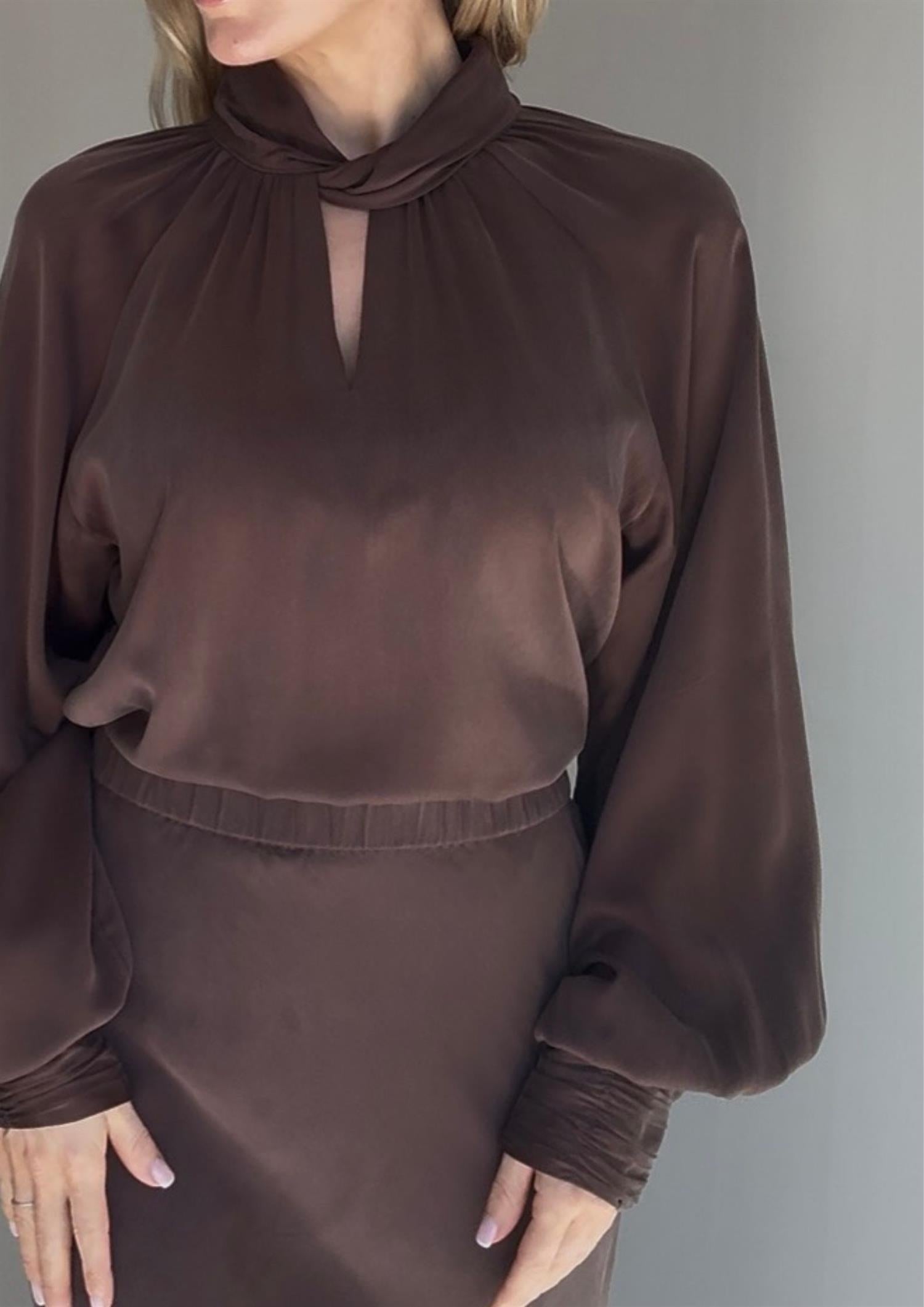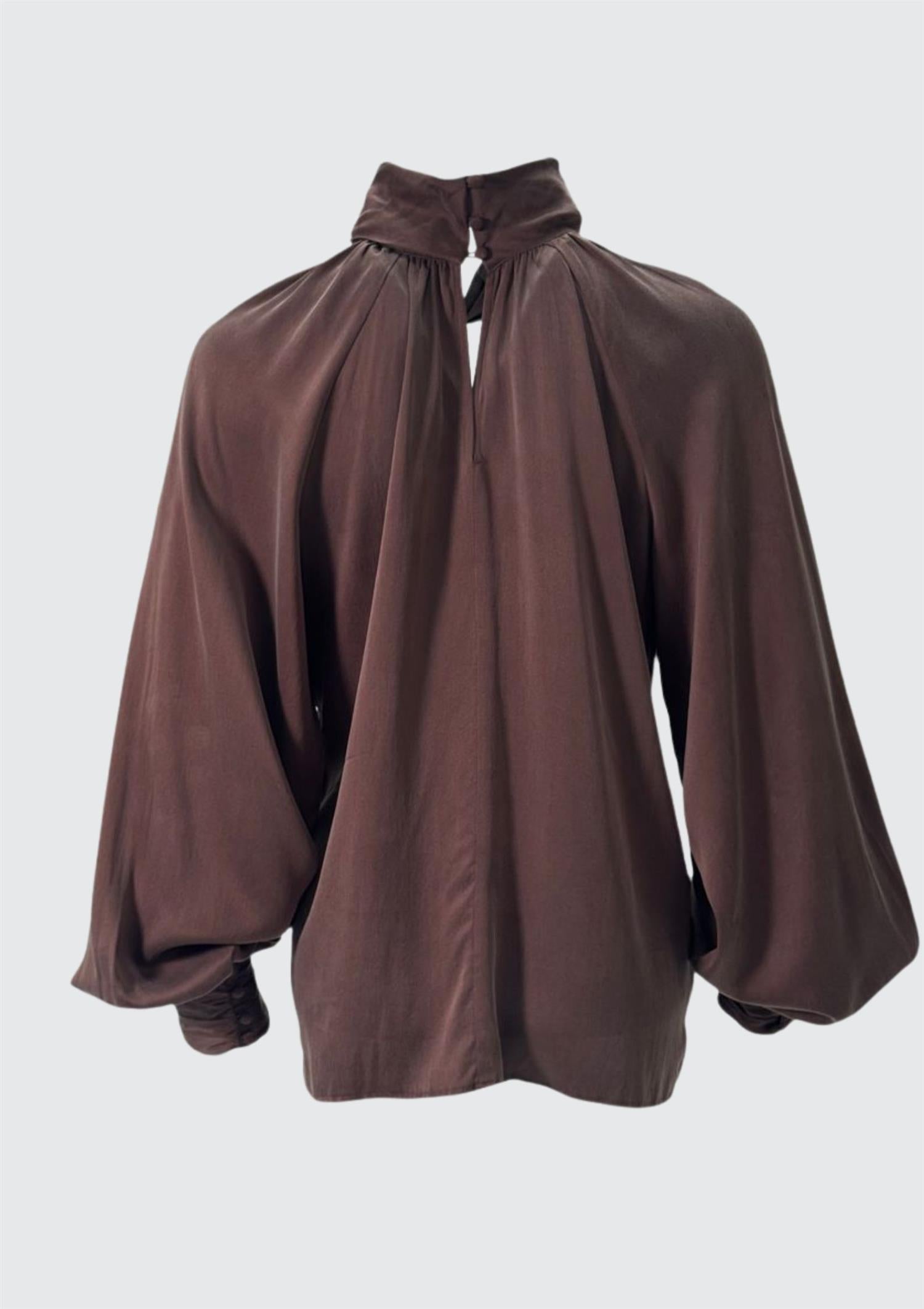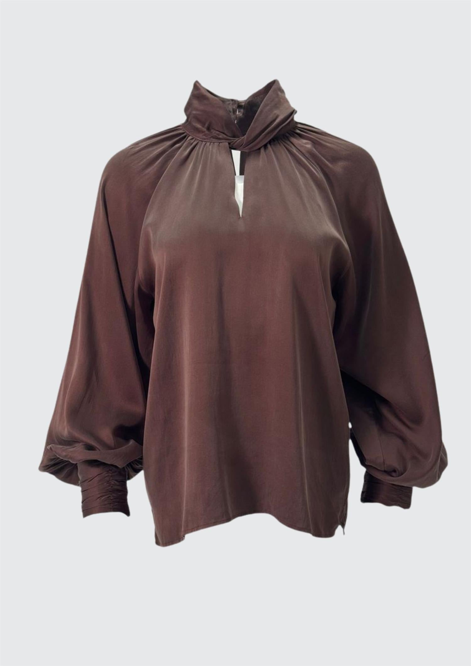 Beskrivelse: Nydelig silkebluse fra Amuse. Blusen har en halvhøy hals med en knute i front for en ekstra fin detalj. Blusen er i 100% silke med noe stretch og lang mansjett med trukket knapper.