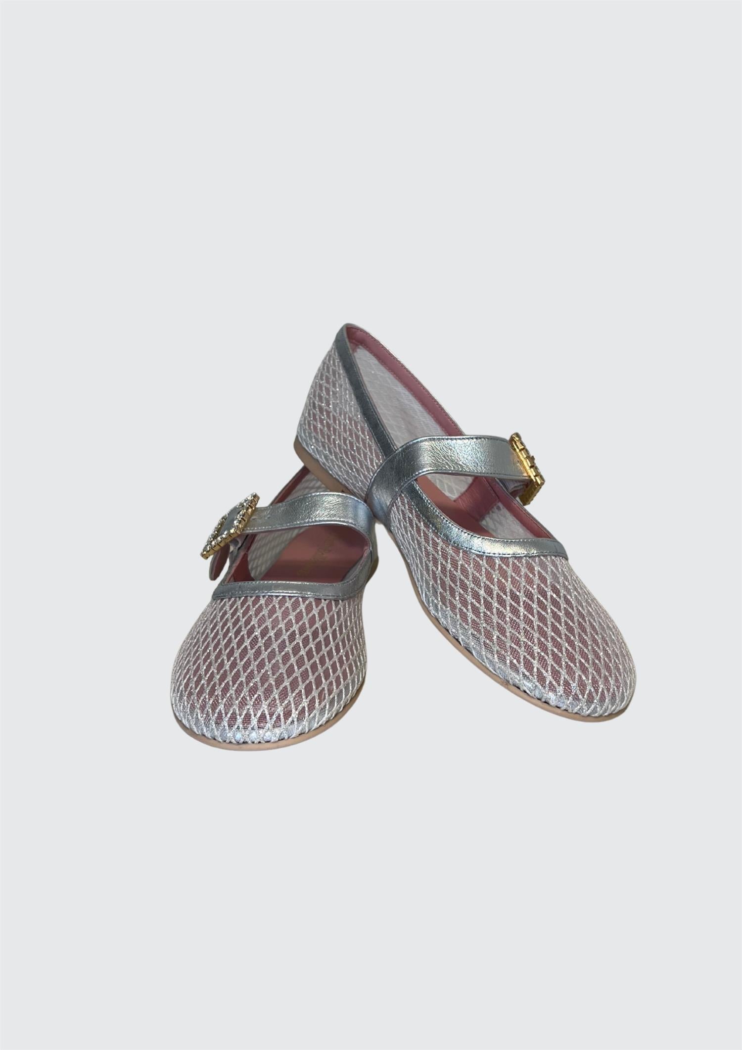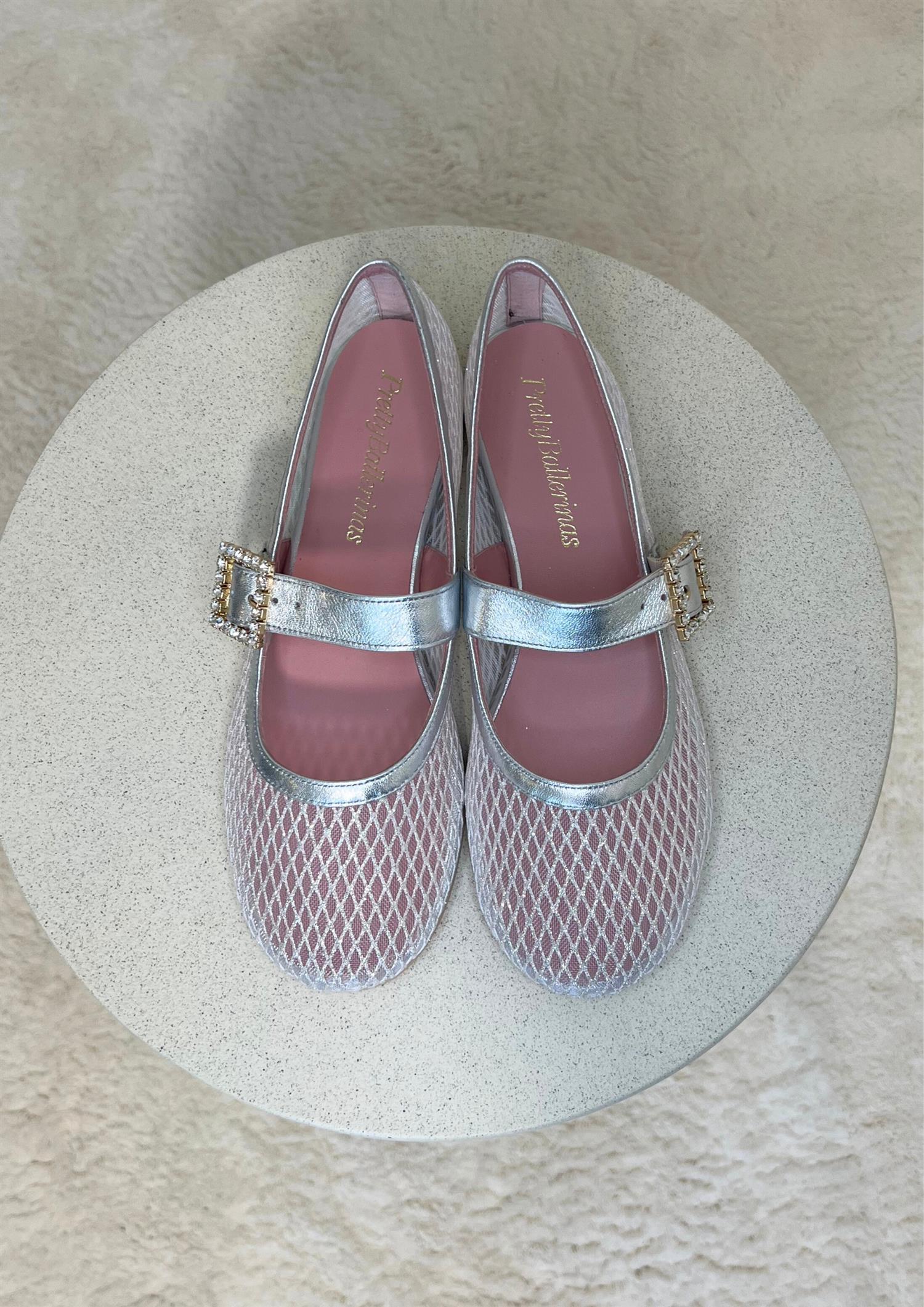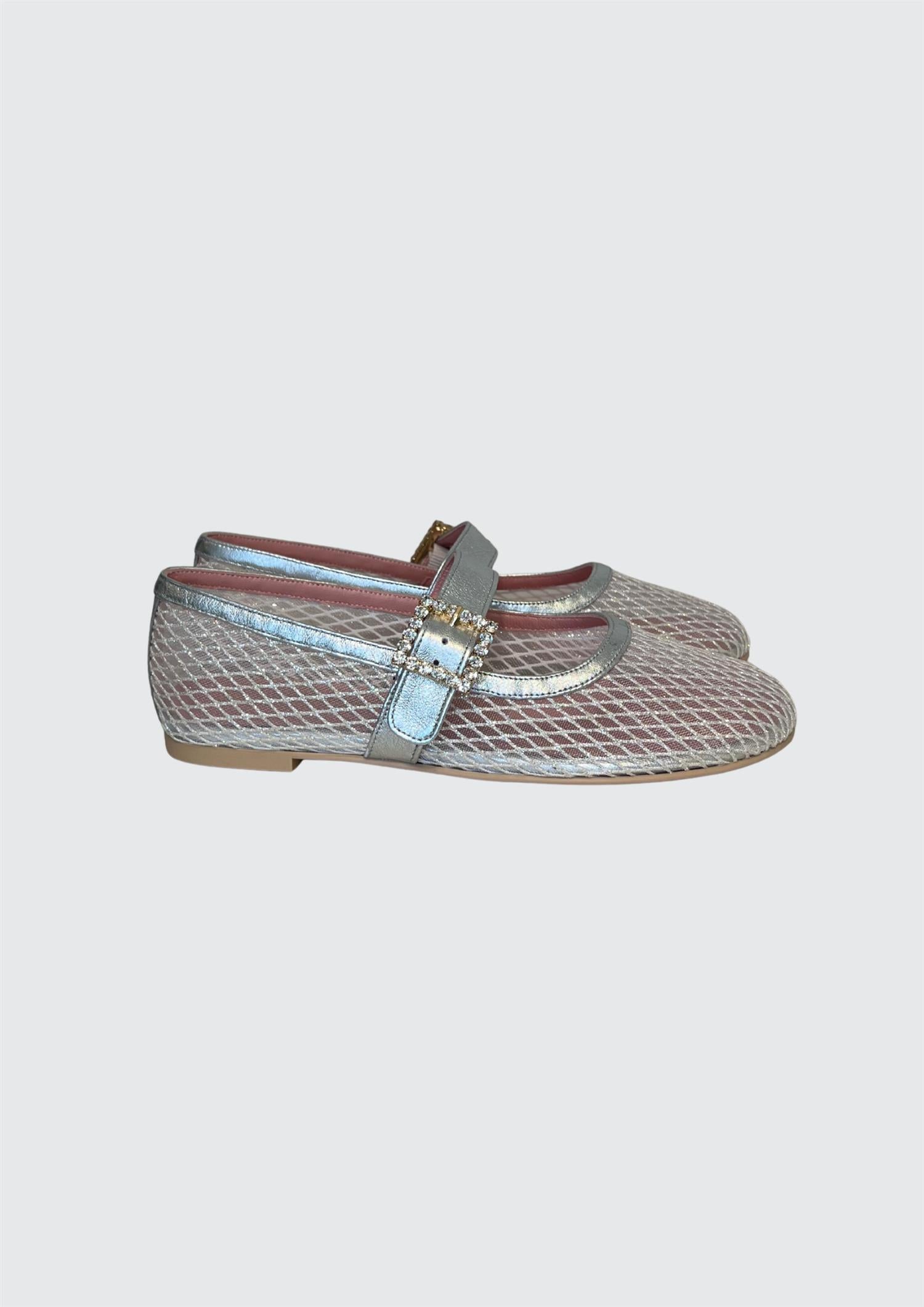 BESKRIVELSE: Ballerinasko i sølv netting og myk sølv semsket rem med krystallspenne. Sklisikker såle. Innersåle i skinn.
