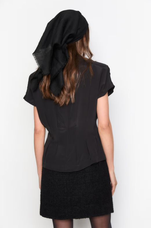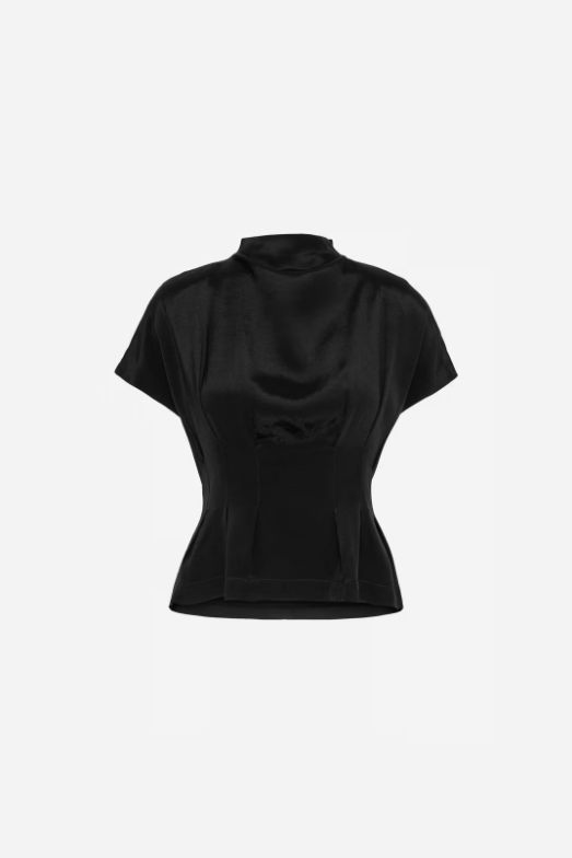 Beskrivelse: June Blouse er et vakkert skreddersydd plagg med korte ermer og en tettsittende midje fremhevet av elegante leggdetaljer både foran og bak. Den høye halsen er designet med en subtil fosseffekt, noe som gir et mykt, feminint fall som løfter silhuetten.