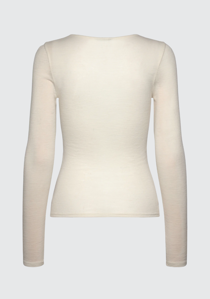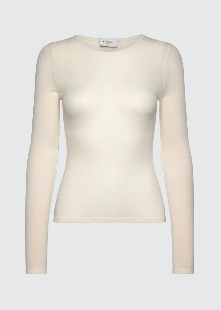Beskrivelse: Sara Cashmere Blend LS T-skjorte er en luksuriøs langermet T-skjorte laget av en myk blanding av 90 % ull og 10 % kasjmir. Den tidløse passformen og den lette varmen gjør den perfekt til lag-på-lag eller som et elegant garderobeklassiker.