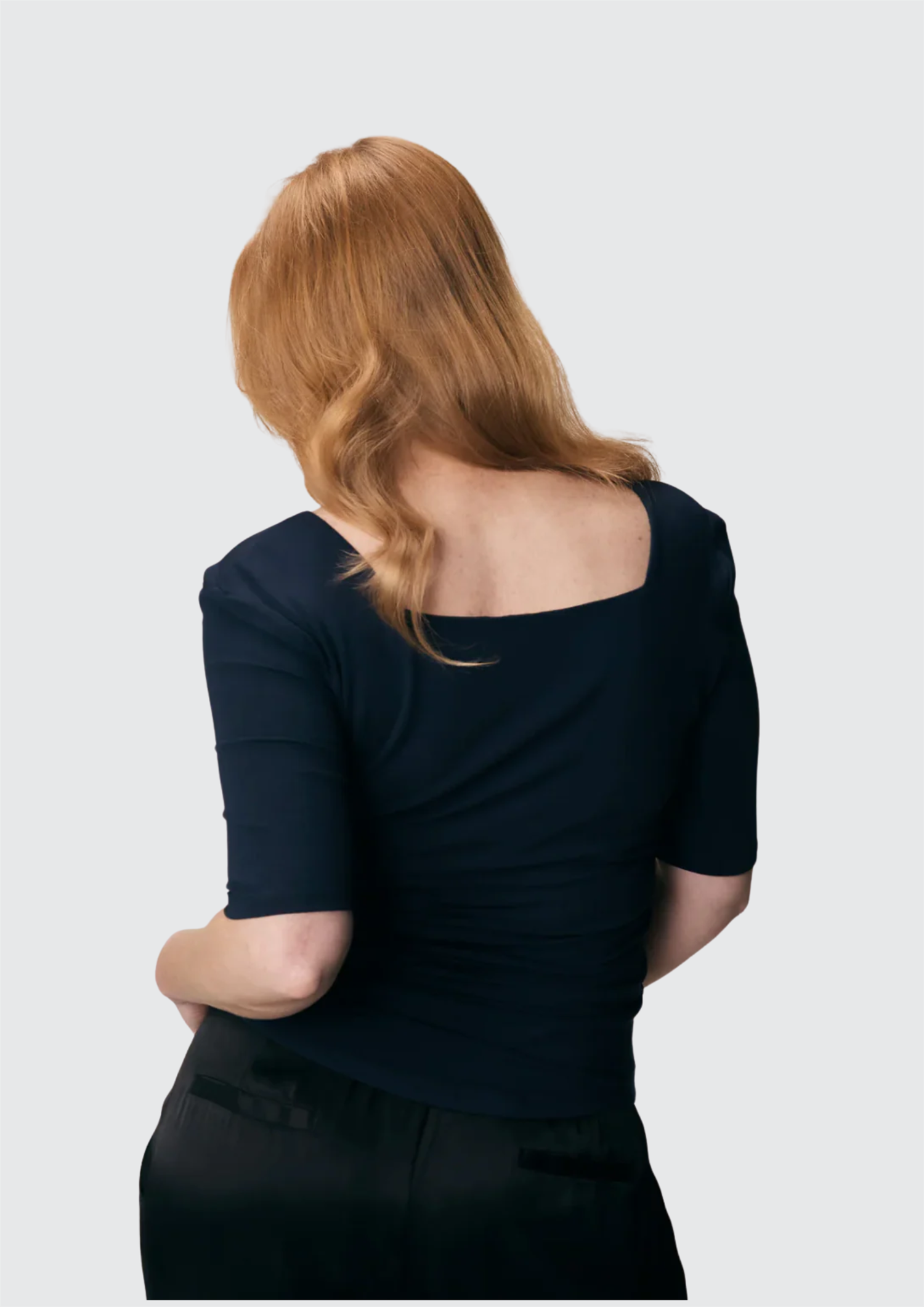 Toppen er vendbar og kan brukes på to måter – med en lav eller høyere firkantet utringning – og er et allsidig nøkkelplagg i garderoben som enkelt kan kombineres med alle våre underdeler. Den har premium kvalitet med dobbelt fôr for en gjennomført finish.