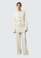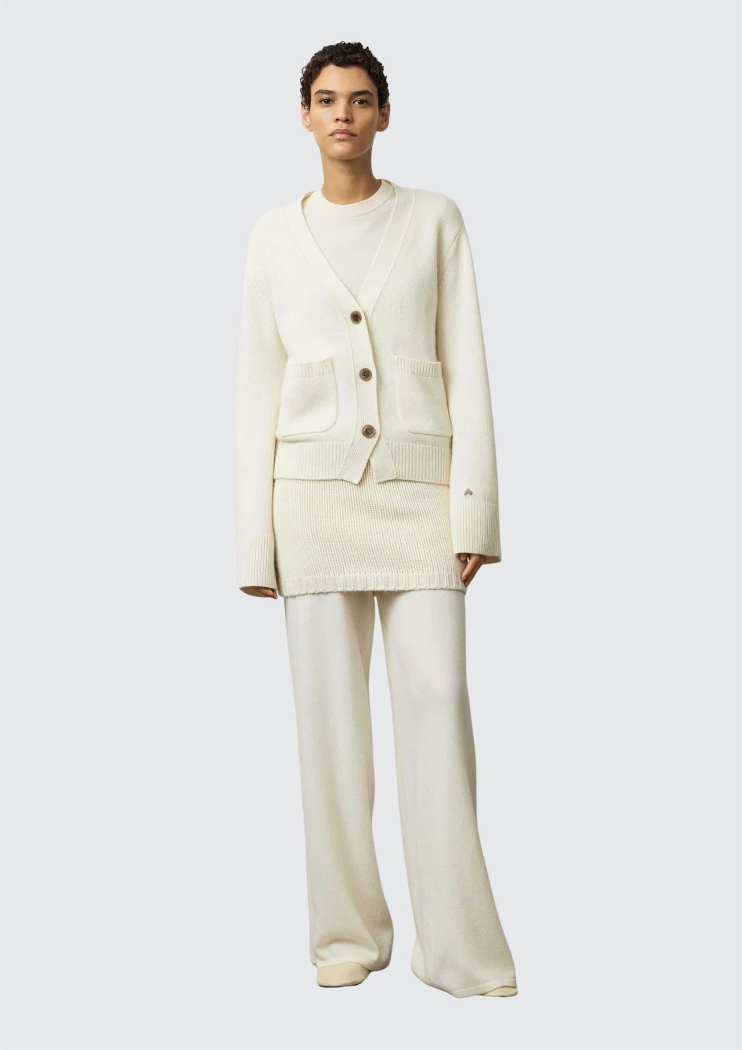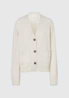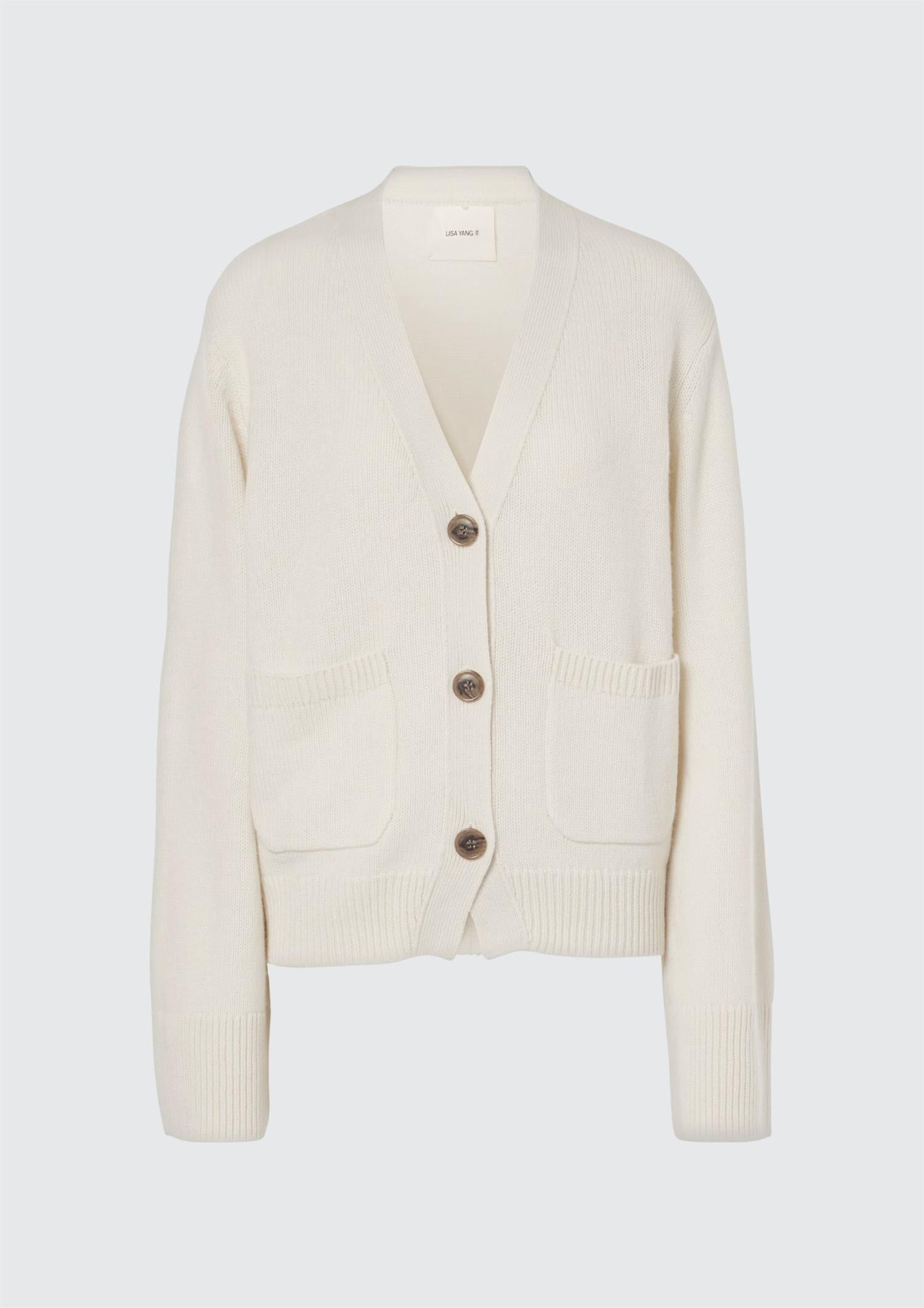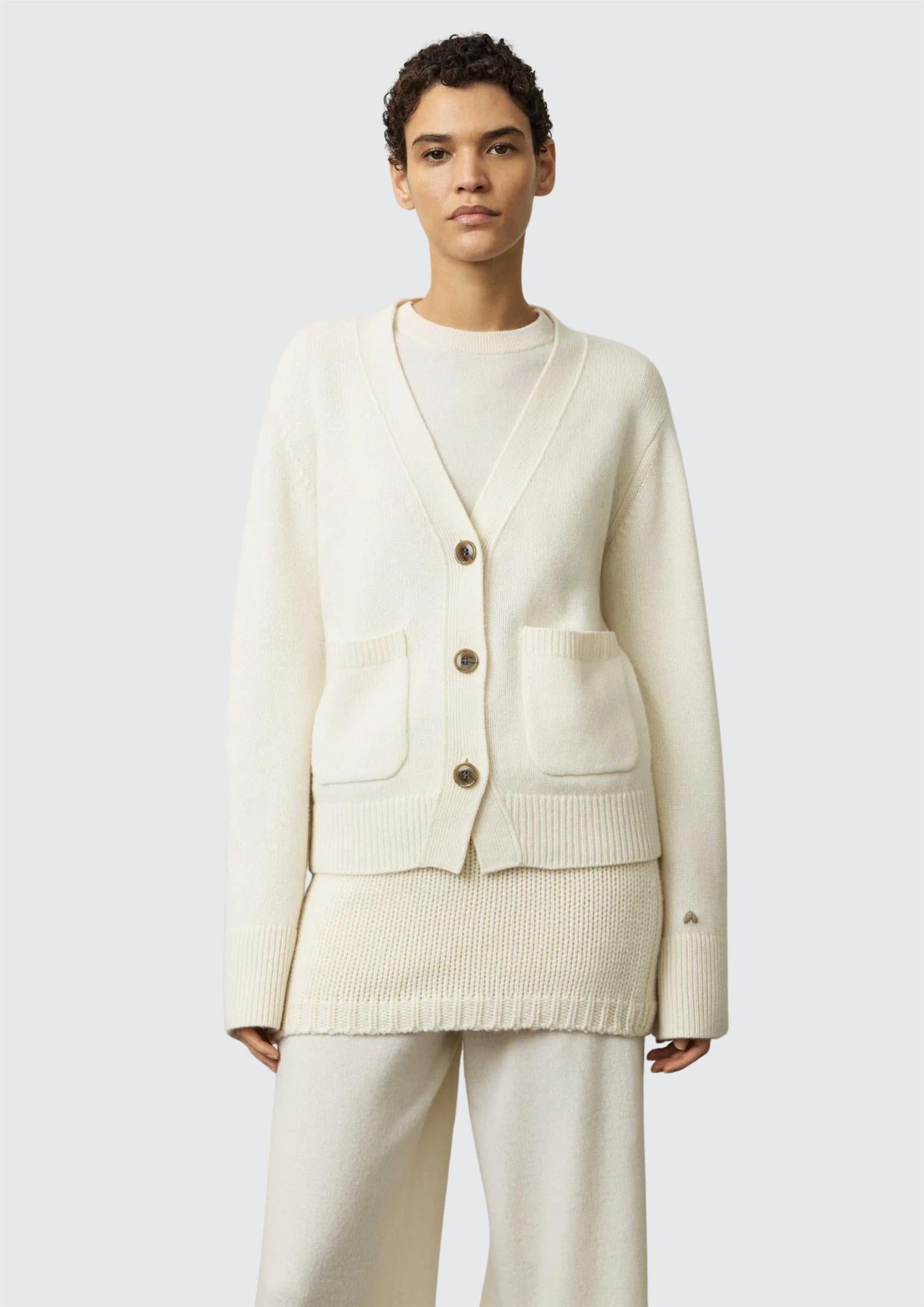 Beskrivelse: En fast garderobeklassiker, Danni-cardiganen er laget i 7-gauge, tungstrikket kasjmir som gir form og struktur. Den avslappede passformen og den rene silhuetten har en dyp v-hals, nedfalte skuldre, rette vide ermer, påsydde lommer og ribbestrikkede kanter.