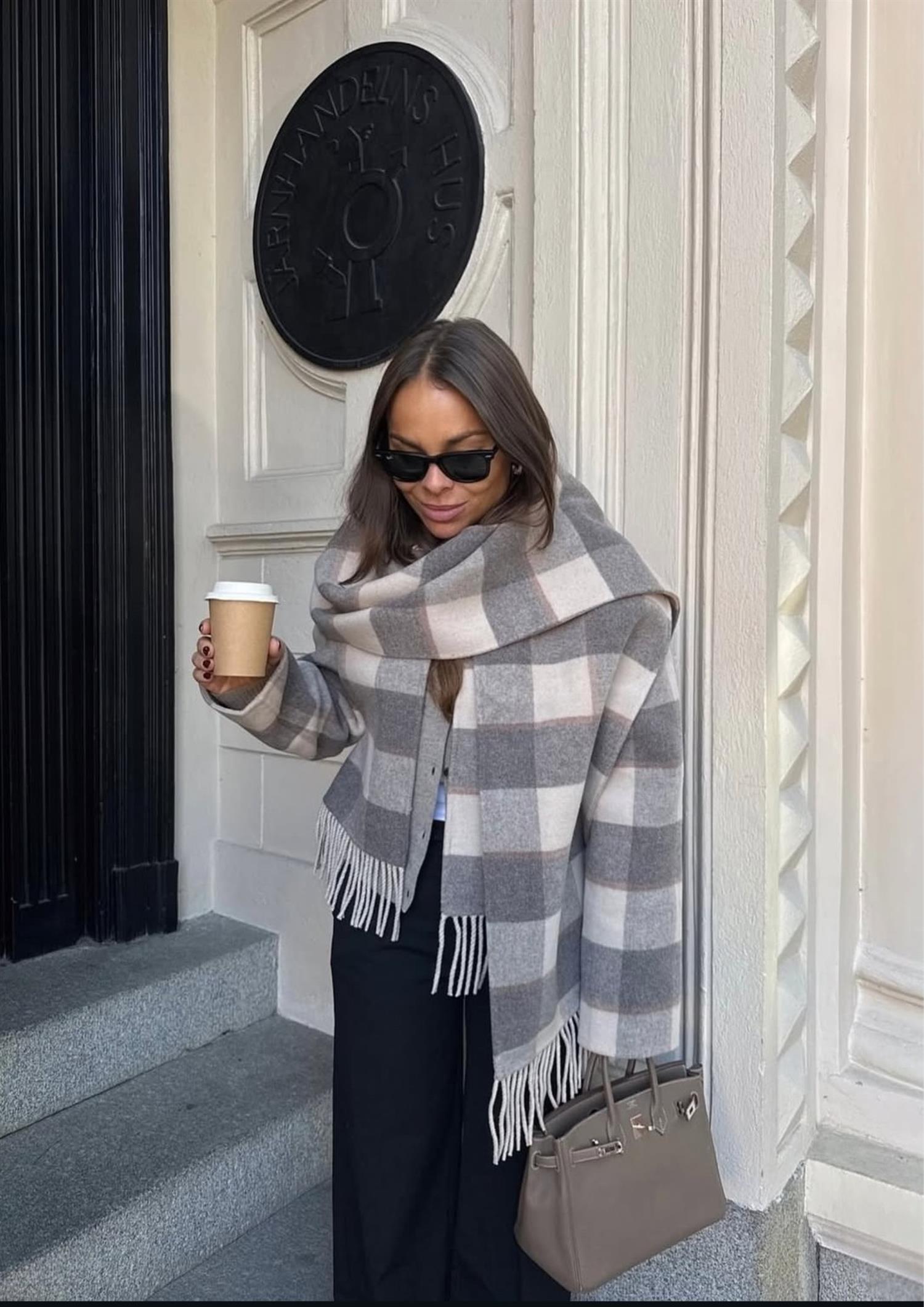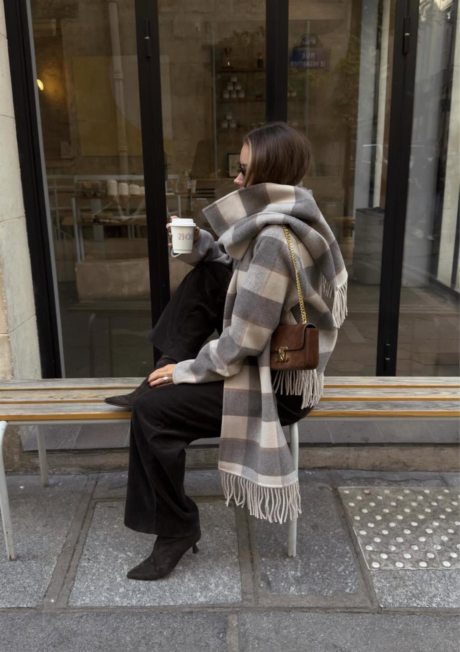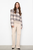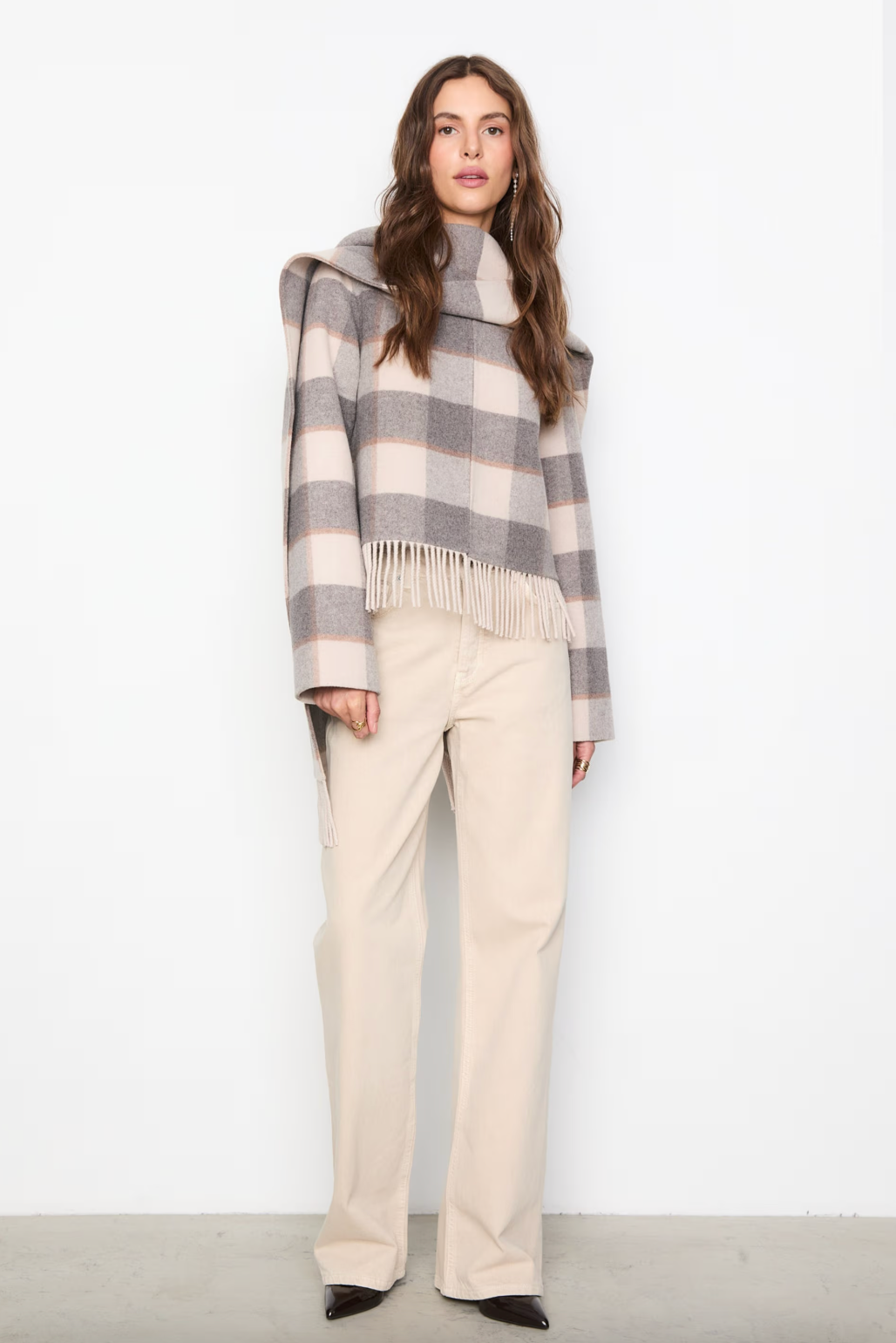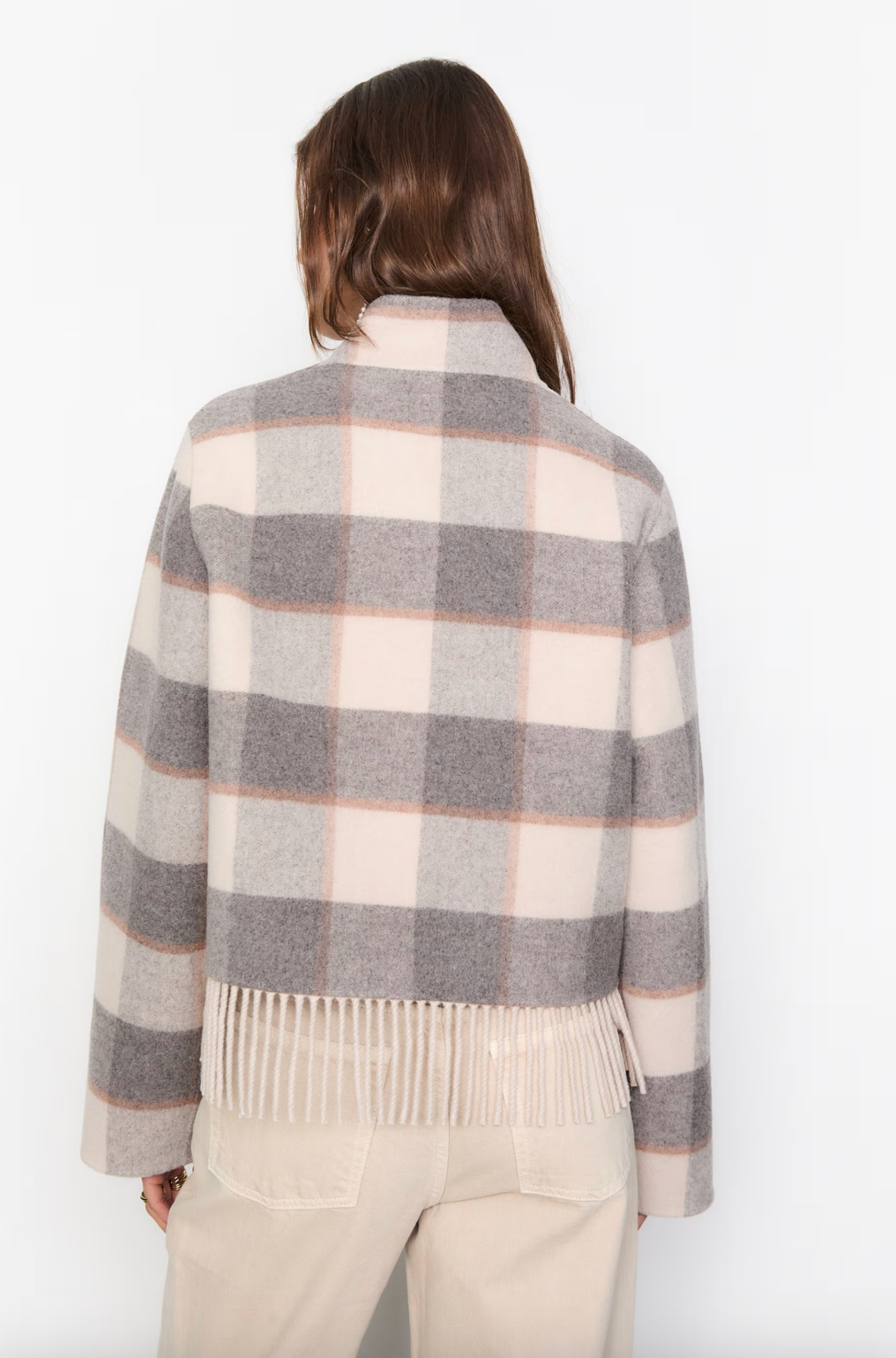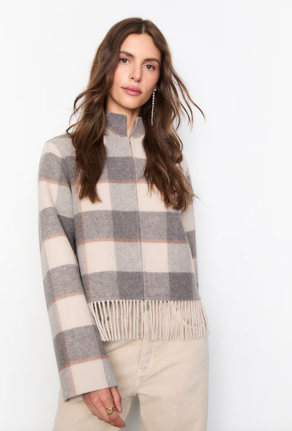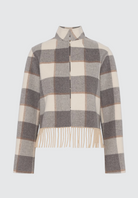 Beskrivelse: Edith-jakken er det perfekte plagget for lag-på-lag i overgangsperiodene. Laget av en varm ullblanding i et delikat kremfarget rutemønster, med en lett firkantet og rett passform, ståkrage, hempe- og krok-lukking foran, og frynser nederst på kanten.