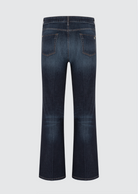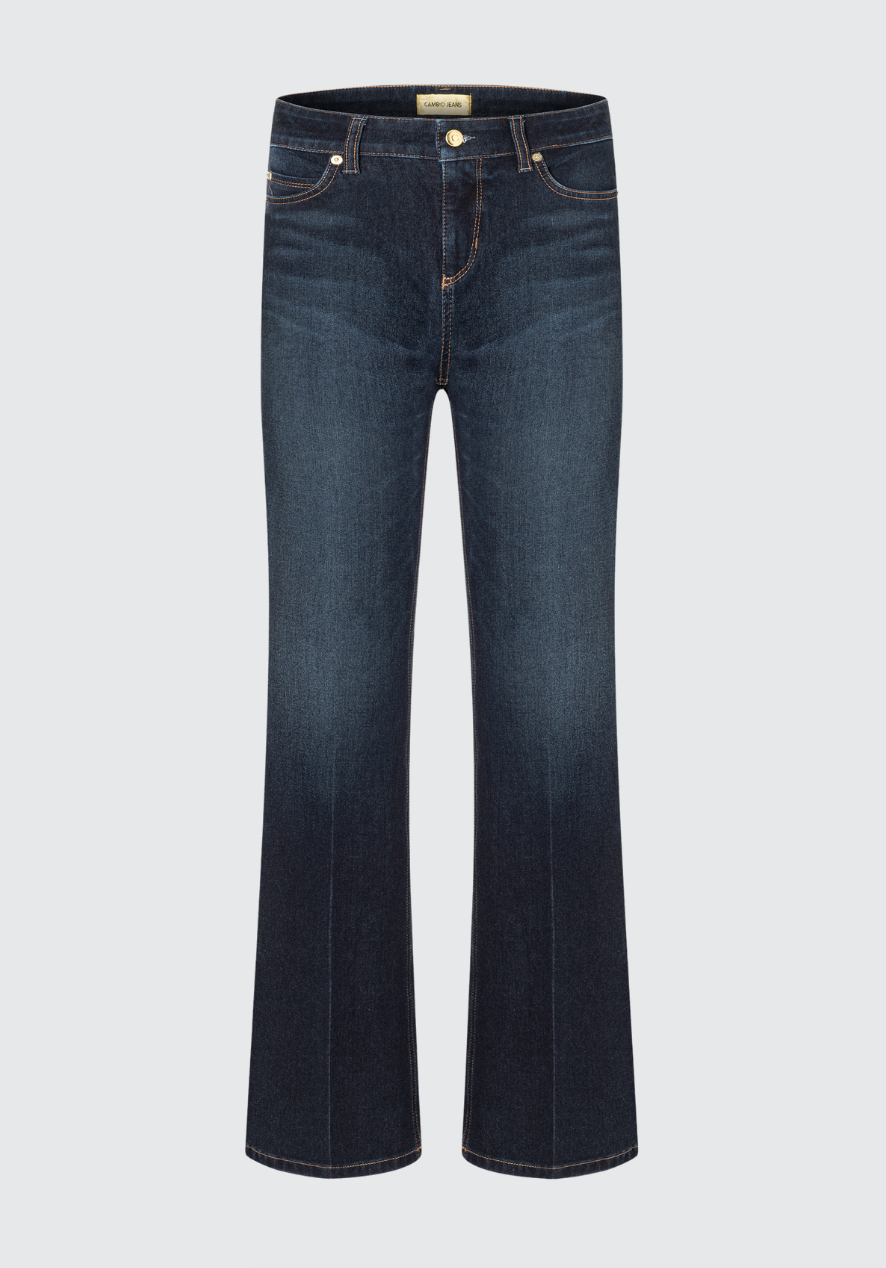 Beskrivelse: Supre mørkeblå jeans med gulhvite «stitches» som gir en jeansen et flott utrykk. Høy på livet og med en sleng nederst. Klassisk femlommer modell med meget god stretch som er normal i størrelsen.